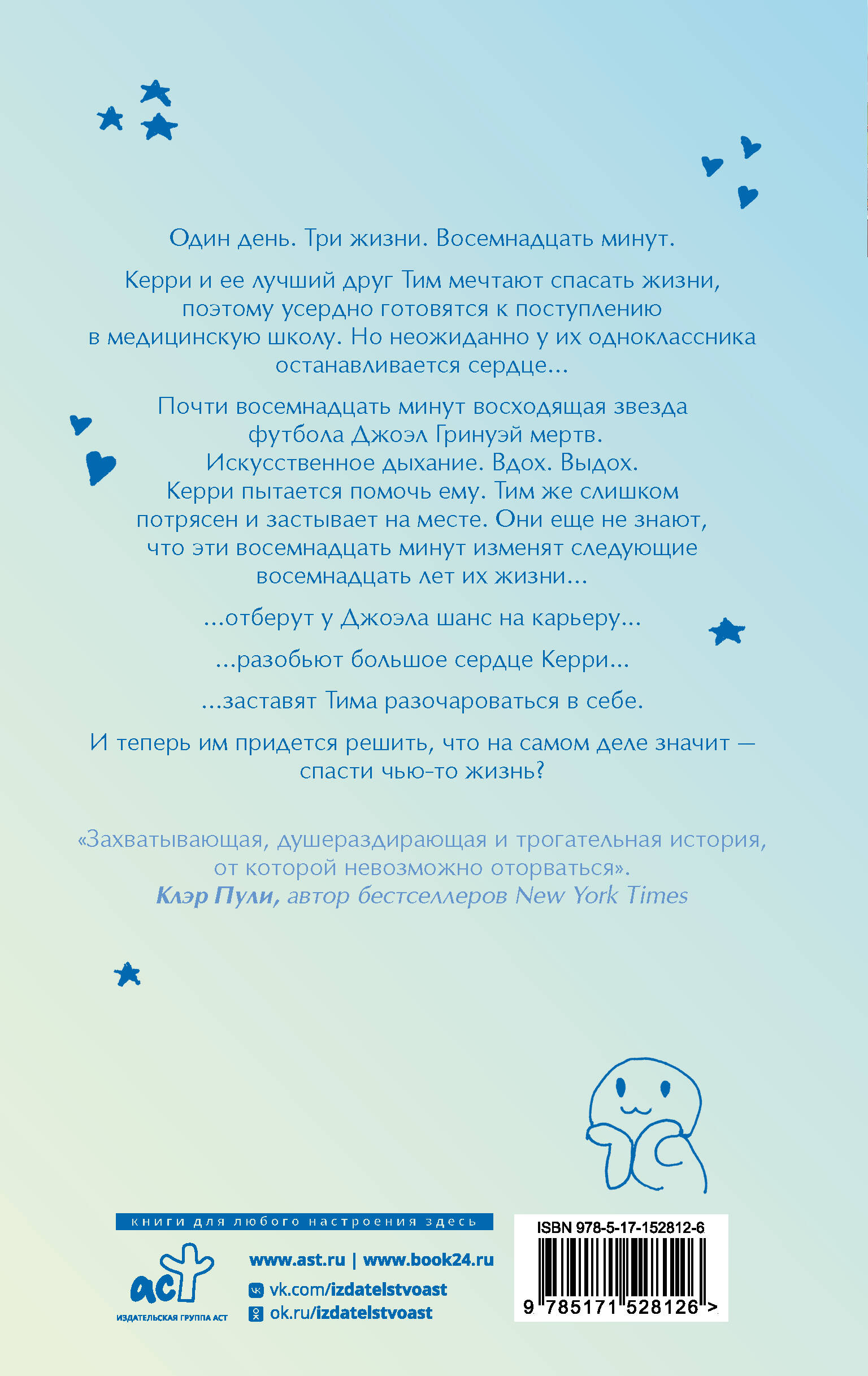 Один день. Три жизни. Восемнадцать минут. Керри и ее лучший друг Тим мечтают спасать жизни, поэтому усердно готовятся к поступлению в медицинскую школу. Но неожиданно у их одноклассника останавливается сердце… Почти восемнадцать минут восходящая звезда футбола Джоэл Гринуэй мертв. Искусственное дыхание. Вдох. Выдох. Керри пытается помочь ему. Тим же слишком потрясен и застывает на месте. Они еще не знают, что эти восемнадцать минут изменят следующие восемнадцать лет их жизни… …отберут у Джоэла шанс на карьеру... …разобьют большое сердце Керри... …заставят Тима разочароваться в себе. И теперь им придется решить, что на самом деле значит - спасти чью-то жизнь? "Захватывающая, душераздирающая и трогательная история, от которой невозможно оторваться". Клэр Пули, автор бестселлеров New York Times.| Издательство | Издательство "АСТ" |
