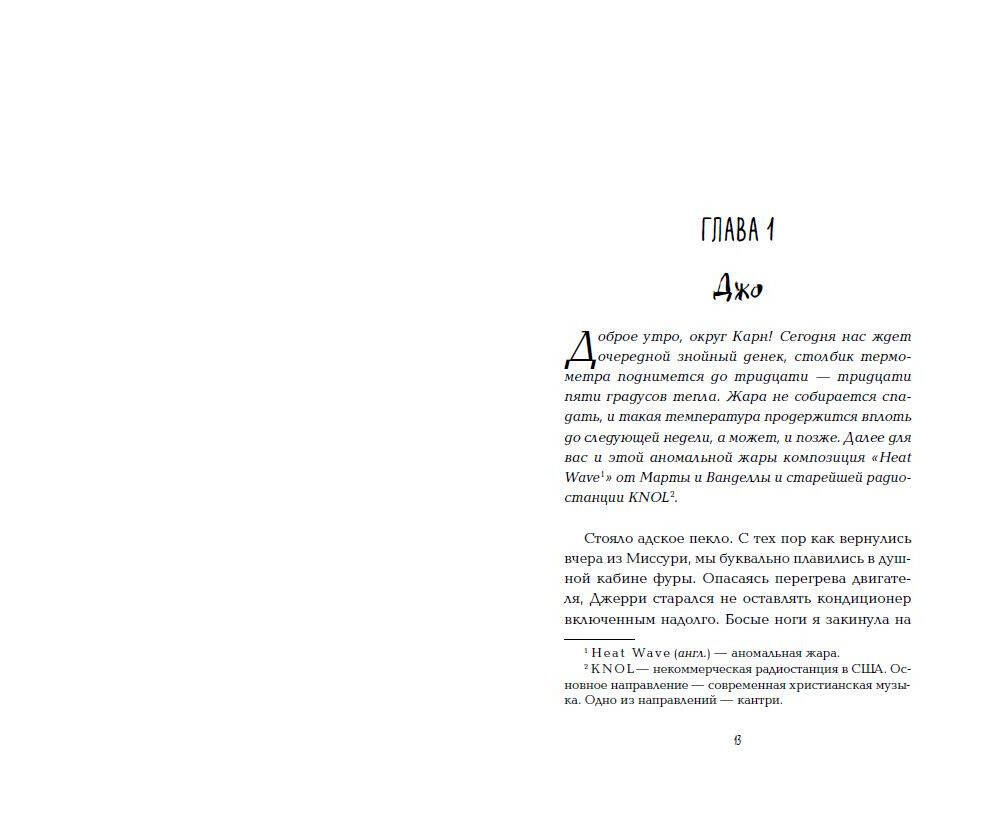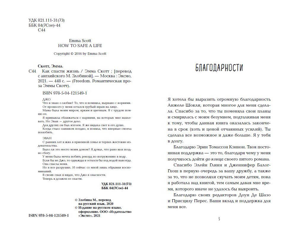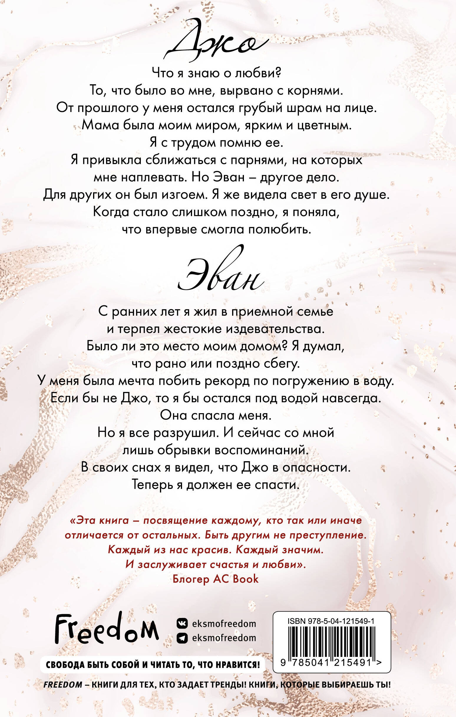 ДЖО Что я знаю о любви? То, что я помнила, вырвано с корнями. От прошлого у меня остался грубый шрам на лице. Мама была моим миром, ярким и цветным. Я с трудом помню ее. Я привыкла сближаться с парнями, на которых мне наплевать. Но Эван - другое дело. Для других он был изгоем. Я же видела свет в его душе. Когда стало слишком поздно, я поняла, что впервые смогла полюбить. ЭВАН С ранних лет я жил в приемной семье и терпел жестокие издевательства. Было ли это место моим домом? Я думал, что рано или поздно сбегу. У меня была мечта побить рекорд по погружению в воду. Если бы не Джо, то однажды я остался бы под водой навсегда. Она спасла меня. Но я все разрушил. И сейчас со мной лишь обрывки воспоминаний. В своих снах я видел, что Джо в опасности. Теперь я должен ее спасти. Имя Эммы Скотт стало синонимом качественной сентиментальной прозы для аудитории Young Adult. Эмма стала автором-открытием 2020 года, ее книги моментально становятся бестселлерами в России. Уже почти 90 тыс. экземпляров проданных романов! Ее истории любви окрыляют и вдохновляют на новую жизнь и вселяют надежду! Непростая, чувственная и глубокая история любви сквозь годы. Смогут ли девочка со шрамом на лице и сердце и мальчик, не любимый никем, вновь обрести себя и шанс на счастье? Роман был написан для каждого, кто хочет лучше понять себя и свои непростые чувства. В нем все: боль, горе, счастье, трагедия, страх, исцеление. К сожалению, среди нас есть те, кто подвергался насилию. У Джо эта травма до сих пор влияет на ее чувства и эмоции: она решила жить одним днем и теперь не верит в любовь. Каждый, кто так или иначе сталкивался с этим, смогут найти в книге бесценную поддержку. Эмма Скотт очень тонко и глубоко погружает читателя в переживания героев. У Эвана тоже непростая жизнь. Мальчик с детства рос в приемной семье и терпел издевательства от старших братьев. В школе все задирали его из-за психологических проблем и того, что он был не такой, как все. Книга учит принятию себя и доброму отношению к тем, кто рядом с нами. «Читая эту книгу, ты чувствуешь, как растешь вместе с героями и принимаешь то, что у всех есть свои особенности. Некоторые из них видны всему миру, а другие остаются внутри, оставляя шрамы, которые никто никогда не увидит. То, как Джо и Эван преодолевают свое горе и душевную боль, положительно очищает и наполняет душу». - Amazon.com| Издательство | ООО "Издательство "Эксмо" |
