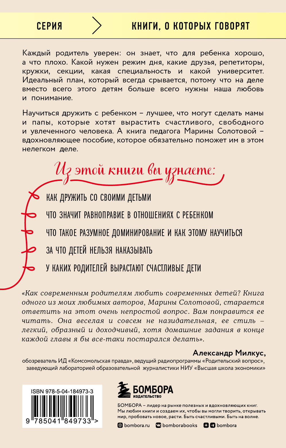 Давайте признаемся, все мы мечтаем вырастить идеальную дочь или идеального сына. Но воспитание - очень сложный процесс, при котором, с одной стороны, важно дать ребенку свободу, а с другой - определить четкие границы и дать ориентиры. К сожалению, никто не научил нас соблюдать золотую середину, не объяснил, как дружить со своими детьми, и потому мы то и дело совершаем ошибки. О том, как их избежать, рассказывает педагог Марина Солотова, чей опыт собран в этой книге в виде мудрых размышлений, реальных историй и практических заданий после каждой главы. Из этой книги вы узнаете: - Как дружить со своими детьми. - Что значит равноправие в отношениях с ребенком. - Что такое разумное доминирование и как этому научиться. - За что детей нельзя наказывать. - У каких родителей вырастают счастливые дети. Об авторе Марина Солотова - педагог, журналист, директор Центра эффективной педагогики, руководитель детского медиа-холдинга «Академия радости», член Национальной родительской ассоциации.| Издательство | ООО "Издательство "Эксмо" |