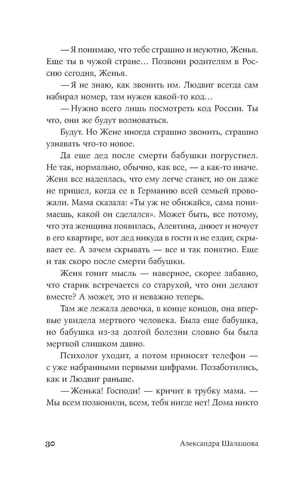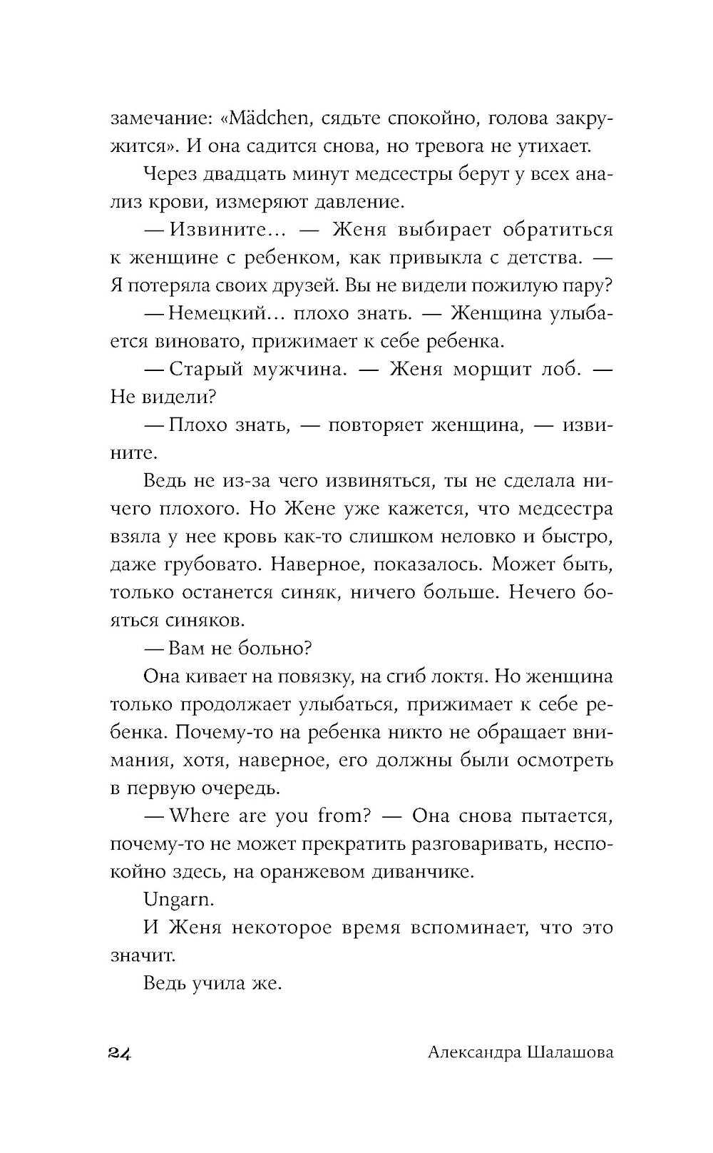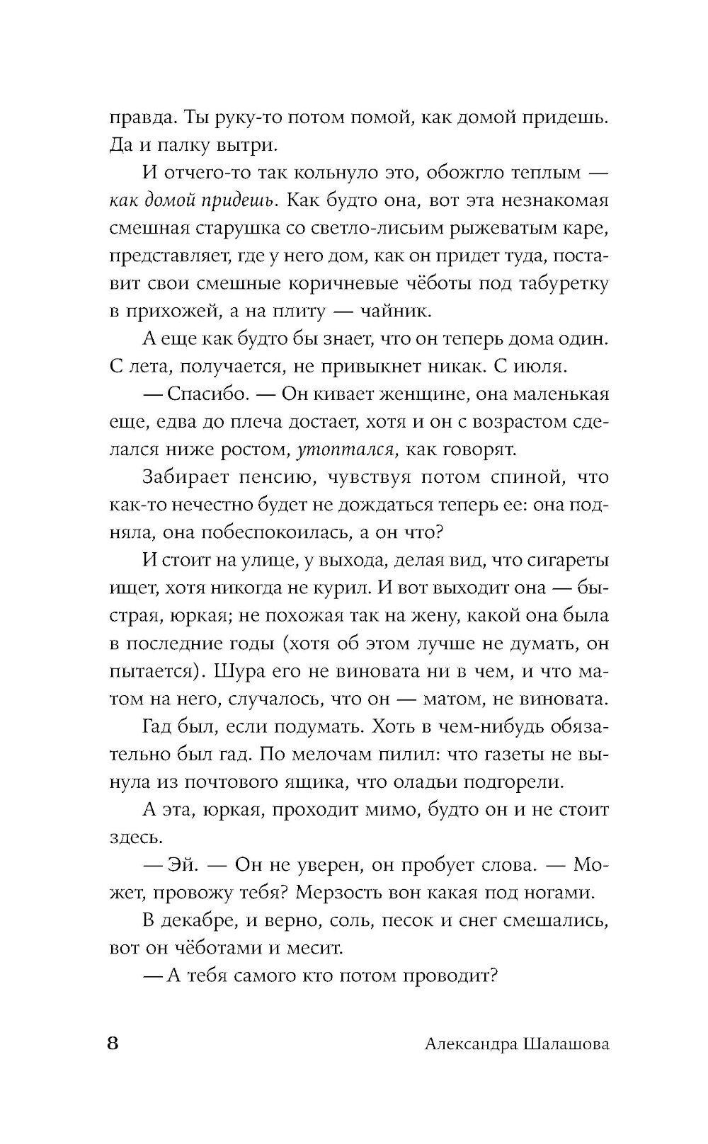 Он забывает слова, путает имена дочери и внучки. Может быть, это не так важно, а важно другое имя - имя девочки, которую он встретил в Германии в 1941 году, а потом безвозвратно утратил. Блуждая в лабиринтах памяти, он пытается снова найти ее - и себя. Он всматривается в старые фотографии, на которых его родной Великий Новгород, небо и деревья. Однажды он уходит из дома, продолжая фотографировать, потому что только это помогает как-то удержаться в ускользающей реальности. Его ищет внучка - у них большое путешествие, одно на двоих. Новый роман Александры Шалашовой - пронзительное размышление о любви к трем женщинам, о том, как в сумраке подступающей деменции остаться собой. Ведь ты - это ты, пока даже в полной темноте помнишь, как тебя зовут.