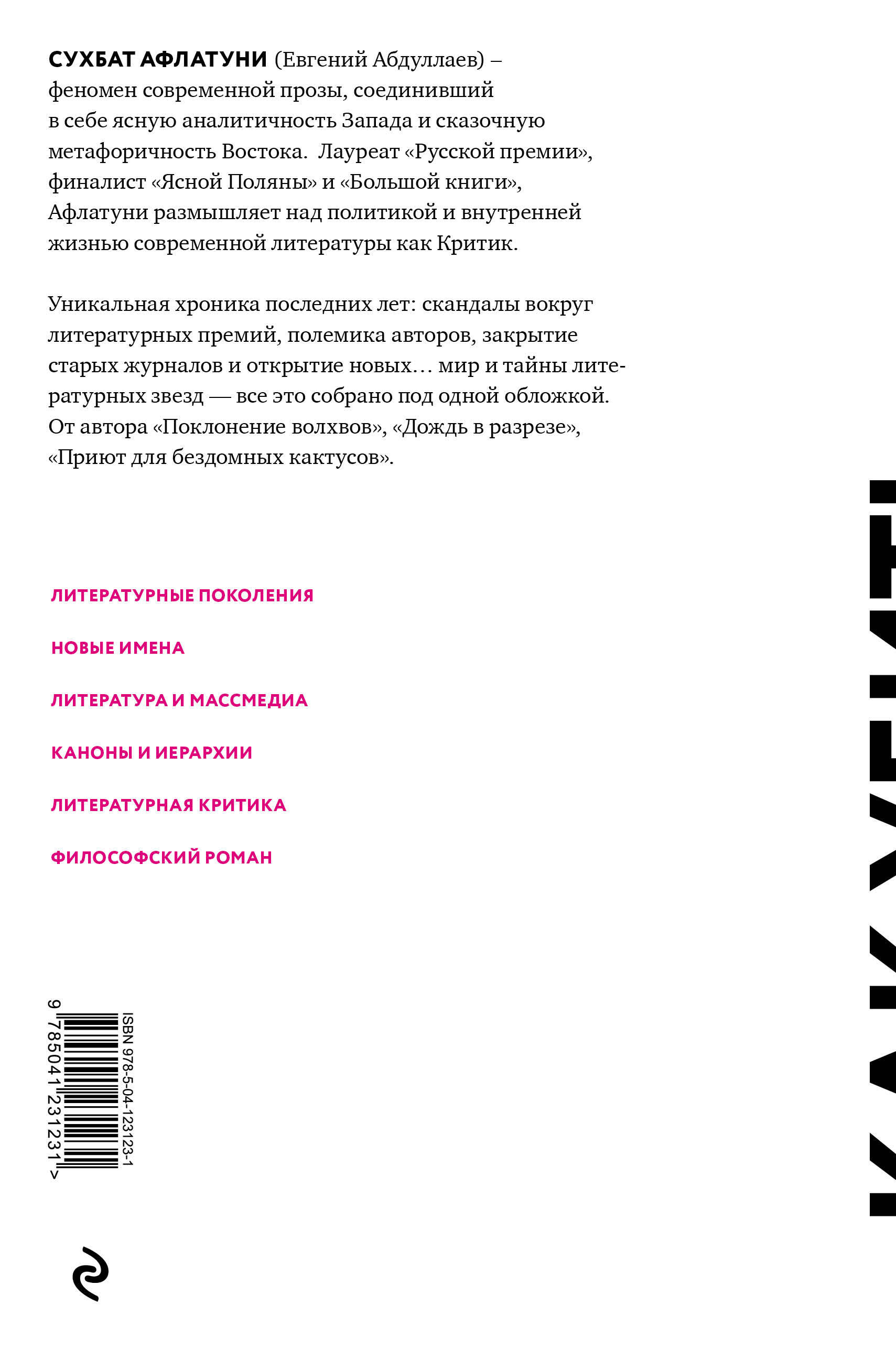 Сухбат Афлатуни - феномен современной прозы, соединивший в себе ясную аналитичность Запада и сказочную метафоричность Востока. Лауреат «Русской премии», финалист «Ясной поляны» и «Большой книги», Афлатуни размышляет над политикой и внутренней жизнью современной литературы как Критик. Уникальная хроника последних лет: скандалы вокруг литературных премий, полемика авторов, закрытие старых журналов и открытие новых… мир и тайны литературных звезд, все это собрано под одной обложкой. От автора произведений «Поклонение волхвов», «Дождь в разрезе», «Приют для бездомных кактусов».