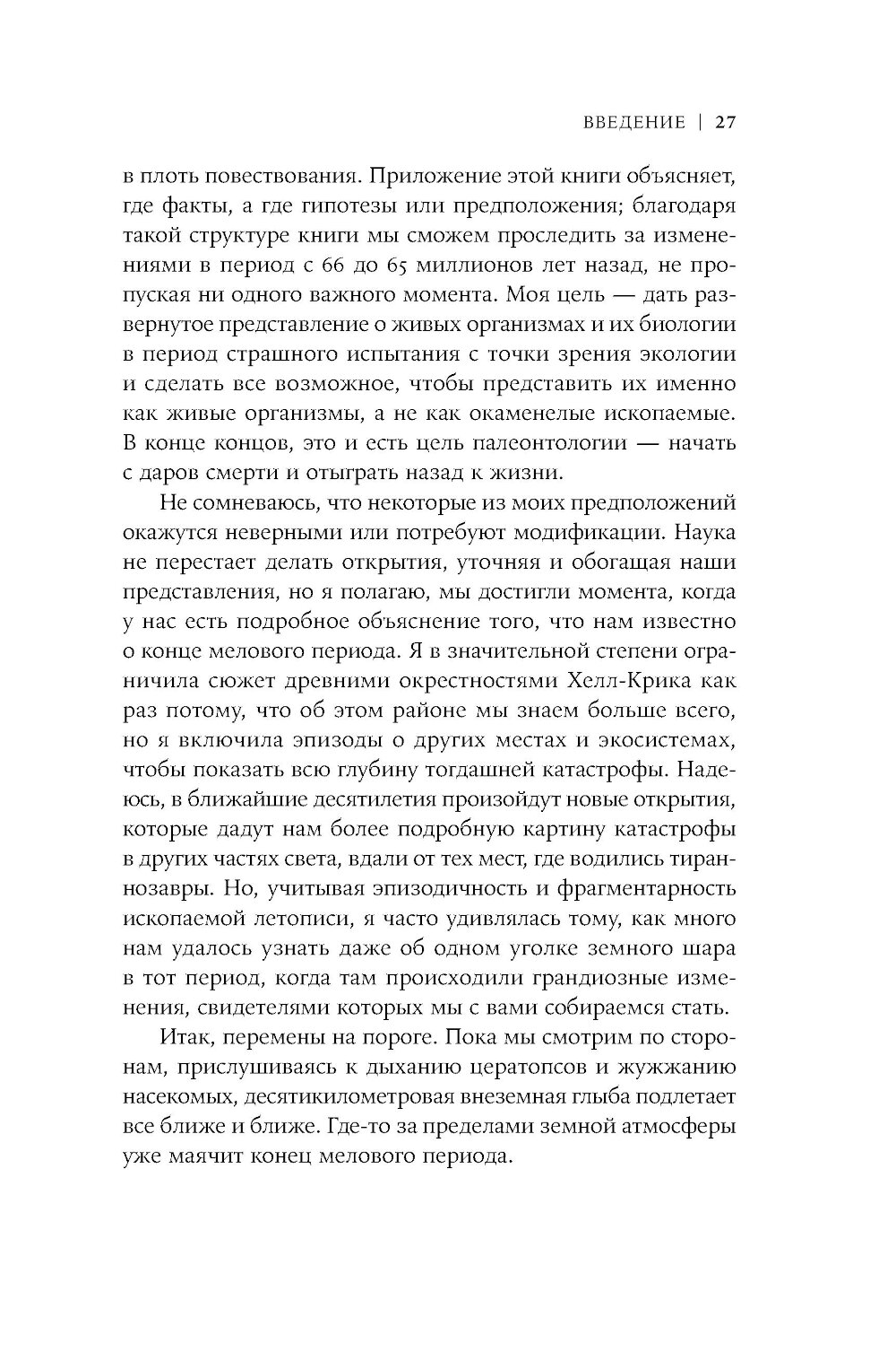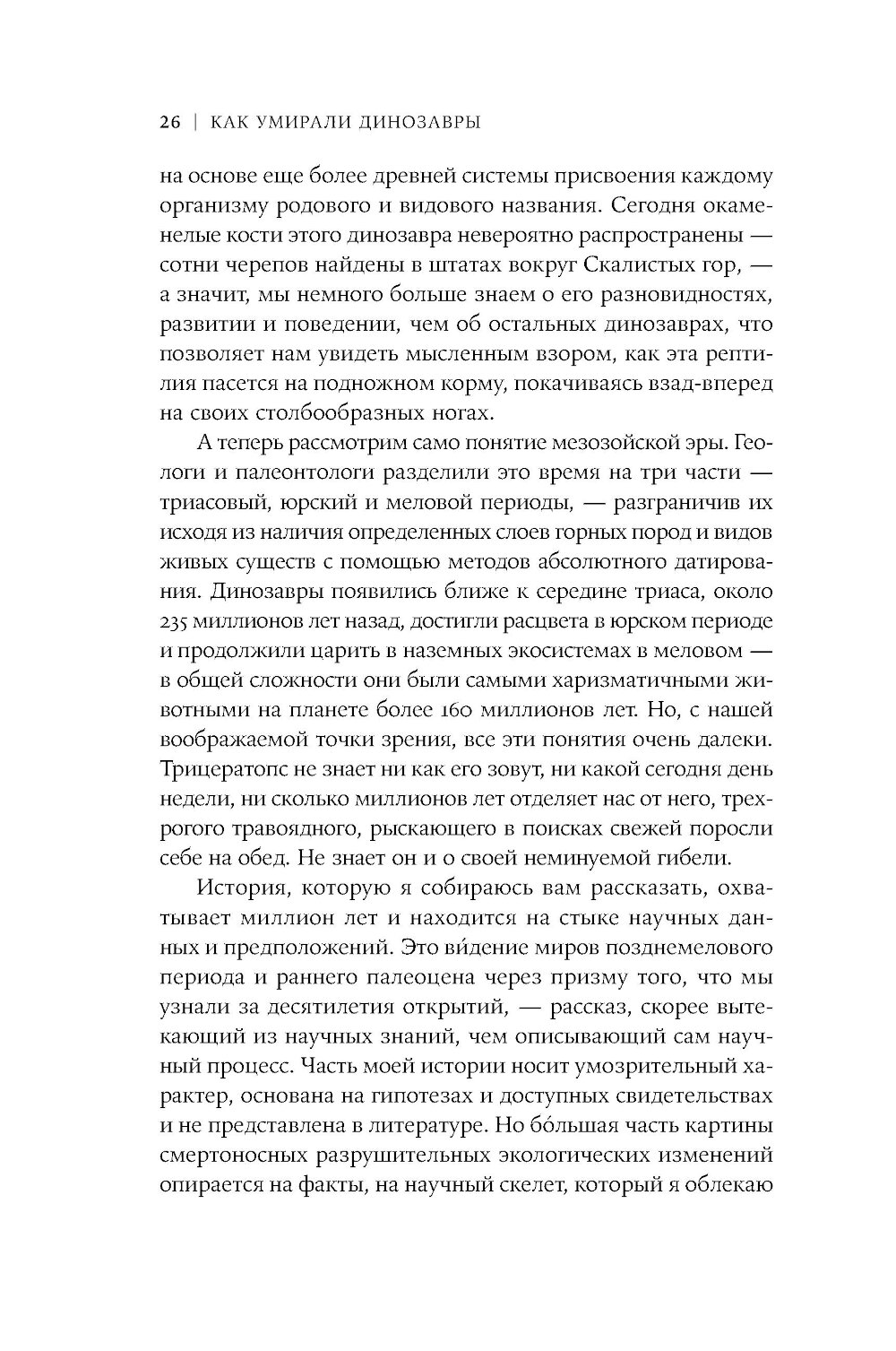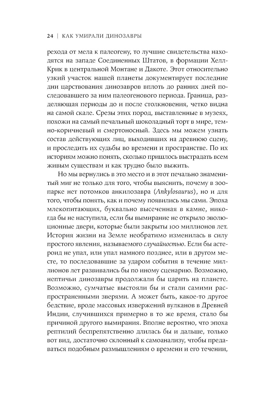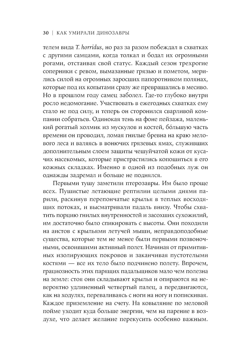 «Как умирали динозавры: Убийственный астероид и рождение нового мира» Эта книга уникальна. Райли Блэк воспроизводит картину событий массового вымирания мелового периода на примерах конкретных животных так, словно присутствовала там и тогда сама. Все начинается в преддверии катастрофы, а затем, глава за главой, мы следуем по пути героев Райли Блэк в разные дни их жизни: через час, через день, месяц, год, столетие, вплоть до миллиона лет после столкновения нашей планеты с астероидом. Пока на Землю надвигается конец света, мы узнаем, как мучается от раковой опухоли трицератопс, как трудно прокормить свое огромное тело тираннозавру рекс и как опасен этот мир для едва вылупившегося из яйца и брошенного мамой аламозавра. Но самое страшное - и самое интересное - впереди. Чтобы не отвлекать читателя от сюжета, в конце книги Блэк дает обширное приложение с комментариями, поясняющими, какие из описаний соответствуют научным фактам, а что в портретах и биографиях героев домыслено. Впрочем, наука не стоит на месте, и вполне вероятно, что сегодняшние гипотетические построения автора завтра найдут подтверждения.