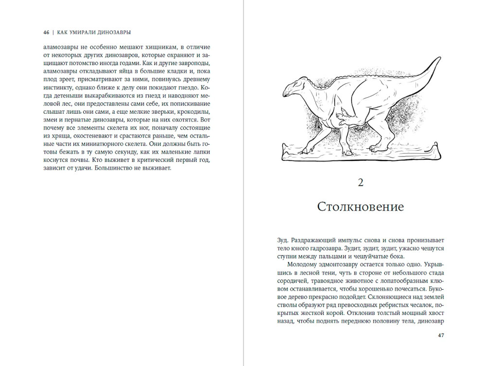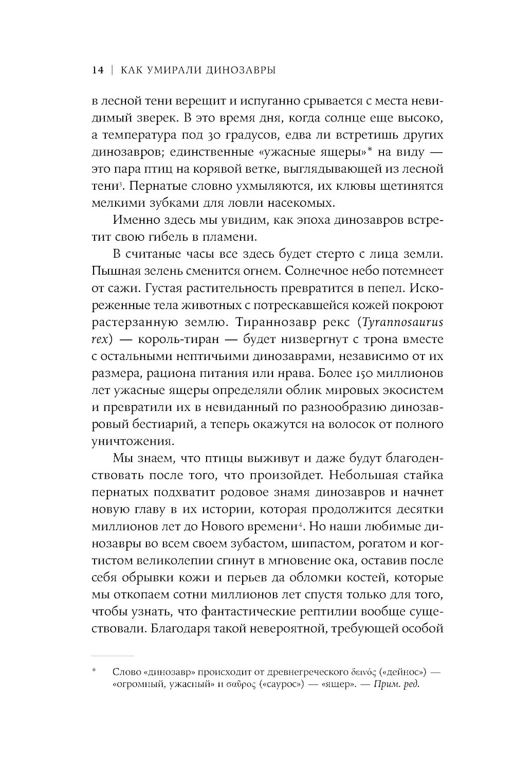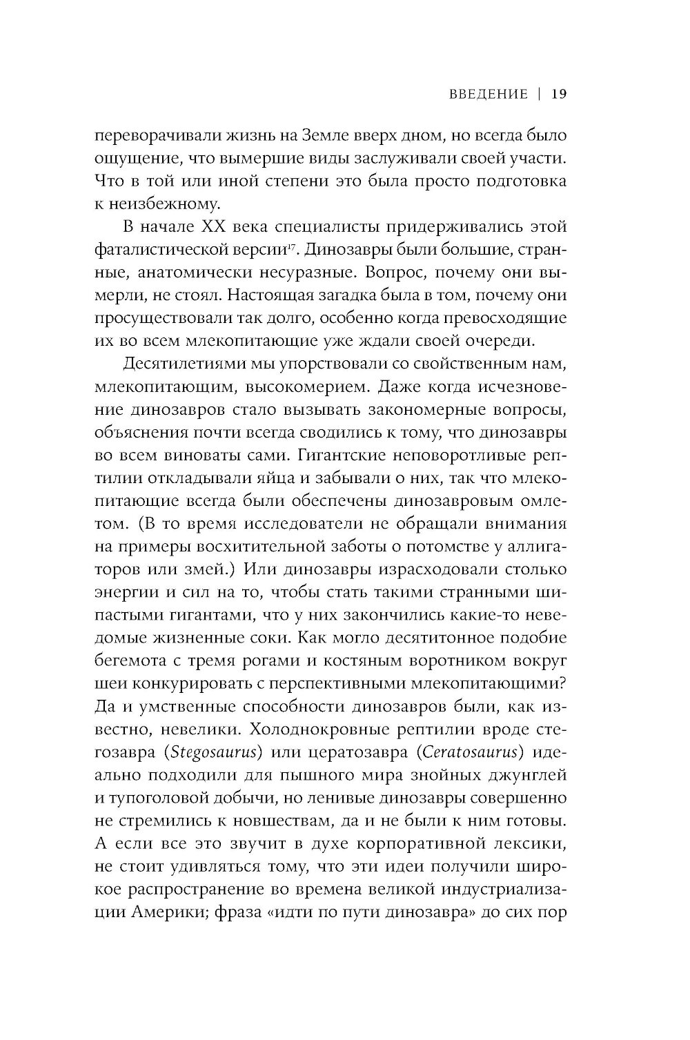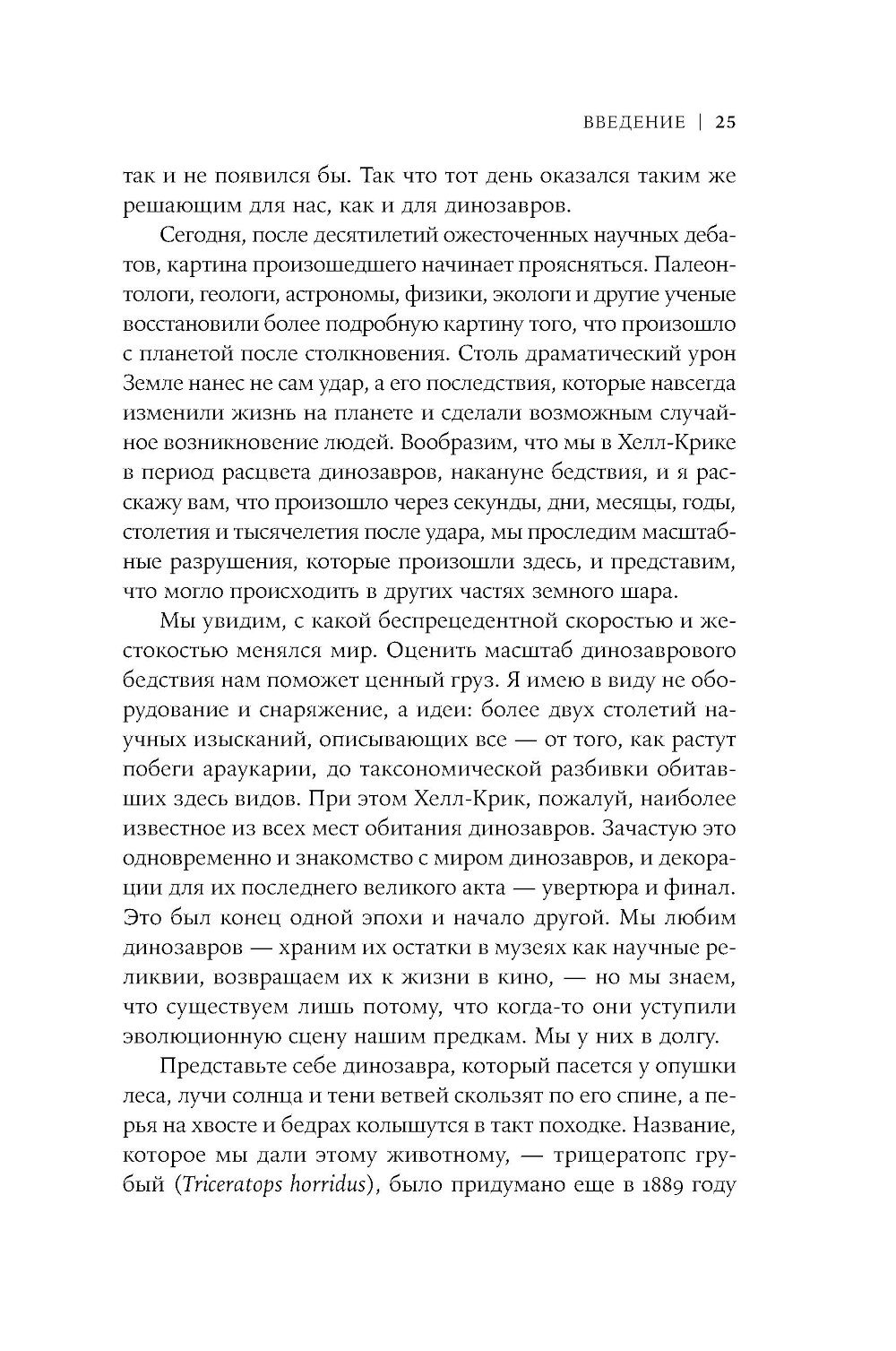 «Как умирали динозавры: Убийственный астероид и рождение нового мира» Эта книга уникальна. Райли Блэк воспроизводит картину событий массового вымирания мелового периода на примерах конкретных животных так, словно присутствовала там и тогда сама. Все начинается в преддверии катастрофы, а затем, глава за главой, мы следуем по пути героев Райли Блэк в разные дни их жизни: через час, через день, месяц, год, столетие, вплоть до миллиона лет после столкновения нашей планеты с астероидом. Пока на Землю надвигается конец света, мы узнаем, как мучается от раковой опухоли трицератопс, как трудно прокормить свое огромное тело тираннозавру рекс и как опасен этот мир для едва вылупившегося из яйца и брошенного мамой аламозавра. Но самое страшное - и самое интересное - впереди. Чтобы не отвлекать читателя от сюжета, в конце книги Блэк дает обширное приложение с комментариями, поясняющими, какие из описаний соответствуют научным фактам, а что в портретах и биографиях героев домыслено. Впрочем, наука не стоит на месте, и вполне вероятно, что сегодняшние гипотетические построения автора завтра найдут подтверждения.