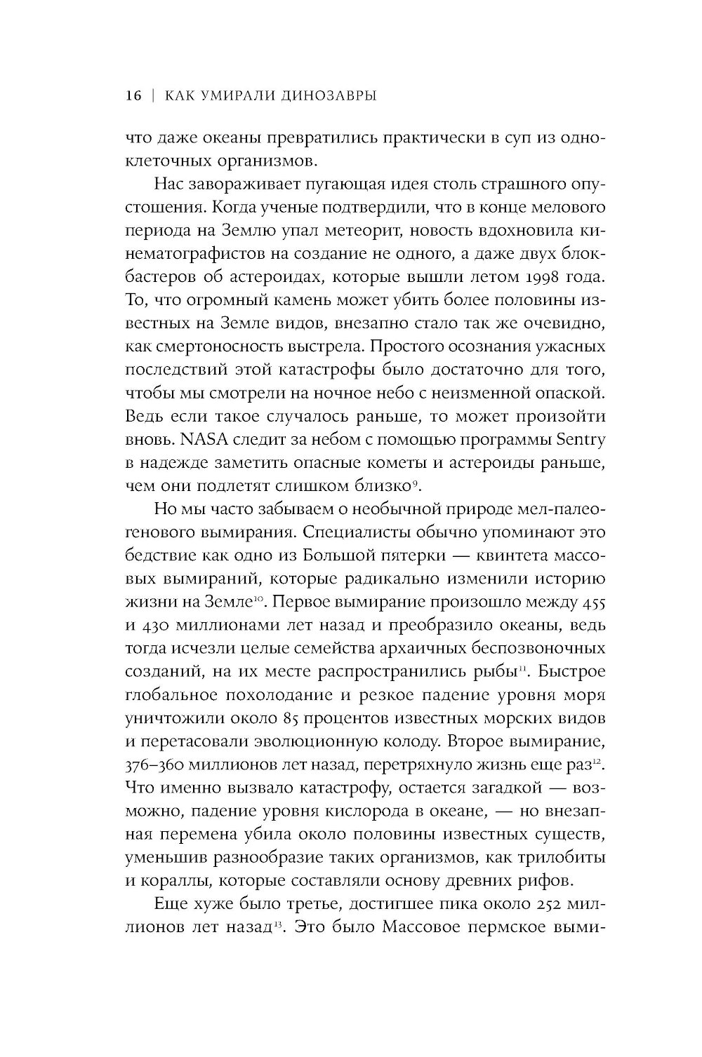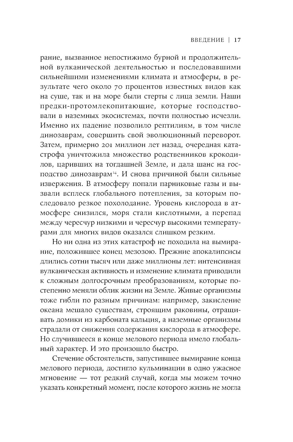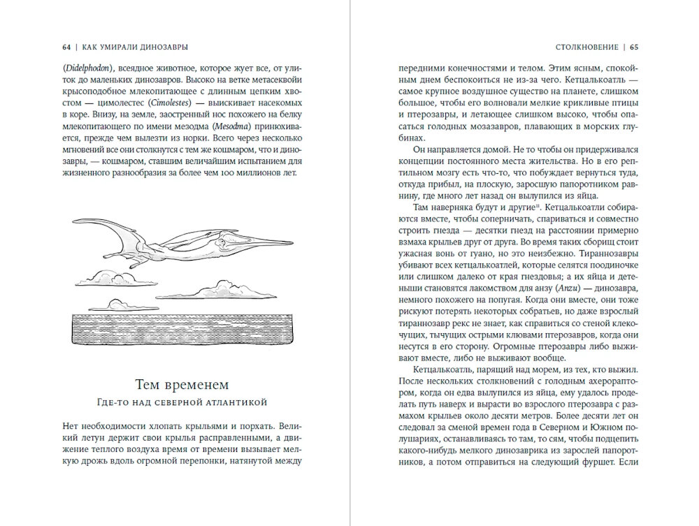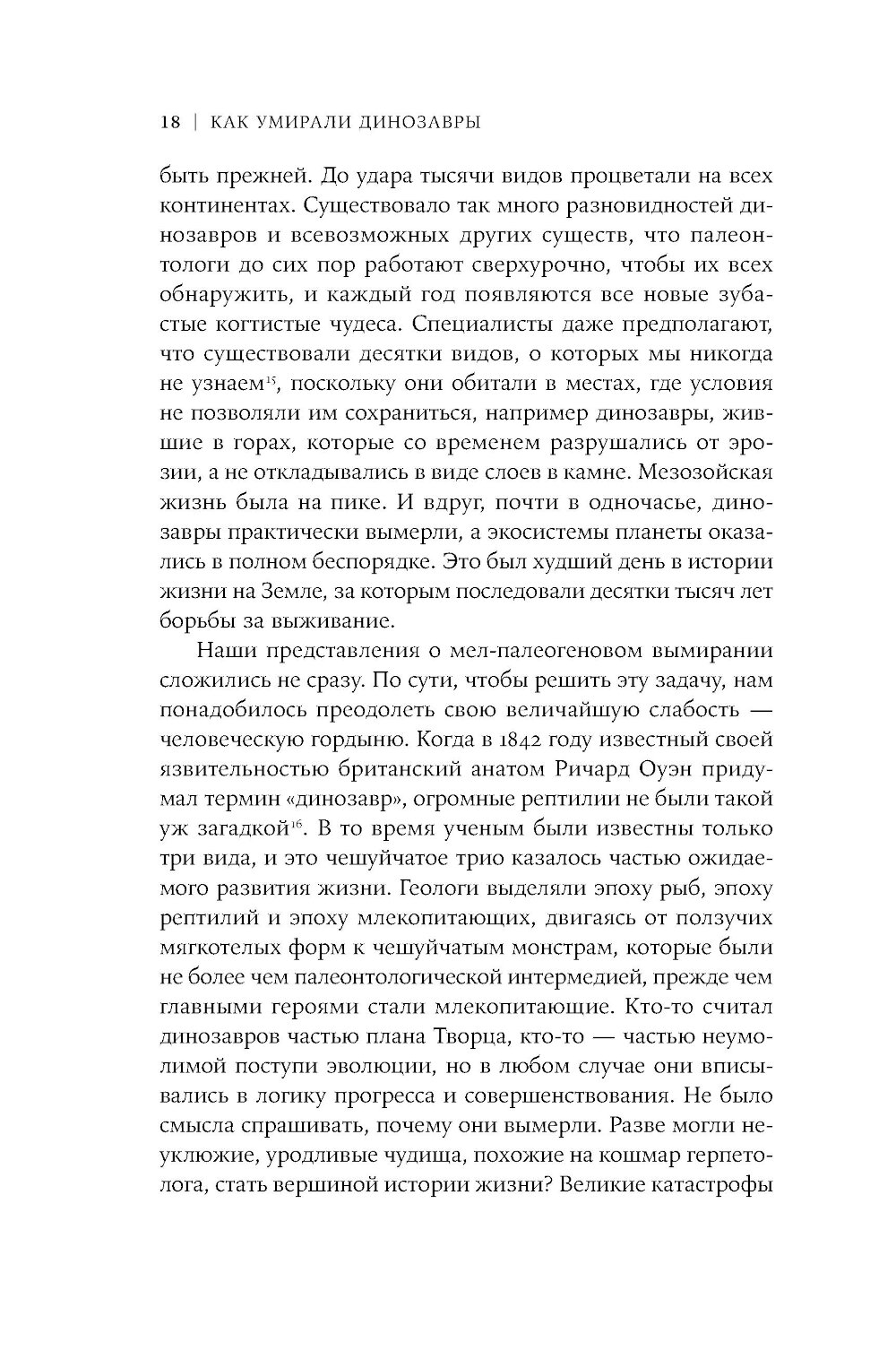 «Как умирали динозавры: Убийственный астероид и рождение нового мира» Эта книга уникальна. Райли Блэк воспроизводит картину событий массового вымирания мелового периода на примерах конкретных животных так, словно присутствовала там и тогда сама. Все начинается в преддверии катастрофы, а затем, глава за главой, мы следуем по пути героев Райли Блэк в разные дни их жизни: через час, через день, месяц, год, столетие, вплоть до миллиона лет после столкновения нашей планеты с астероидом. Пока на Землю надвигается конец света, мы узнаем, как мучается от раковой опухоли трицератопс, как трудно прокормить свое огромное тело тираннозавру рекс и как опасен этот мир для едва вылупившегося из яйца и брошенного мамой аламозавра. Но самое страшное - и самое интересное - впереди. Чтобы не отвлекать читателя от сюжета, в конце книги Блэк дает обширное приложение с комментариями, поясняющими, какие из описаний соответствуют научным фактам, а что в портретах и биографиях героев домыслено. Впрочем, наука не стоит на месте, и вполне вероятно, что сегодняшние гипотетические построения автора завтра найдут подтверждения.