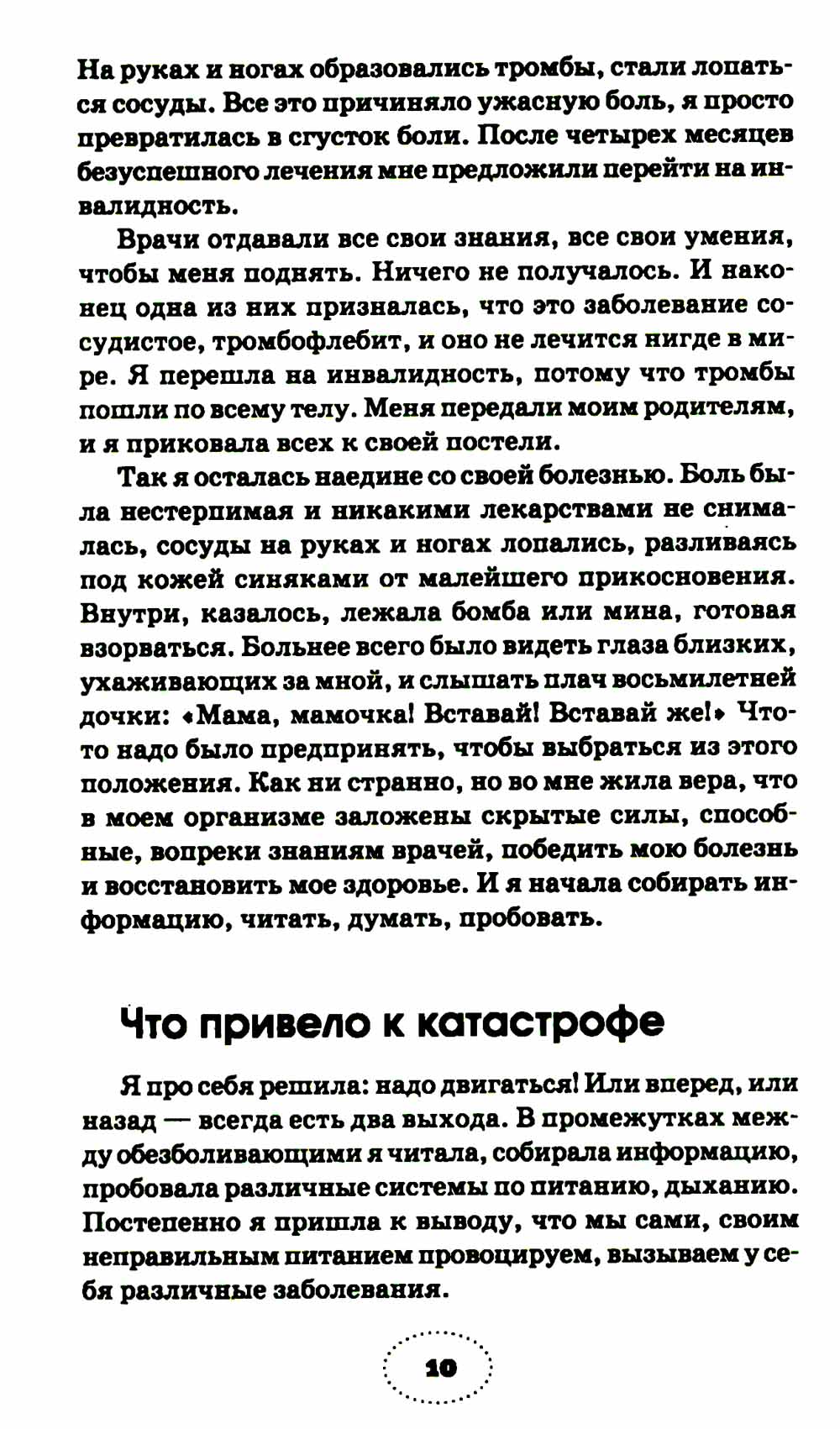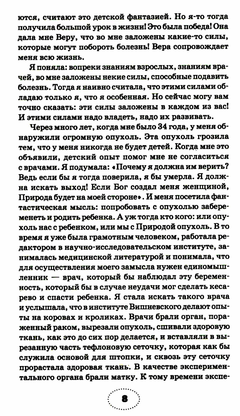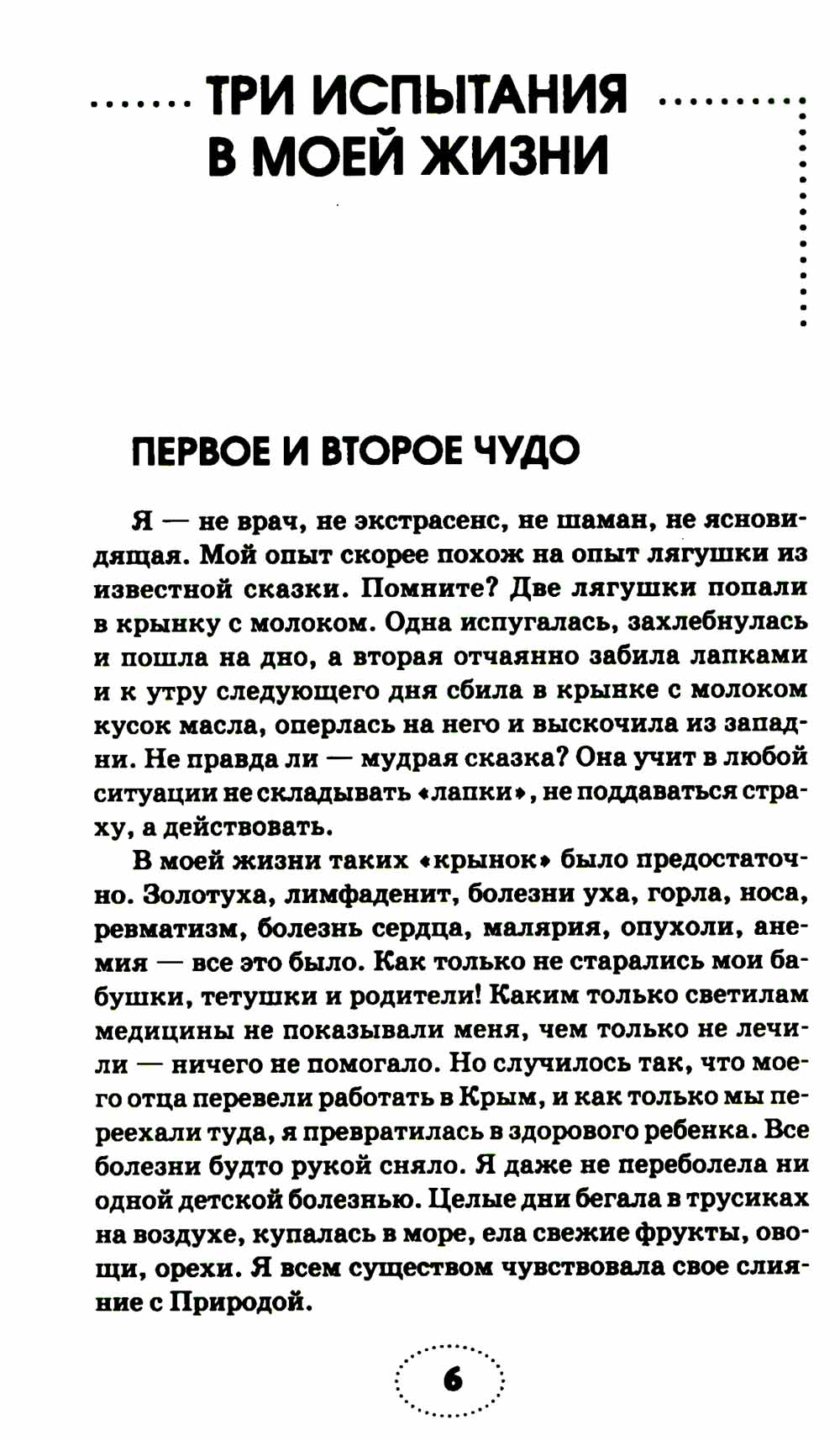 Перед вами очень личная книга - исповедь человека, который прошел через тяжелые испытания, через болезнь, через рак. Но это не рассказ о недугах и страдании, это личная программа выздоровления, которую создала и на себе опробовала Майя Гогулан. Майя Федоровна рассказывает об опыте собственного излечения по Системе здоровья Ниши. Снова и снова она повторяет: «Рак - болезнь невежества!» - и показывает, какие привычные для нас нормы питания, образа жизни приводят к болезни. В книге вы найдете подробное описание системы, которая помогла Майе Гогулан: рецепты, правила, упражнения - все, что может помочь и вам в борьбе с болезнями (не только с раком). Вы также найдете здесь мощный настрой на здоровье - слова Майи Федоровны, которые вселяют уверенность в то, что все в наших руках.