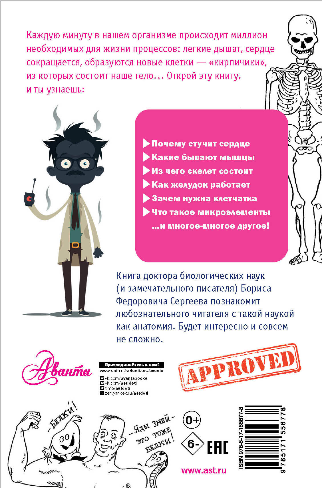 Книга доктора биологических наук Бориса Федоровича Сергеева познакомит читателей с такой наукой как анатомия, расскажет, как устроен человеческий организм, и ответит на самые разные вопросы: отдыхает ли сердце, как мы видим и слышим, что такое красные и белые мышцы, зачем нужны микроэлементы… Для среднего школьного возраста.| Издательство | ИЗДАТЕЛЬСТВО "АСТ" |