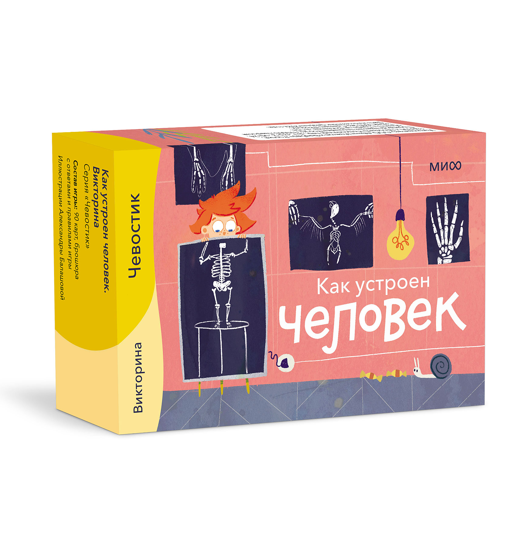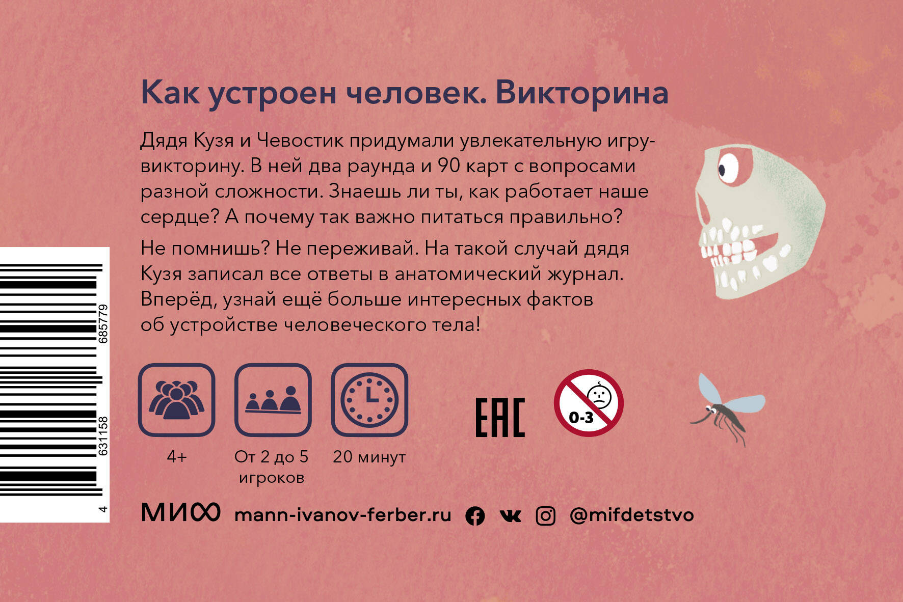 Чевостик изучил все-все книги о человеке и его теле. Как же хочется поделиться новыми знаниями с друзьями... У дяди Кузи как раз есть отличная идея: он придумал увлекательную игру-викторину! В ней два раунда, и в свой ход нужно выбрать одну из карт, зная только тип вопроса и его сложность. Не уверен, что ответил правильно? Не переживай, на каждой карточке есть ответ. А ещё дядя Кузя написал заметки, где собрал более подробные ответы на вопросы и самые интересные факты об устройстве человеческого тела и его здоровье. Знаешь ли ты, как работает наше сердце? А почему так важно питаться сбалансировано? Вперёд, зарабатывай очки и получай новые знания! Как играть в эту игру: Ведущий выкладывает перед участниками колоды карт рубашкой вверх. Игрок выбирает тип вопроса, а ведущий зачитывает его вслух. Если игрок отвечает правильно, то получает карту. Если нет, на вопрос могут ответить другие игроки. Если кто-то ответил правильно, он получает карту. Если нет - карта отправляется в сброс. В конце игры подсчитываются очки. Выигрывает тот, кто набрал больше всех очков. Состав игры: 90 карт с вопросами: 60 карт для первого раунда, 30 карт для второго раунда. Брошюра с ответами и правилами игры. Для кого эта книга: Для детей от 4 лет, которые интересуются анатомией. Для детей и взрослых, которые хотят весело провести досуг. Для всех поклонников Чевостика.