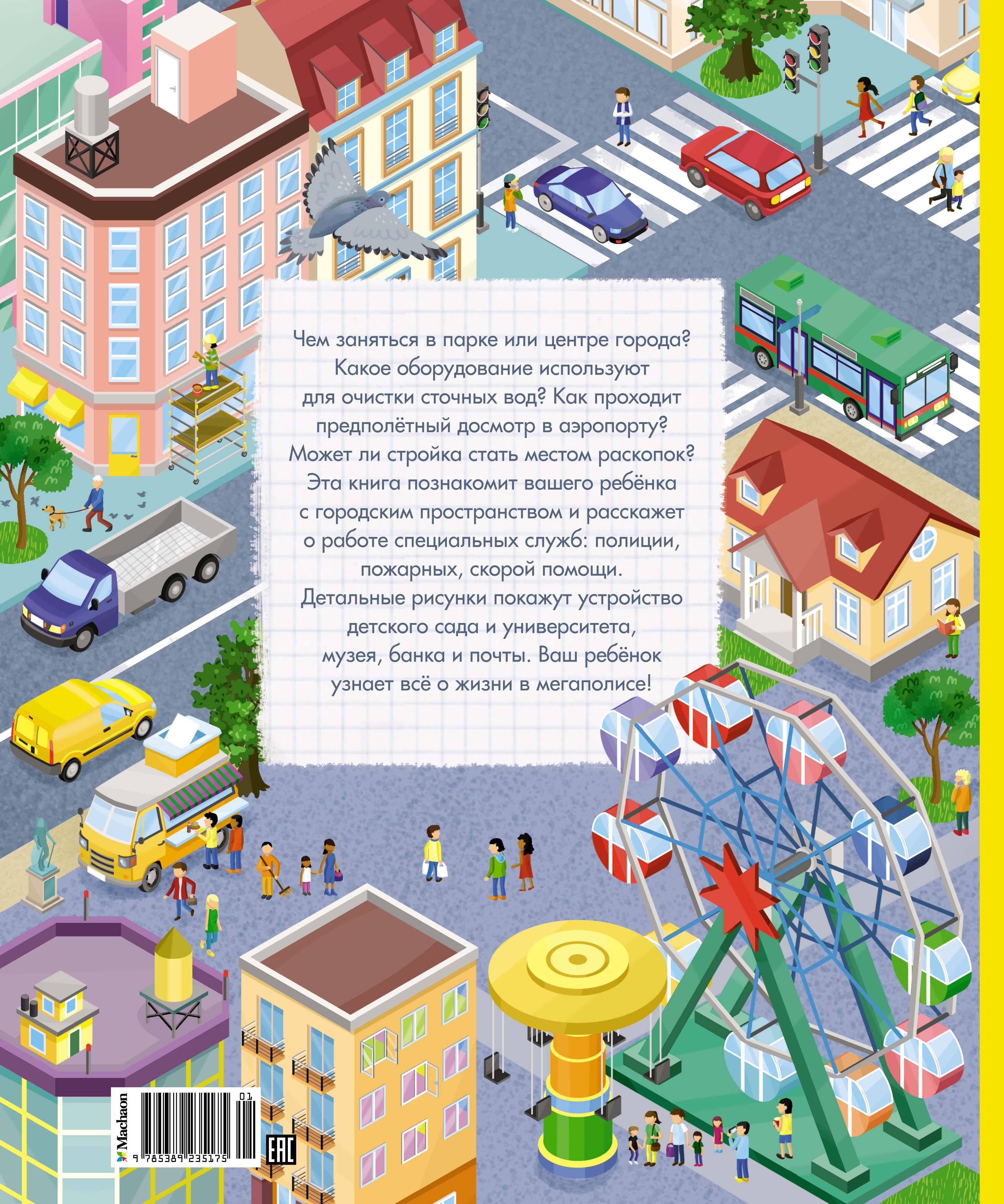 Чем заняться в парке или центре города? Какое оборудование используют для очистки сточных вод? Как проходит предполётный досмотр в аэропорту? Может ли стройка стать местом раскопок? Эта книга познакомит вашего ребёнка с городским пространством и расскажет о работе специальных служб: полиции, пожарных, скорой помощи. Детальные рисунки покажут устройство детского сада и университета, музея, банка и почты. Ваш ребёнок узнает всё о жизни в мегаполисе!| Издательство | Азбука-Аттикус Издат.группа ООО |