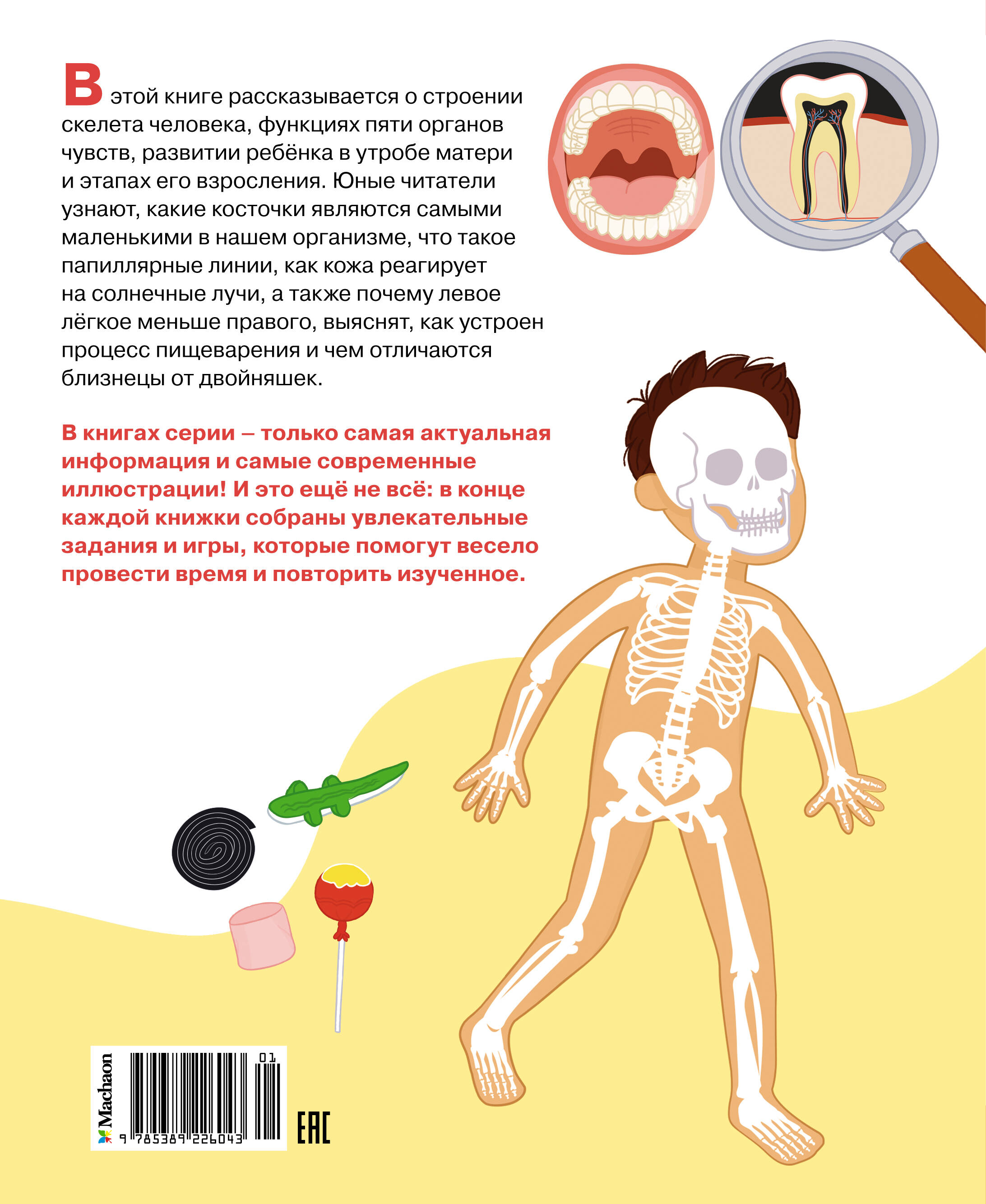 В этой книге рассказывается о строении скелета человека, функциях пяти органов чувств, развитии ребёнка в утробе матери и этапах его взросления. Юные читатели узнают, какие косточки являются самыми маленькими в нашем организме, что такое папиллярные линии, как кожа реагирует на солнечные лучи, а также почему левое лёгкое меньше правого, выяснят, как устроен процесс пищеварения и чем отличаются близнецы от двойняшек. В книгах серии - только самая актуальная информация и самые современные иллюстрации! И это ещё не всё: в конце каждой книжки собраны увлекательные задания и игры, которые помогут весело провести время и повторить изученное.| Издательство | Азбука-Аттикус Издат.группа ООО |