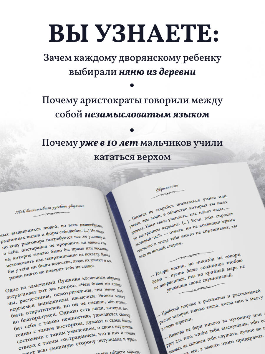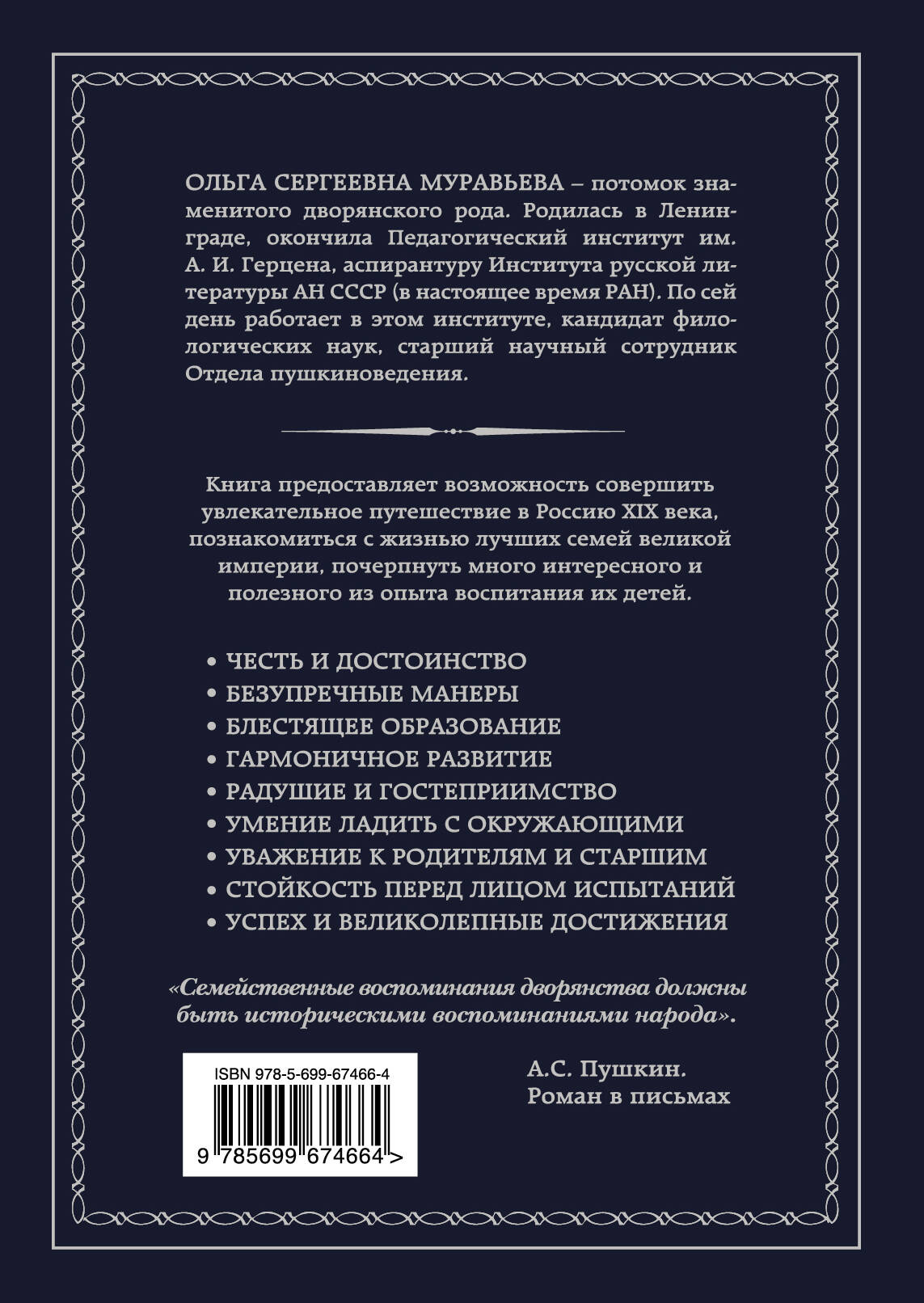 «Истинно светский человек был любезным, снисходительным и непринужденным; он избегал и назидательности, и запальчивости; не утомлял собеседников обстоятельными рассказами и умел найти интересную для них тему». Если вам не чужды понятия долг, честь, идеал и вам бы хотелось воспитать детей, взяв лучшее из традиций воспитания российской аристократии, то пришло время обратиться к книге потомка знаменитого дворянского рода, ученого-филолога Ольги Сергеевны Муравьевой. Из этой книги вы узнаете: - как высокий интеллект и душевная тонкость уживались с бесстрашием и твердостью духа русского дворянина; - блестящие успехи на военном или служебном поприще сочетались с кристальной честностью и благородством; - как мужчины, так и женщины проявляли редкую способность ладить с окружающими, сохранять достоинство в любой ситуации, быть мужественными и стойкими перед лицом испытаний. В книге много увлекательных выдержек из мемуаров, писем, дневников дворян позапрошлого столетия, которые помогают лучше понять, как привитые им в детстве принципы реализовывались в реальной жизни, несмотря на любые разочарования и невзгоды.| Издательство | ООО "Издательство "Эксмо" |