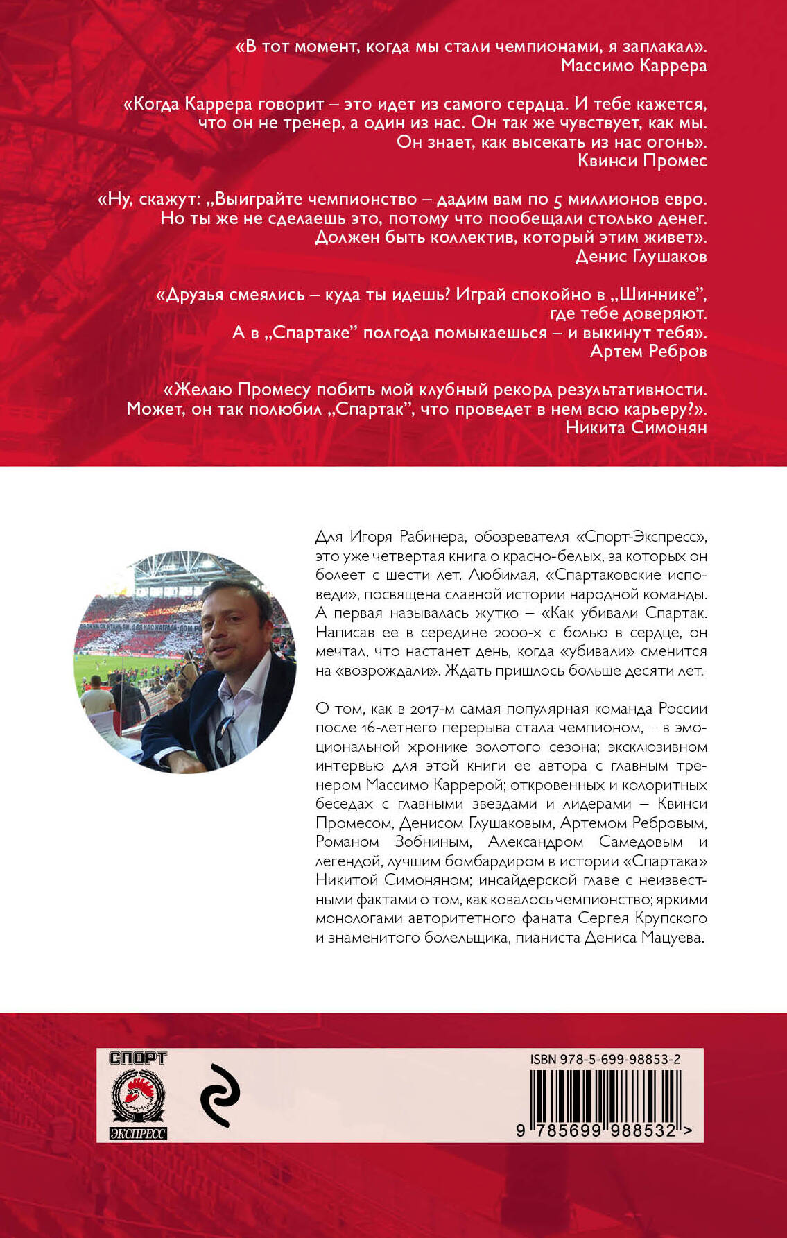 Об авторе: Игорь Рабинер - популярный спортивный журналист, обозреватель «Спорт-Экспресса», писатель, руководитель и педагог Школы спортивной журналистики Александра Шмурнова и Игоря Рабинера". Жанр: спорт, биография О книге: «Как возрождали Спартак: откровения Массимо Карреры и игроков. Хроника золотого сезона» - такая же долгожданная книга, как и чемпионский титул, завоеванный легендарной и всенародно любимой командой «Спартак» в 2017 году. Эта книга - подробная хроника чемпионского года, его инсайды, рассказы ее главного тренера Массимо Карреры, популярных игроков Квинси Промеса, Дениса Глушакова, Артема Реброва, Романа Зобнина, Александра Самедова и других. Автор и действующие лица честно и открыто говорят о кадровых перестановках, о взаимоотношениях в команде, о проблемах и сложностях, которые более полутора десятилетий лет не позволяли клубу завоевывать победные трофеи, и о том, что же позволило красно-белым вновь стать чемпионами. Особенности: Один самых выдающихся сезонов в спартаковской истории, ярко описанный одним из самых известных спортивных журналистов России, останется у болельщика красно-белых не только в памяти (откуда со временем многое стирается), но и на книжной полке. И он всегда сможет перечитать самые вдохновляющие моменты, чтобы поднять себе настроение| Издательство | ООО "Издательство "Эксмо" |