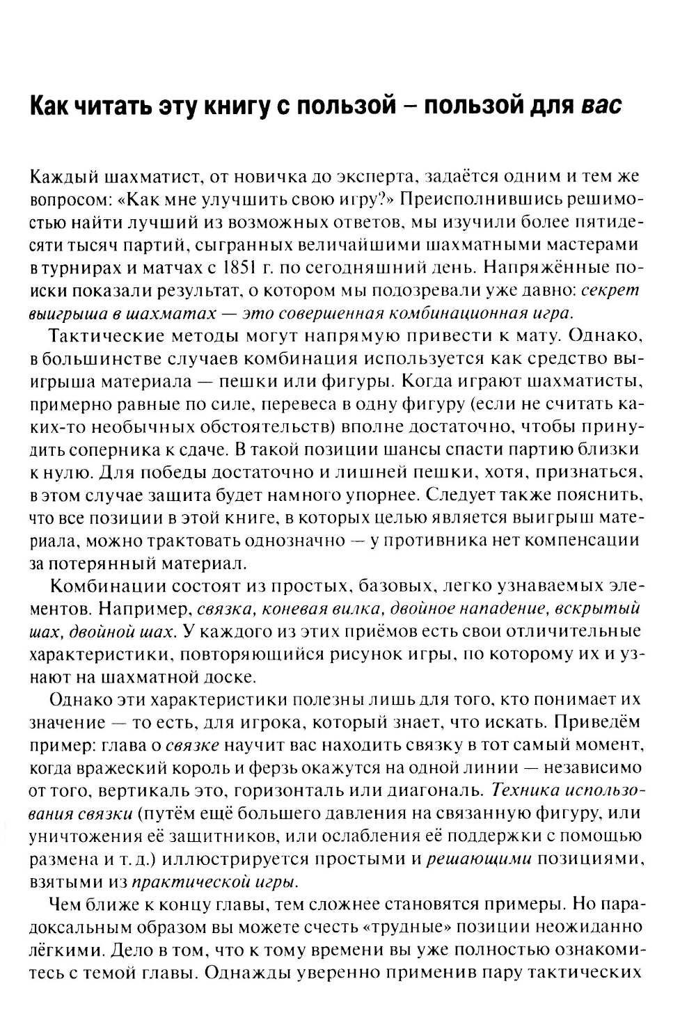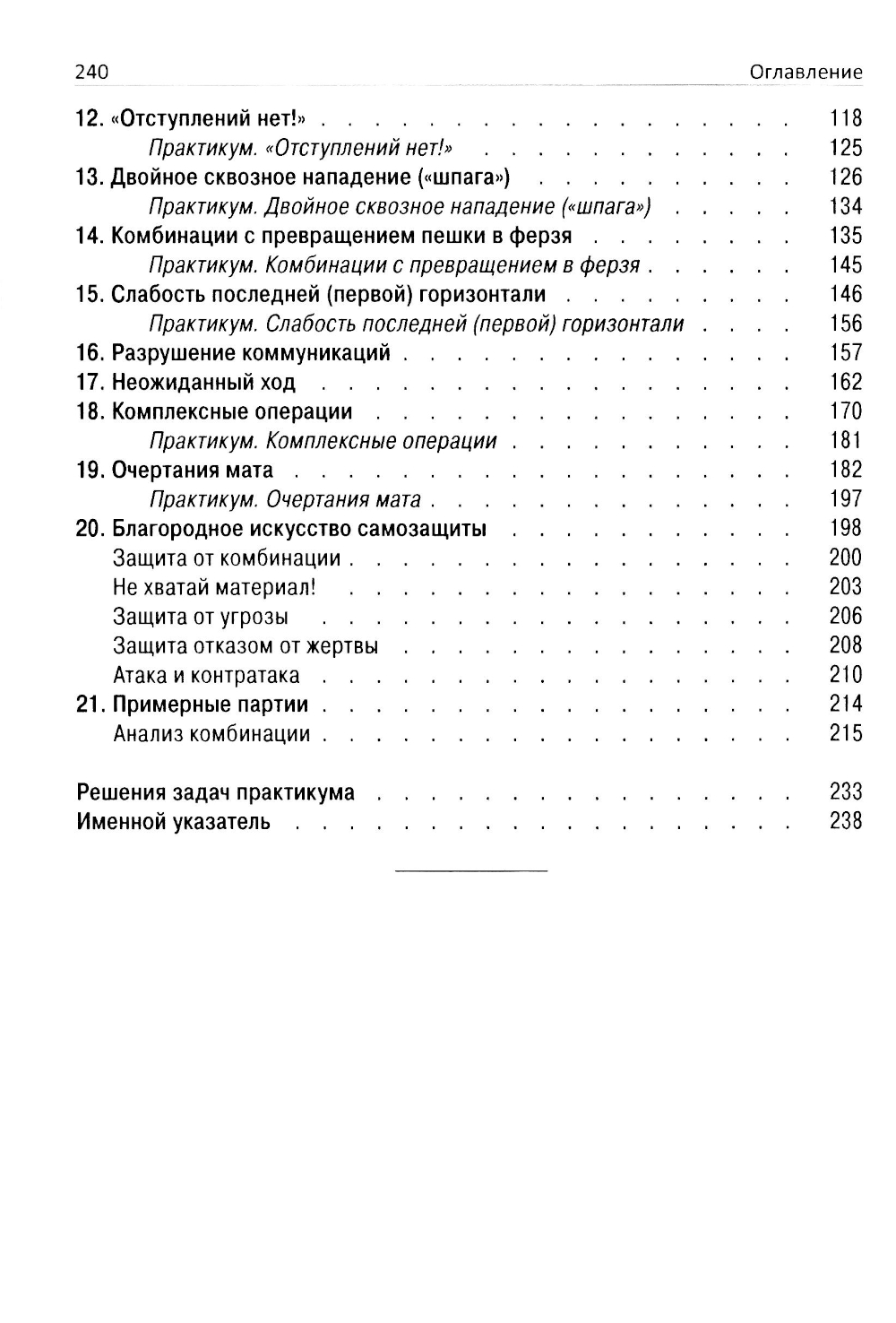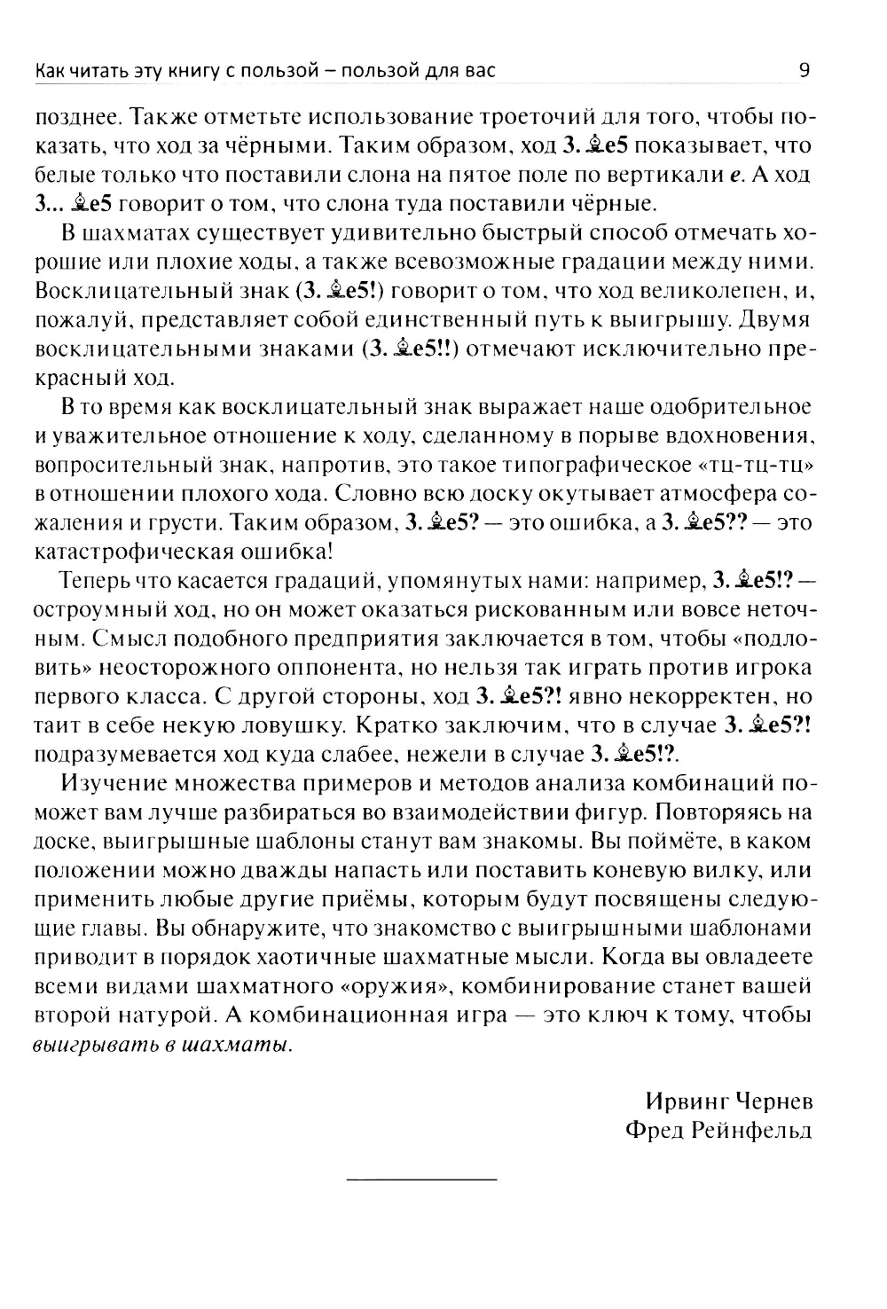Ирвинг Чернев и Фред Рейнфелд - классики американской шахматной литературы, Фред даже введен в 1996 году в Зал шахматной славы в Сент-Луисе под 26-м номером. На их книгах училось не одно поколение англоязычных шахматистов, но в СССР их не переводили и не издавали. В наше время ситуация изменилась, и эти авторы сегодня известны многим российским читателям. И Чернева, и Рейнфелда отличает простота и прозрачность изложения, доходчивый язык. Всё, что они пишут, понятно буквально каждому шахматисту, хотя книги эти и полны тонкостей. Данная книга - учебник по тактике, содержащий громадное число специально подобранных позиций. Изучение этих примеров и методов анализа комбинаций позволяет лучше разбираться во взаимодействии фигур. Повторяясь на доске, выигрышные шаблоны приводят в порядок хаотичные шахматные мысли. Когда вы овладеете всеми видами шахматного «оружия», комбинирование станет вашей второй натурой. А комбинационная игра - это ключ к победе в шахматах Книга написана в первую очередь для широкого круга шахматистов, но полезной и интересной она будет и для продвинутых шахматистов.| Издательство | Изд.Калиниченко |