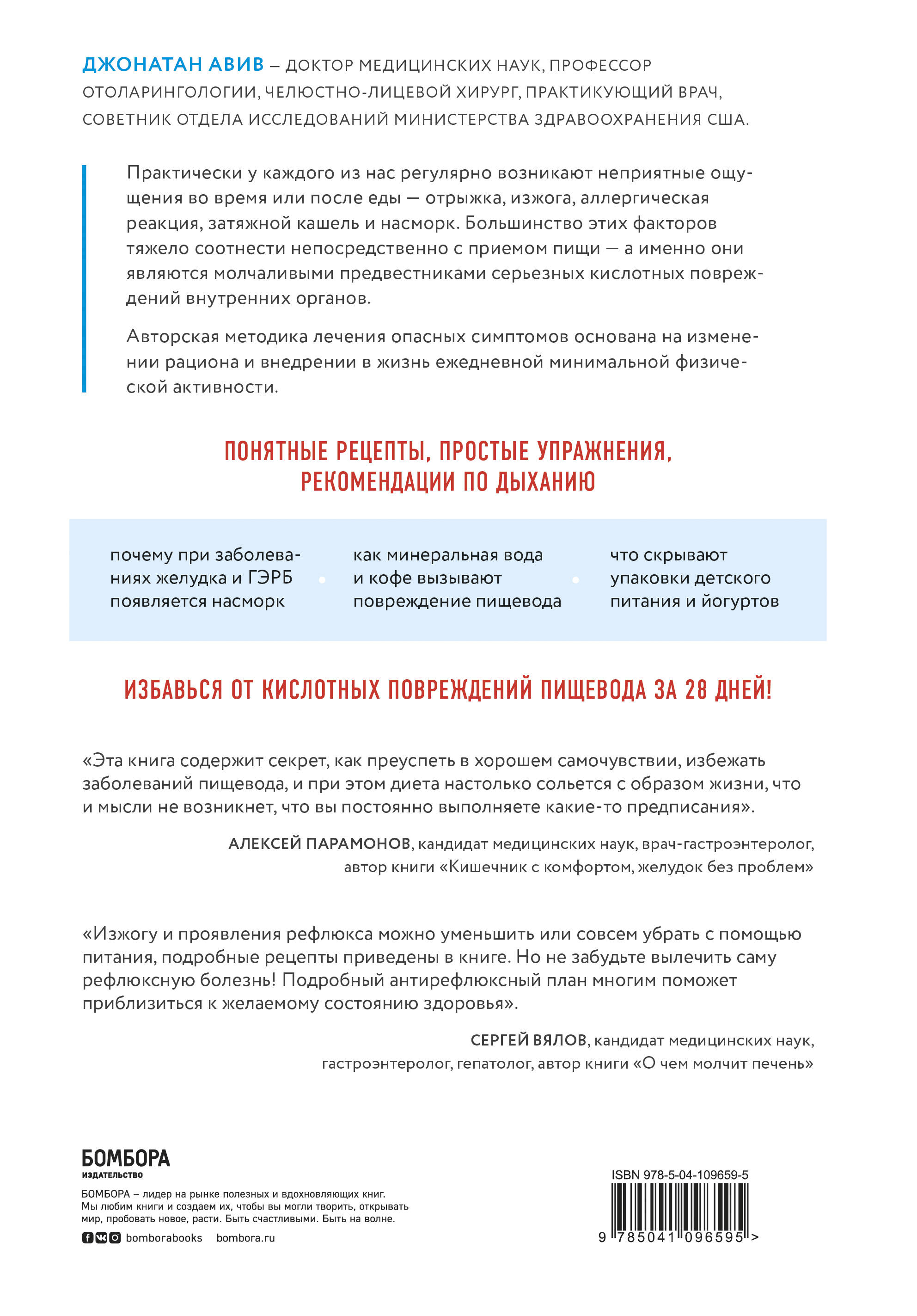 Джонатан Авив - профессор отоларингологии и всемирно признанный врач разработал авторскую методику лечения опасных симптомов, основанную на изменении рациона и внедрении в жизнь ежедневной минимальной физической активности. Все рецепты просты в приготовлении, а тренировки и рекомендации по дыханию доступны человеку с любым уровнем физической подготовки. Система 28-дневного снижения кислотности в организме и избавления от симптомов ГЭРБ включает в себя 2 фазы: 1 - исключение промышленных и натуральных продуктов с высокой кислотностью; 2 - возвращение в рацион части запрещенных продуктов. Идея - дать организму перерыв, чтобы фермент пепсин, ответственный за поедание пищевода, полностью вывелся из этого органа.| Издательство | ООО "Издательство "Эксмо" |