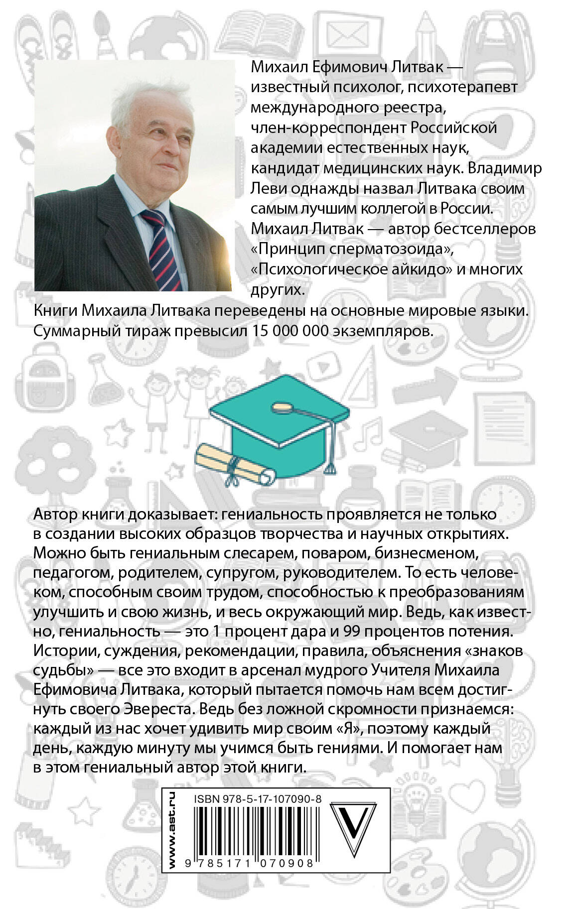 Автор книги доказывает: гениальность проявляется не только в создании высоких образцов творчества и научных открытиях. Можно быть гениальным слесарем, поваром, бизнесменом, педагогом, родителем, супругом, руководителем. То есть человеком, способным своим трудом, способностью к преобразованиям улучшить и свою жизнь, и весь окружающий мир. Ведь, как известно, гениальность - это 1 процент дара и 99 процентов потения. Истории, суждения, рекомендации, правила, объяснения «знаков судьбы» - все это входит в арсенал мудрого Учителя Михаила Ефимовича Литвака, который пытается помочь нам всем достигнуть своего Эвереста. Ведь без ложной скромности признаемся: каждый из нас хочет удивить мир своим «Я», поэтому каждый день, каждую минуту мы учимся быть гениями. И помогает нам в этом гениальный автор этой книги.
