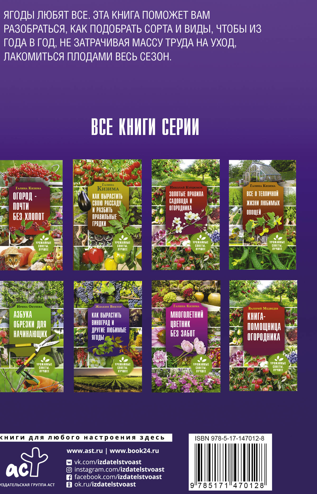 Ягоды любят все. Даже состоятельные владельцы загородных домов просят ландшафтных дизайнеров предусмотреть в плане благоустройства участка место для малины, смородины, крыжовника. А еще в последние годы у жителей средней полосы и севера России особым спросом пользуется виноград, ведь он дарит не только солнечные гроздья, но и очень декоративен. Неизменный интерес к ягодным кустарникам не случаен. Ведь при правильном подборе сортов и видов из года в год их плодами можно лакомиться весь сезон. Особого ухода они, как правило, не требуют. Но у каждой культуры есть свои «фирменные» особенности. О них вы и узнаете из этой книги.| Издательство | Издательство "АСТ" |