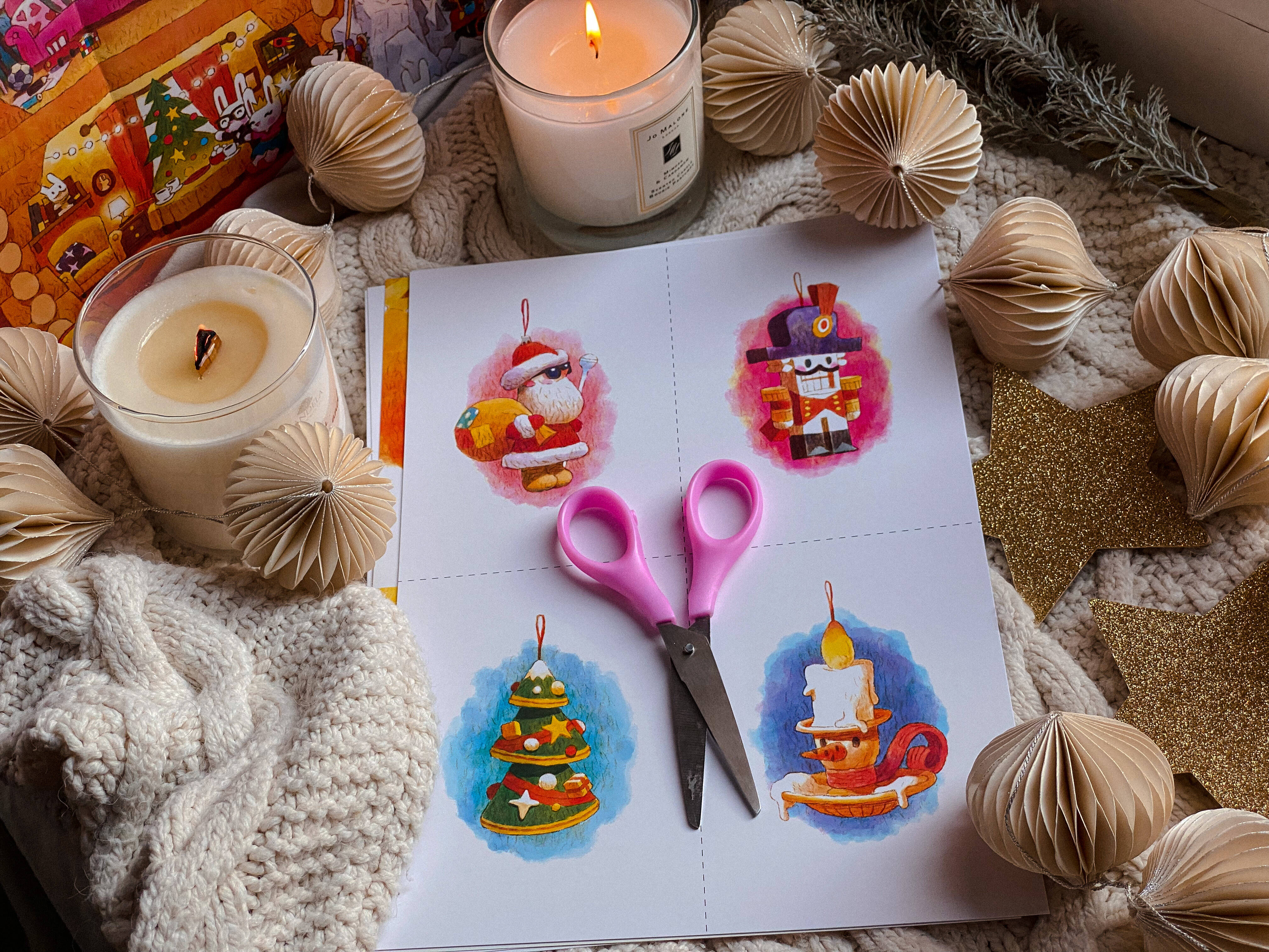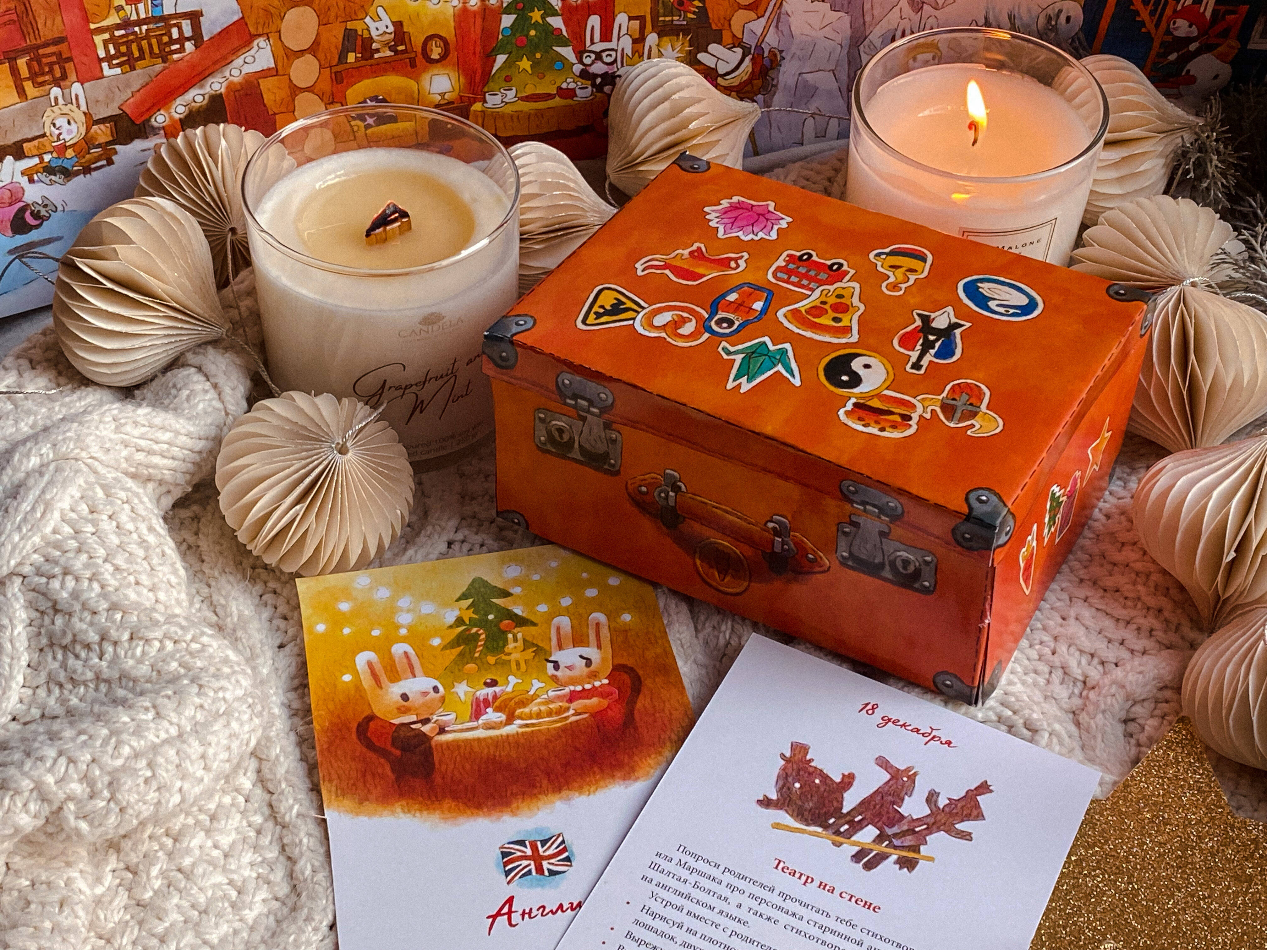 Чтобы ожидание Нового года не было грустным и утомительным, проведите 15 дней уходящего года вместе с увлекательным и уютным адвентом. Семья зайчиков решила встретить Новый год в домике лесного отеля, куда съехались их друзья из разных стран. Зайчатам Тоше и Таше выпало быть почтальонами тайного Санты. Каждый день они оказываются в новом домике иностранного гостя, дарят ему подарок и слушают историю о том, как встречают Новый год или Рождество в его стране. Состав адвента: огромный плакат, который украсит стену в комнате; 15 листов с наклейками; 16 карточек с историей; 16 карточек с заданиями; чемоданчик, в который каждый день надо класть по две карточки, лист с наклейками и маленький сувенир по желанию; игра "Найди отличия". Инструкция: Начните играть за 15 дней до Нового года! Перед началом игры разрежьте картонные листы на четыре части, чтобы получилось 32 карточки. Вырежьте детали чемоданчика, согните их по пунктирным линиям и склейте. Каждый день в чемоданчике должны появляться лист с наклейками и две карточки: с историей и с заданием. В качестве сюрприза туда же можно добавить конфету, любимый фрукт, красивый камешек или маленький сувенир. Помогите зайчатам нарядить ёлку и разнести подарки. Игра начинается 17 декабря. Повесьте плакат на стену. Достаньте из чемоданчика две карточки и лист с наклейками. Прочитайте историю и приклейте главных героев в их домик, оленёнка - на диван рядом с зайчиком Тошей, количество дней, оставшихся до Нового года, - на календарь, игрушку - на ёлку. Наряжайте ёлочку на плакате наклейками-игрушками. Ведите счёт дням, оставшимся до Нового года, на календаре в комнате зайчат. Читайте в нижней части карточки с историей, куда зайчата отправится завтра, и помогайте им находить нужный домик и оставлять около него подарок от Тайного Санты. Выполняйте задания из второго блока карточек. Такие зимние и праздничные занятия помогут вам наполнить дни до Нового года приятным ожиданием. После окончания игры переверните карточки с заданиями картинками вверх. Выберите две похожие картинки и предложите ребёнку найти пять отличий. Для кого этот адвент-календарь: Для детей от 4 лет и их родителей.| Издательство | Манн, Иванов и Фербер |