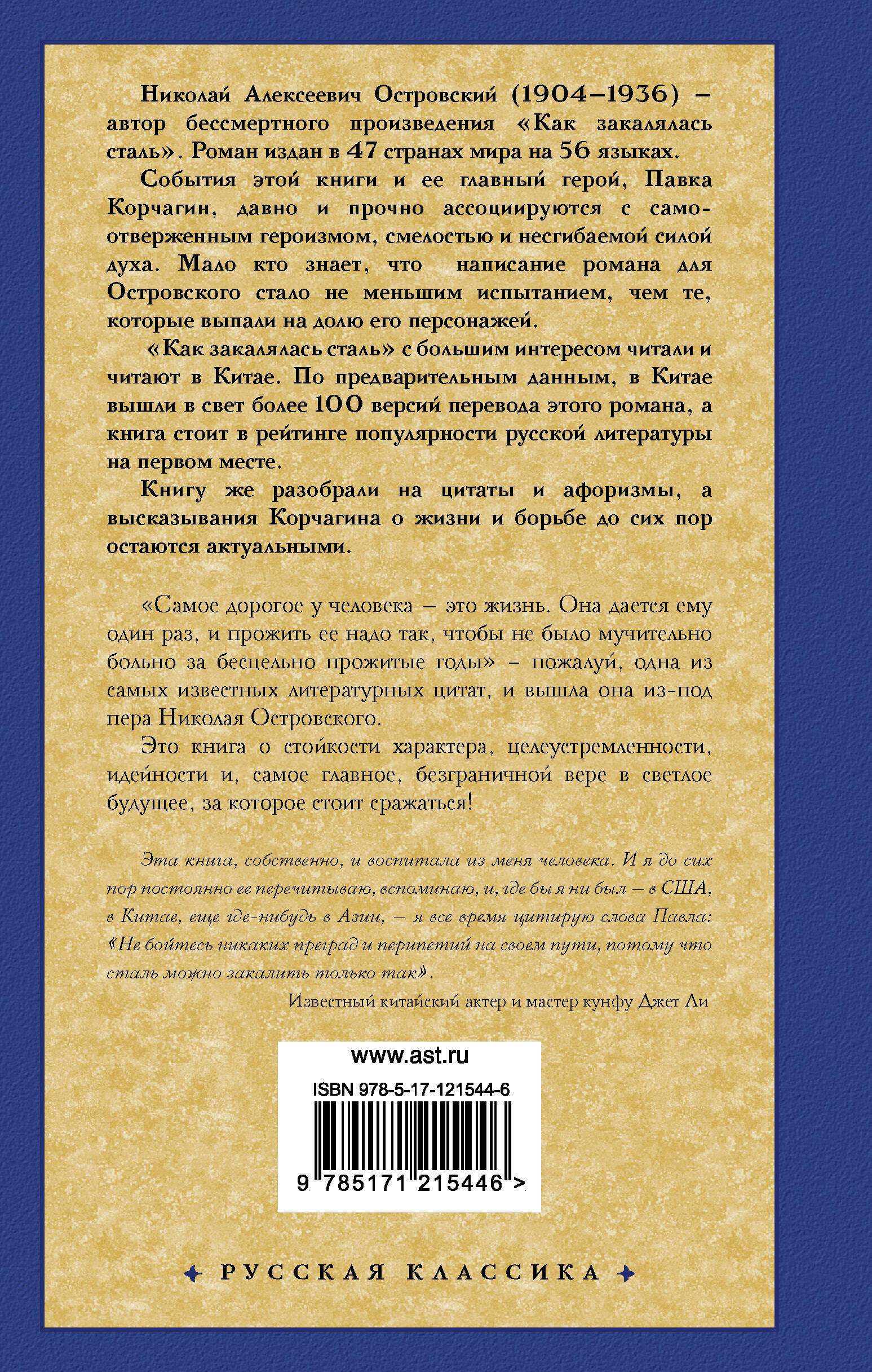 Блок об авторе Островский Николай Алексеевич (1904-1936) - советский писатель, автор знаменитого романа "Как закалялась сталь". Аннотация "Самое дорогое у человека - это жизнь. Она дается ему один раз, и прожить ее надо так, чтобы не было мучительно больно за бесцельно прожитые годы" - пожалуй, одна из самых известных литературных цитат, и вышла она из-под пера Николая Островского. "Как закалялась сталь" - автобиографический роман, написанный в 1932 году. Роман сразу обрел огромную популярность и стал самым издаваемым произведением советской литературы. Это книга о стойкости характера, целеустремленности, идейности и, самое главное, безграничной вере в светлое будущее, за которое стоит сражаться!| Издательство | ИЗДАТЕЛЬСТВО "АСТ" |