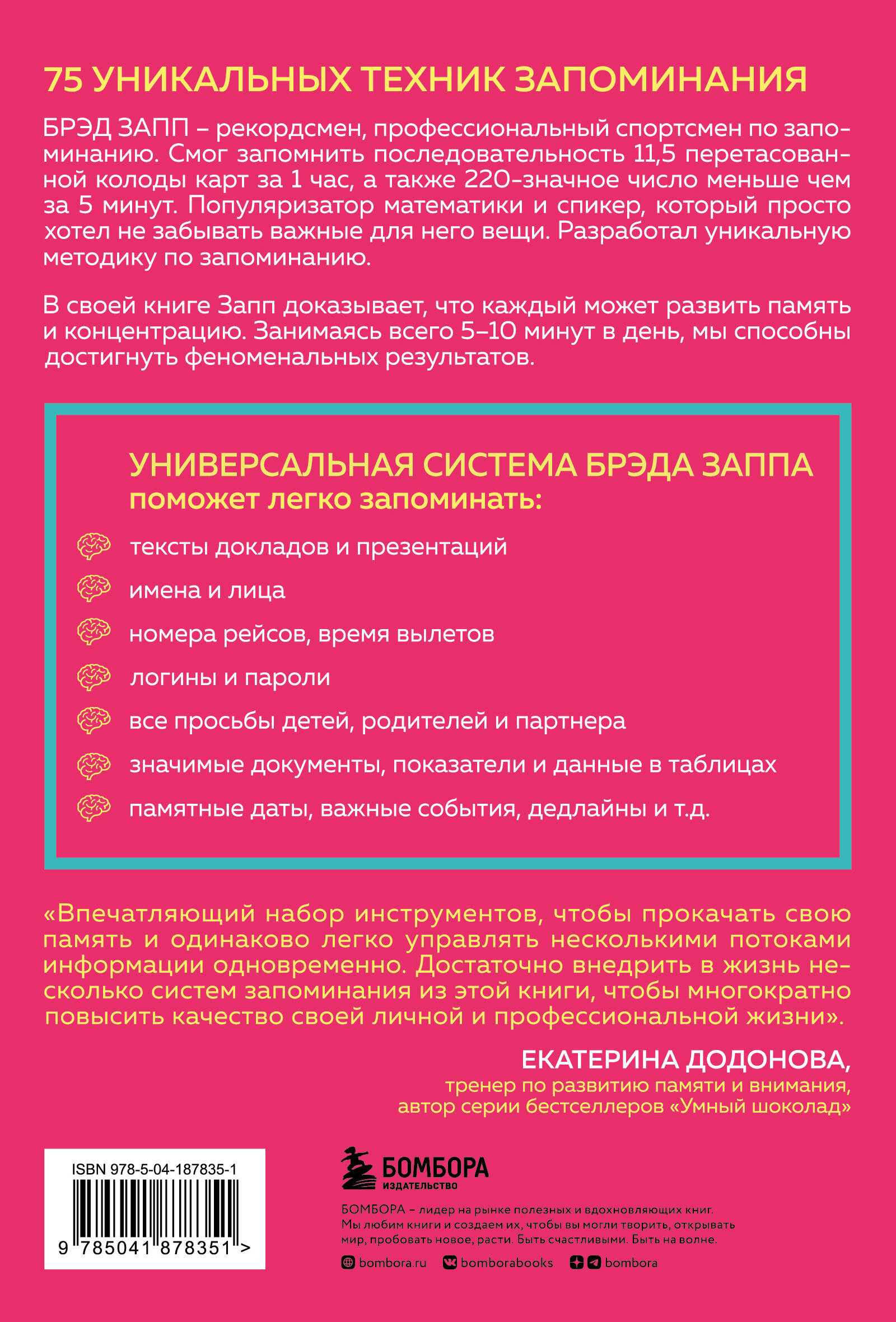Бред Запп - рекордсмен, профессиональный спортсмен по запоминанию. Смог запомнить последовательность 11,5 перетасованных колод карт за 1 час, а также 220-значное число меньше чем за 5 минут. Популяризатор математики и спикер, который просто хотел не забывать важные для него вещи и заодно разработал уникальную методику по запоминанию. В своей книге Запп доказывает, что каждый может развить память и концентрацию. Занимаясь всего 5-10 минут в день, мы способны достигнуть феноменальных результатов. УНИВЕРСАЛЬНАЯ СИСТЕМА БРЕДА ЗАППА поможет легко запоминать: • тексты докладов и презентаций; • имена и лица; • номера рейсов, время вылетов; • логины и пароли; • все просьбы детей, родителей и партнера; • значимые документы, показатели и данные в таблицах; • памятные даты, важные события, дедлайны и т.д. Почему ее хочется прочесть: 75 ТЕХНИК ЗАПОМИНАНИЯ Приобретите навыки с помощью коллекции подробных и легких в выполнении упражнений. ПРАКТИЧЕСКИЕ РЕКОМЕНДАЦИИ Выберите техники, которые больше всего подходят для улучшения вашей учебы, работы и личной жизни. ОЧЕВИДНАЯ ПОЛЬЗА Узнайте преимущества каждой техники с четко обозначенными целями, такими как, например, «запоминание своего расписания дел».| Издательство | ООО "Издательство "Эксмо" |