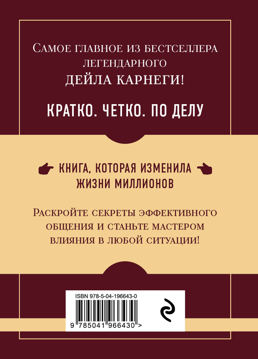 Сокращенное издание легендарной книги от Дейла Карнеги. Самое известное руководство по общению и личной эффективности. В своей книге Карнеги предлагает проверенные временем техники и методы, которые помогают людям строить крепкие социальные связи и достигать успеха в коммуникациях. Главные мысли и идеи автора мирового бестселлера в удобном формате.| Издательство | ООО "Издательство "Эксмо" |
