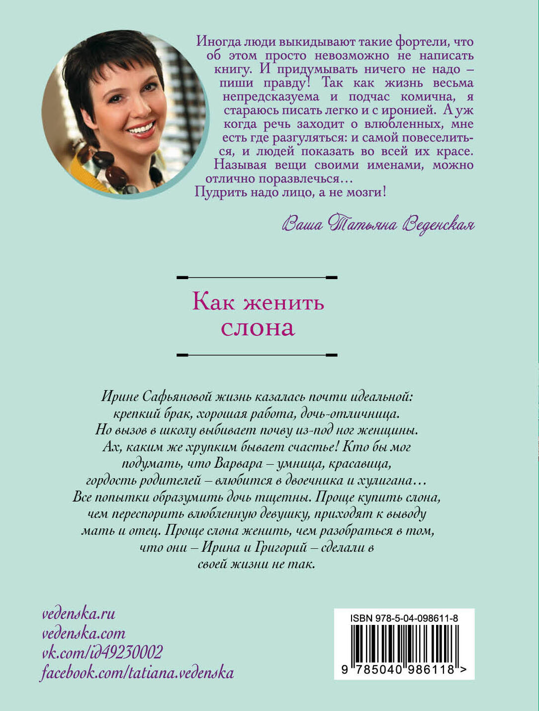 Ирине Сафьяновой жизнь казалась почти идеальной: крепкий брак, хорошая работа, дочь-отличница. Но вызов в школу выбивает почву из-под ног женщины. Ах, каким же хрупким бывает счастье! Кто бы мог подумать, что Варвара - умница, красавица, гордость родителей - влюбится в двоечника и хулигана… Все попытки образумить дочь тщетны. Проще купить слона, чем переспорить влюбленную девушку, приходят к выводу мать и отец. Проще слона женить, чем разобраться в том, что они - Ирина и Григорий - сделали в своей жизни не так.| Издательство | ООО "Издательство "Эксмо" |