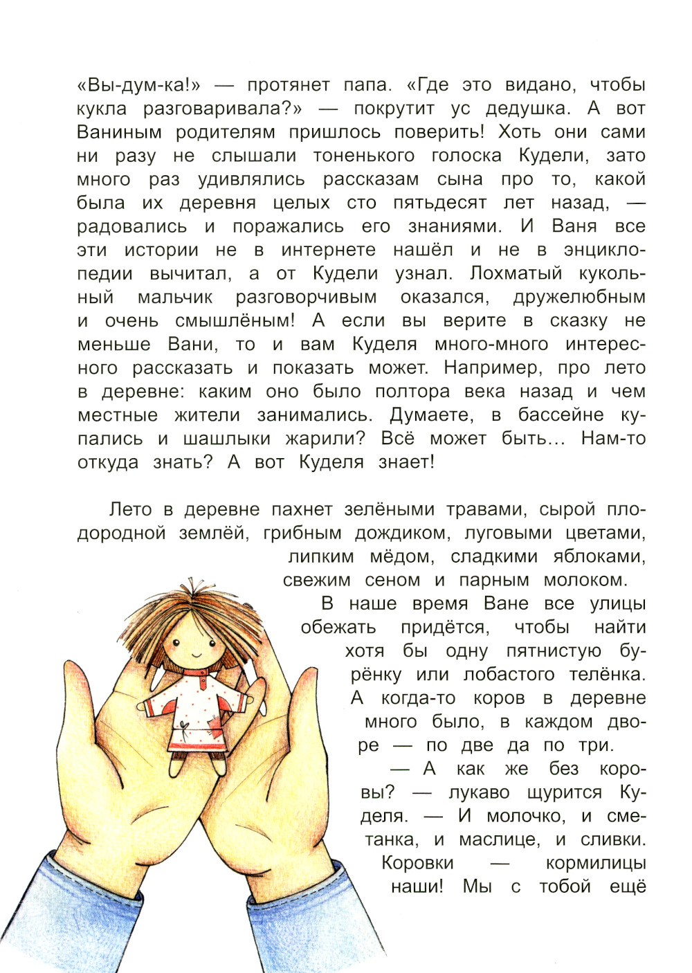 Городской мальчик Ваня переехал жить в деревню и в старом бабушкином сундуке нашёл Куделю, мальчика с соломенными волосами. Стали они лучшими друзьями, и какая же интересная началась у них жизнь! Куделя про старинные народные традиции рассказывает, а Ваня знай удивляется и на ус мотает. Благодаря другу узнал мальчишка, как крестьяне землю возделывали и урожай хранили, какую одежду в поле собирали, а какую в чугунке варили, откуда у них на столе румяные караваи да аппетитные каши появлялись. Книга рассказывает обо всех значимых событиях в жизни крестьян, непростых заботах и ярких торжествах: от летней горячей поры, осенних полевых работ, зимних трудов и развлечений до весеннего пробуждения природы, вместе с которым приходит главный христианский праздник - Пасха. Книга адресована детям от 5 лет.| Издательство | Антология |