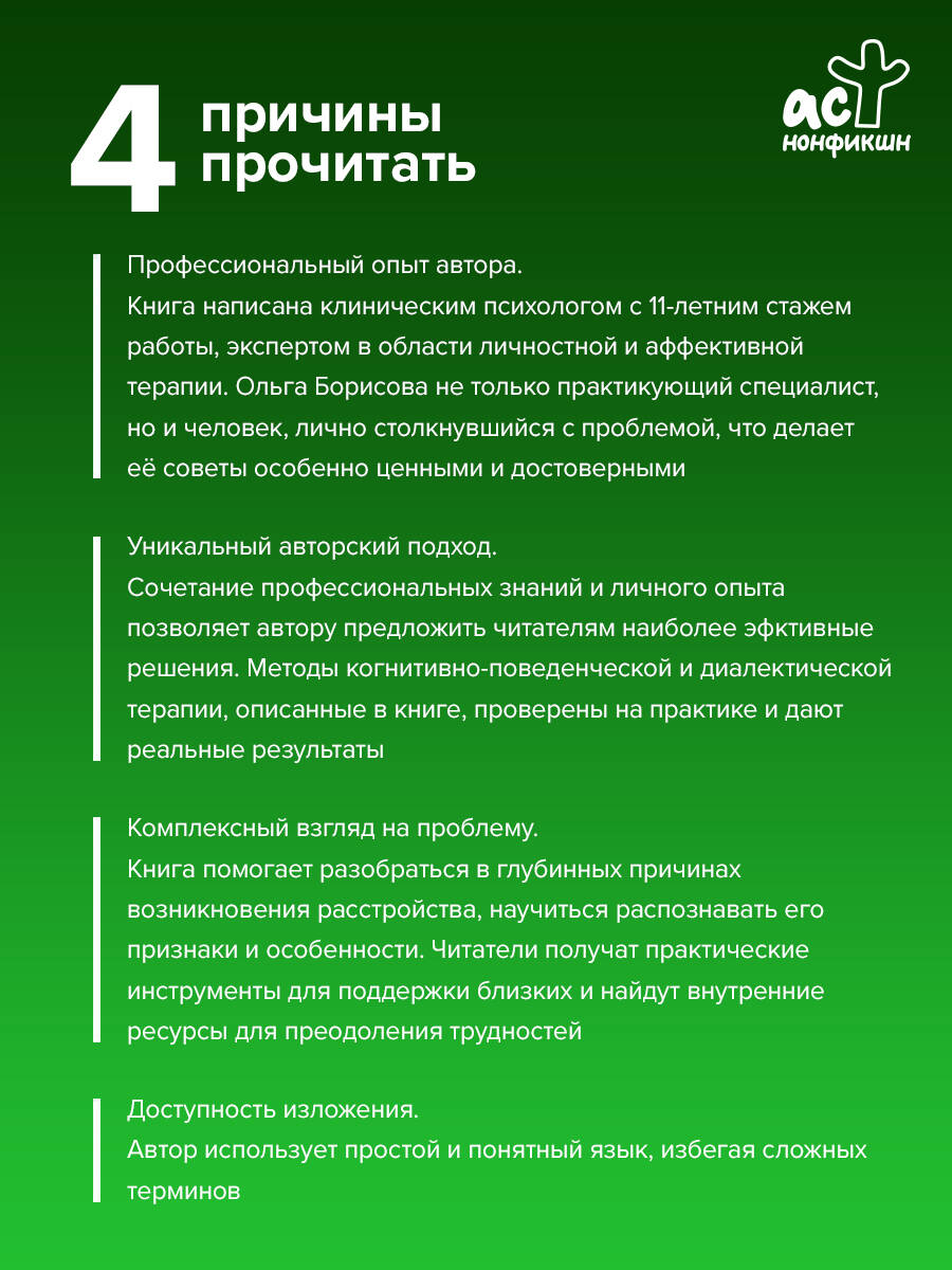 Ольга Борисова - опытный клинический психолог с 11-летним стажем работы, эксперт в области личностной и аффективной терапии, специализирующаяся на работе с ПРЛ, где успешно применяет методы когнитивно-поведенческой и диалектической терапии. А еще Ольга - мама пограничного ребенка, что делает эту книгу особенно ценной: личный опыт в сочетании с профессиональными знаниями позволяет ей находить наиболее эффективные решения и давать по-настоящему работающие рекомендации. Пограничное расстройство личности - это состояние, которое часто окружено мифами и непониманием. В своей книге автор раскрывает его истинную природу, помогая читателям: • Понять глубинные причины возникновения расстройства; • Распознать его признаки и особенности; • Научиться поддерживать близких с ПРЛ; • Найти внутренние ресурсы для тех, кто сам сталкивается с этим состоянием; • Преодолеть страх и предвзятость в отношении ПРЛ. Эта книга станет незаменимым проводником как для людей, живущих с пограничным расстройством личности, так и для их близких, психологов и всех, кто стремится лучше понимать человеческую психику. Благодаря простому и доступному языку, автор помогает заглянуть в самые сокровенные уголки души человека с ПРЛ, показывая, что даже в самых тёмных пространствах есть место свету и надежде. Откройте для себя путь к пониманию, принятию и исцелению вместе с этим глубоким и чутким исследованием.| Издательство | Издательство "АСТ" |