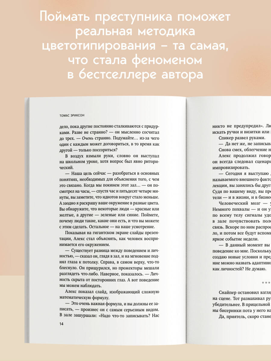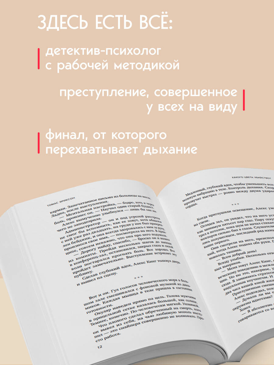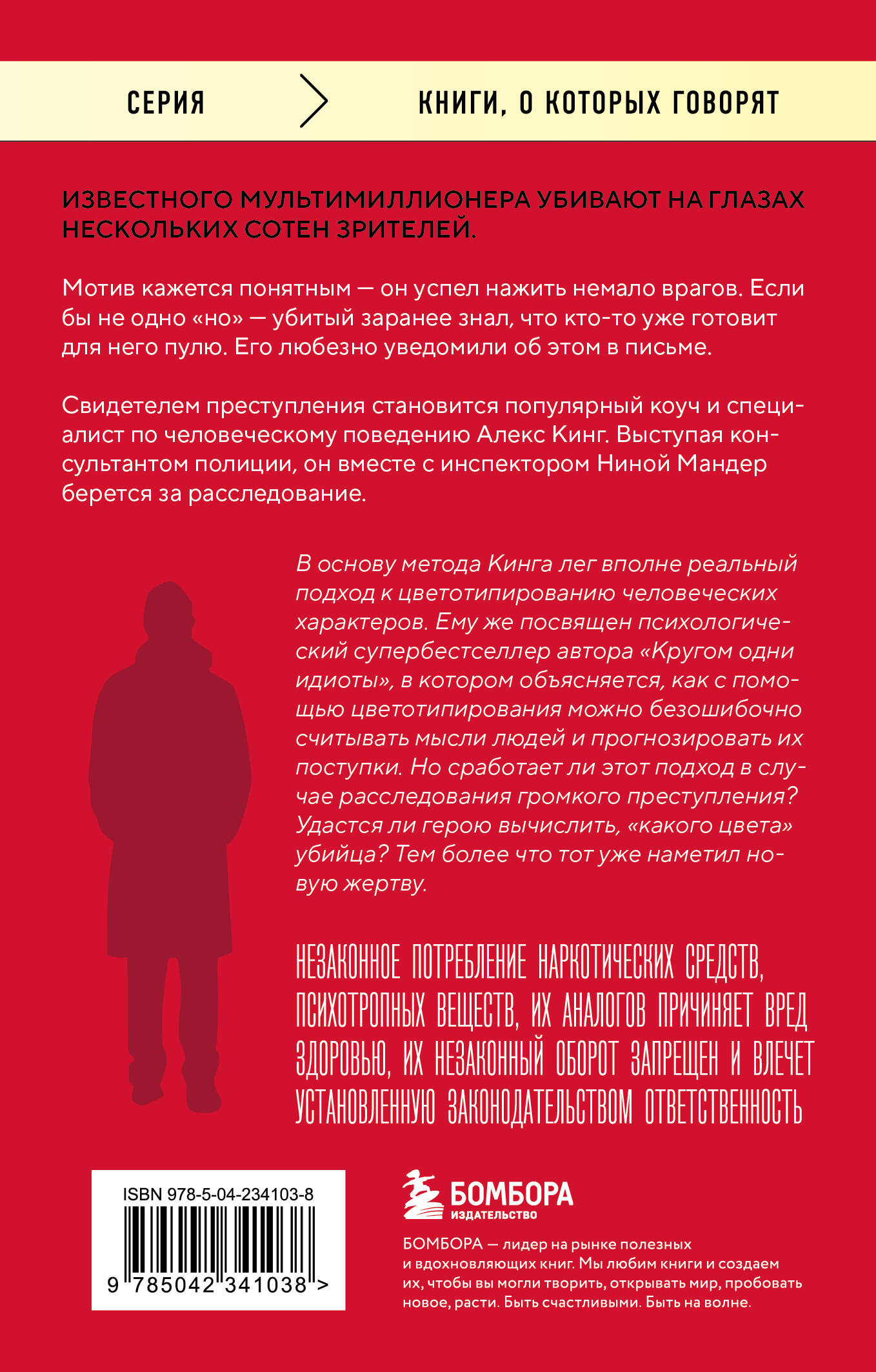 НЕЗАКОННОЕ ПОТРЕБЛЕНИЕ НАРКОТИЧЕСКИХ СРЕДСТВ, ПСИХОТРОПНЫХ ВЕЩЕСТВ, ИХ АНАЛОГОВ ПРИЧИНЯЕТ ВРЕД ЗДОРОВЬЮ, ИХ НЕЗАКОННЫЙ ОБОРОТ ЗАПРЕЩЕН И ВЛЕЧЕТ УСТАНОВЛЕННУЮ ЗАКОНОДАТЕЛЬСТВОМ ОТВЕТСТВЕННОСТЬ. Известного мультимиллионера убивают на глазах нескольких сотен зрителей. Его смерть кажется закономерной - он успел нажить немало врагов. Если бы не одно «но» - убитый заранее знал, что кто-то уже готовит для него пулю. Его любезно уведомили об этом в письме. Свидетелем преступления становится популярный коуч и специалист по человеческому поведению Алекс Кинг. Выступая консультантом полиции, он вместе с инспектором Ниной Мандер берется за расследование. В основу метода Кинга лег вполне реальный подход к цветотипированию человеческих характеров. Ему же посвящён психологический супербестселлер автора «Кругом одни идиоты», в котором объясняется, как с помощью цветотипирования можно безошибочно считывать мысли людей и прогнозировать их поступки. Но сработает ли этот подход в случае расследования громкого преступления? Удастся ли герою вычислить, «какого цвета» убийца? Тем более что тот уже наметил новую жертву.| Издательство | ООО "Издательство "Эксмо" |