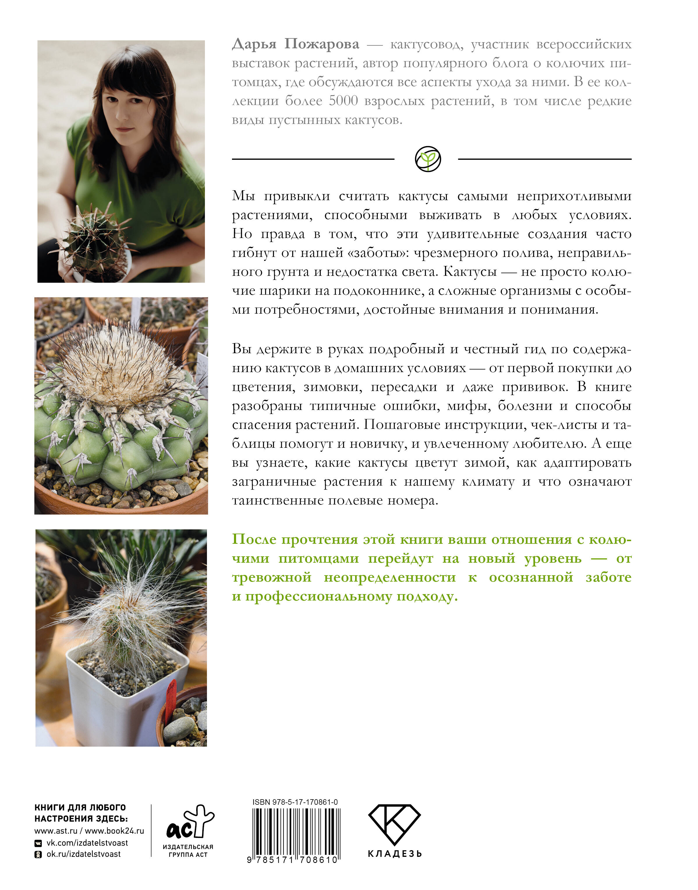 Дарья Пожарова - кактусовод, участник всероссийских выставок растений, автор популярного блога о колючих питомцах, где обсуждаются все аспекты ухода за ними. В ее коллекции более 5000 взрослых растений, в том числе редкие виды пустынных кактусов. Мы привыкли считать кактусы самыми неприхотливыми растениями, способными выживать в любых условиях. Но правда в том, что эти удивительные создания часто гибнут от нашей "заботы": чрезмерного полива, неправильного грунта и недостатка света. Кактусы - не просто колючие шарики на подоконнике, а сложные организмы с особыми потребностями, достойные внимания и понимания. Вы держите в руках подробный и честный гид по содержанию кактусов в домашних условиях - от первой покупки до цветения, зимовки, пересадки и даже прививок. В книге разобраны типичные ошибки, мифы, болезни и способы спасения растений. Пошаговые инструкции, чек-листы и таблицы помогут и новичку, и увлеченному любителю. А еще вы узнаете, какие кактусы цветут зимой, как адаптировать заграничные растения к нашему климату и что означают таинственные полевые номера. После прочтения этой книги ваши отношения с колючими питомцами перейдут на новый уровень - от тревожной неопределенности к осознанной заботе и профессиональному подходу.| Издательство | Издательство "АСТ" |