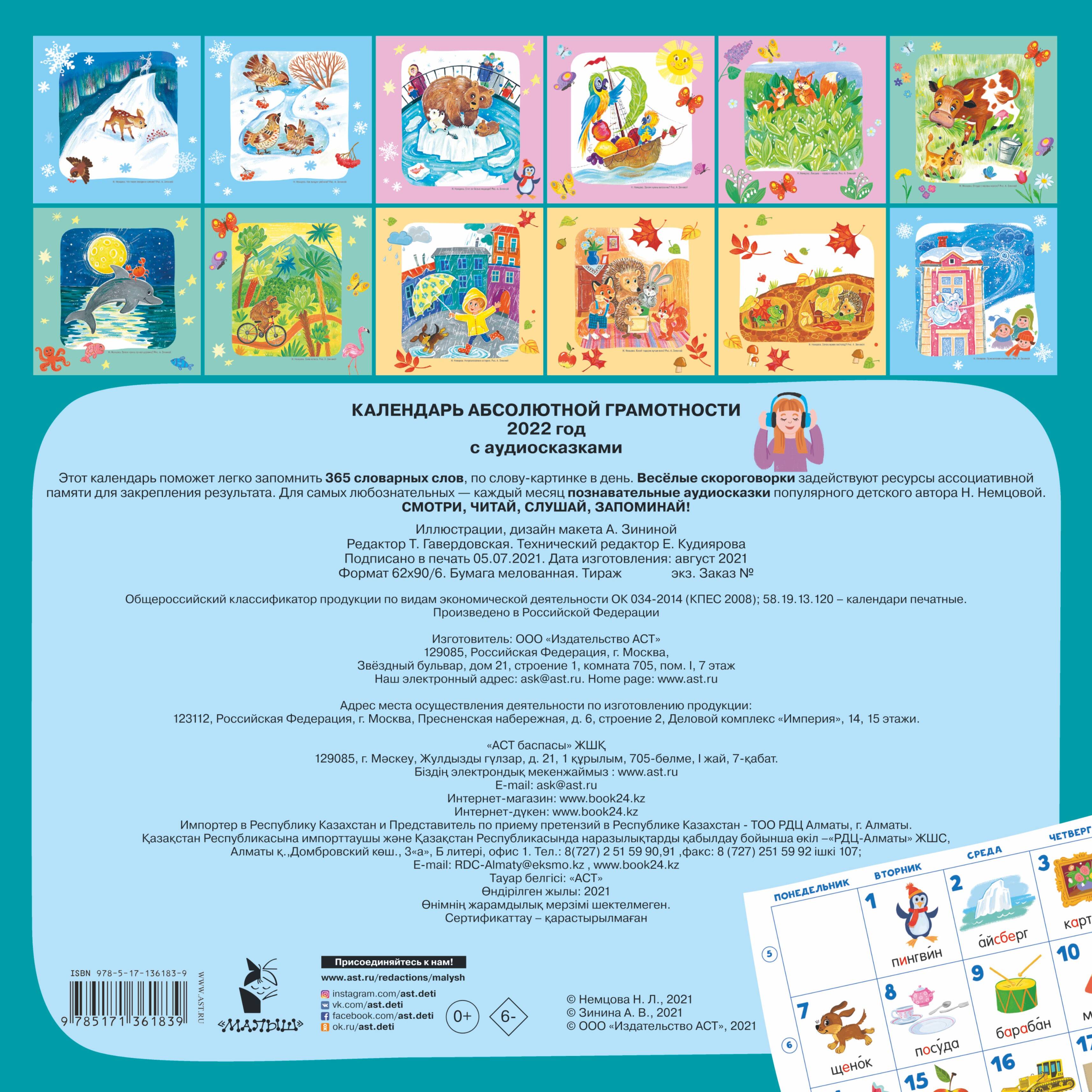 Как повысить грамотность ребёнка? Нужно не только прочитать и написать, а ещё увидеть яркий образ! Этот календарь поможет легко и быстро запомнить 365 словарных слов, по слову-картинке в день. Весёлые скороговорки задействуют ресурсы ассоциативной памяти для закрепления результата. Ощутимый эффект уже через месяц! Для самых любознательных - каждый месяц познавательные аудиосказки популярного детского автора Н. Немцовой. Для младшего школьного возраста.| Издательство | АСТ |