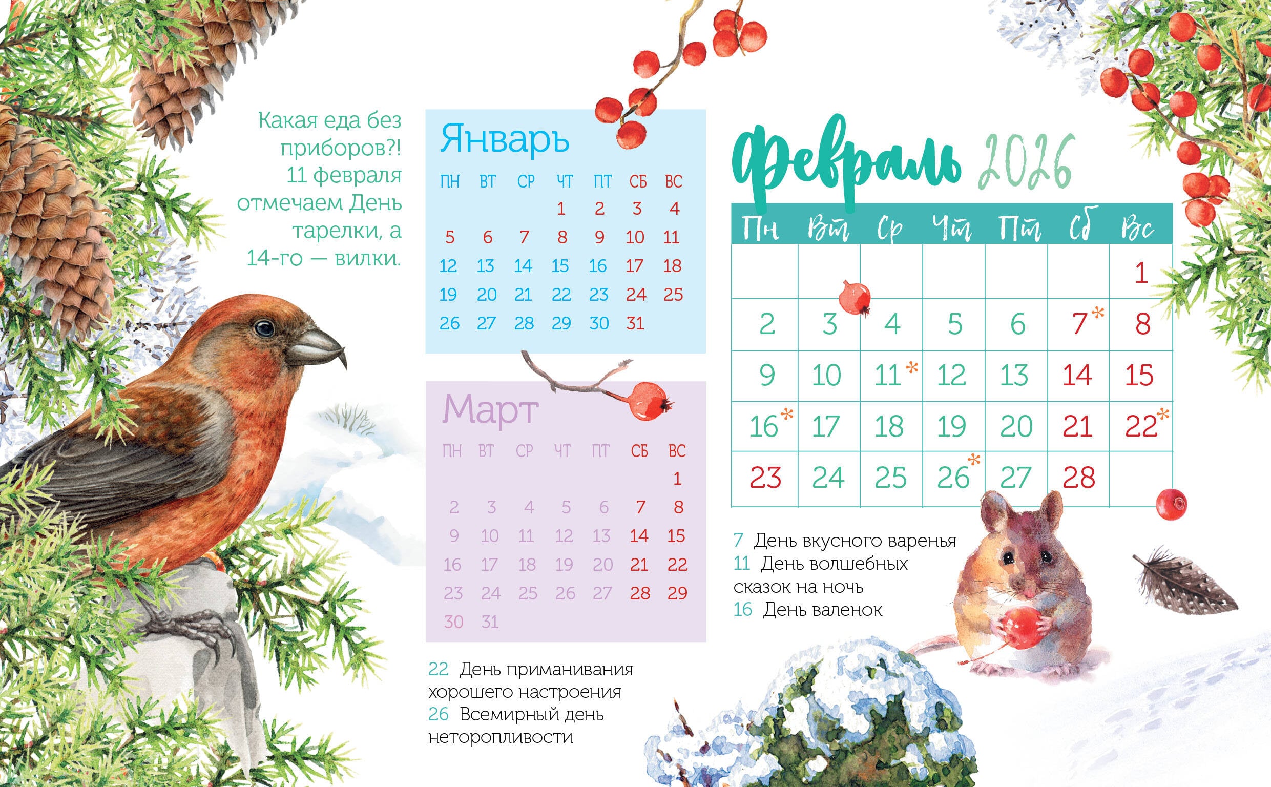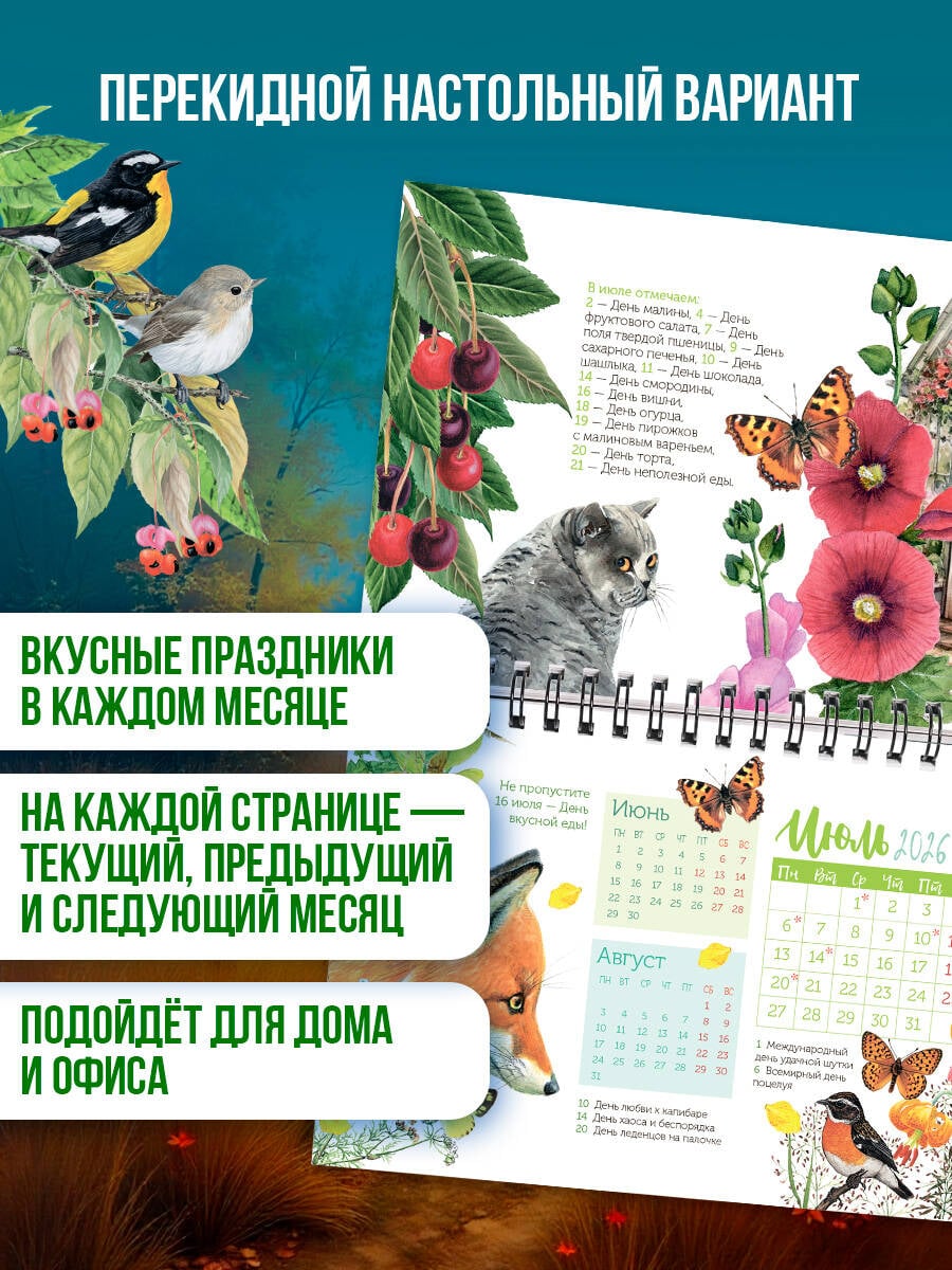 Настольный календарь будет радовать вас целый год не только яркими иллюстрациями, но и вкусными праздниками, которые отмечены в каждом месяце. На каждой странице вы сможете увидеть текущий месяц плюс предыдущий и последующий. Уверены, что такой календарь будет уместен и на рабочем столе, и для дома.| Издательство | Издательство "АСТ" |