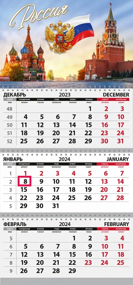Календарь квартальный на 2024 год Россия. Собор и Кремль