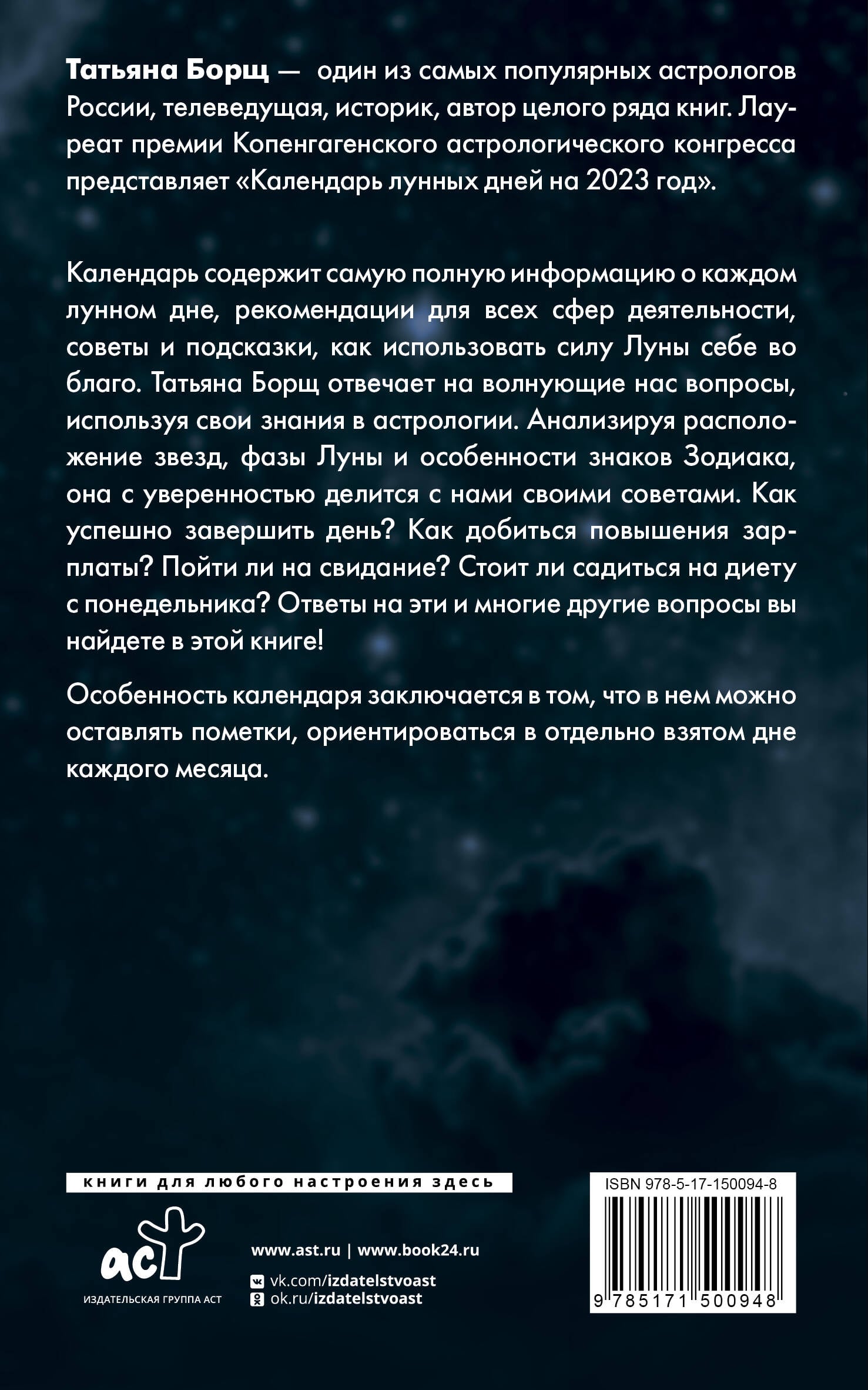Лунный календарь от Татьяны Борщ - это возможность узнать, в какие дни 2023 года… - не стоит начинать новые дела и лучше подытожить итоги лунного месяца; - можно привести в порядок дела и избавиться от того, что мешает работе или личным отношениям; - лучше всего заключать брак; - стоит начинать искать новую работу.| Издательство | ИЗДАТЕЛЬСТВО "АСТ" |