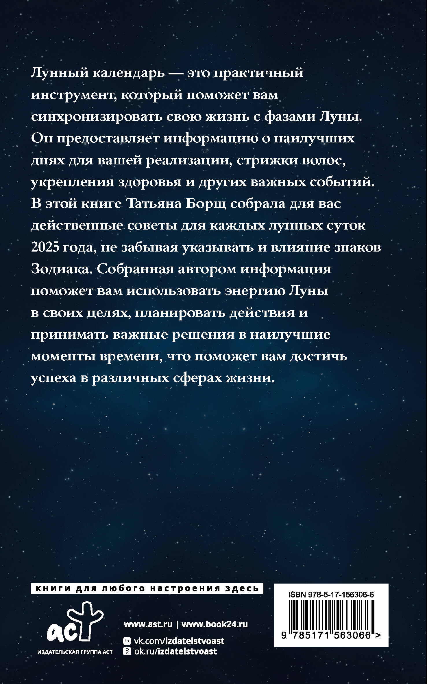Лунный календарь - это практичный инструмент, который поможет вам синхронизировать свою жизнь с фазами Луны. Он предоставляет информацию о наилучших днях для вашей реализации, стрижки волос, укрепления здоровья и других важных событий. В этой книге Татьяна Борщ собрала для вас действенные советы для каждых лунных суток 2025 года, не забывая указывать и влияние знаков Зодиака. Собранная автором информация поможет вам использовать энергию Луны в своих целях, планировать действия и принимать важные решения в наилучшие моменты времени, что поможет вам достичь успеха в различных сферах жизни.| Издательство | Издательство "АСТ" |