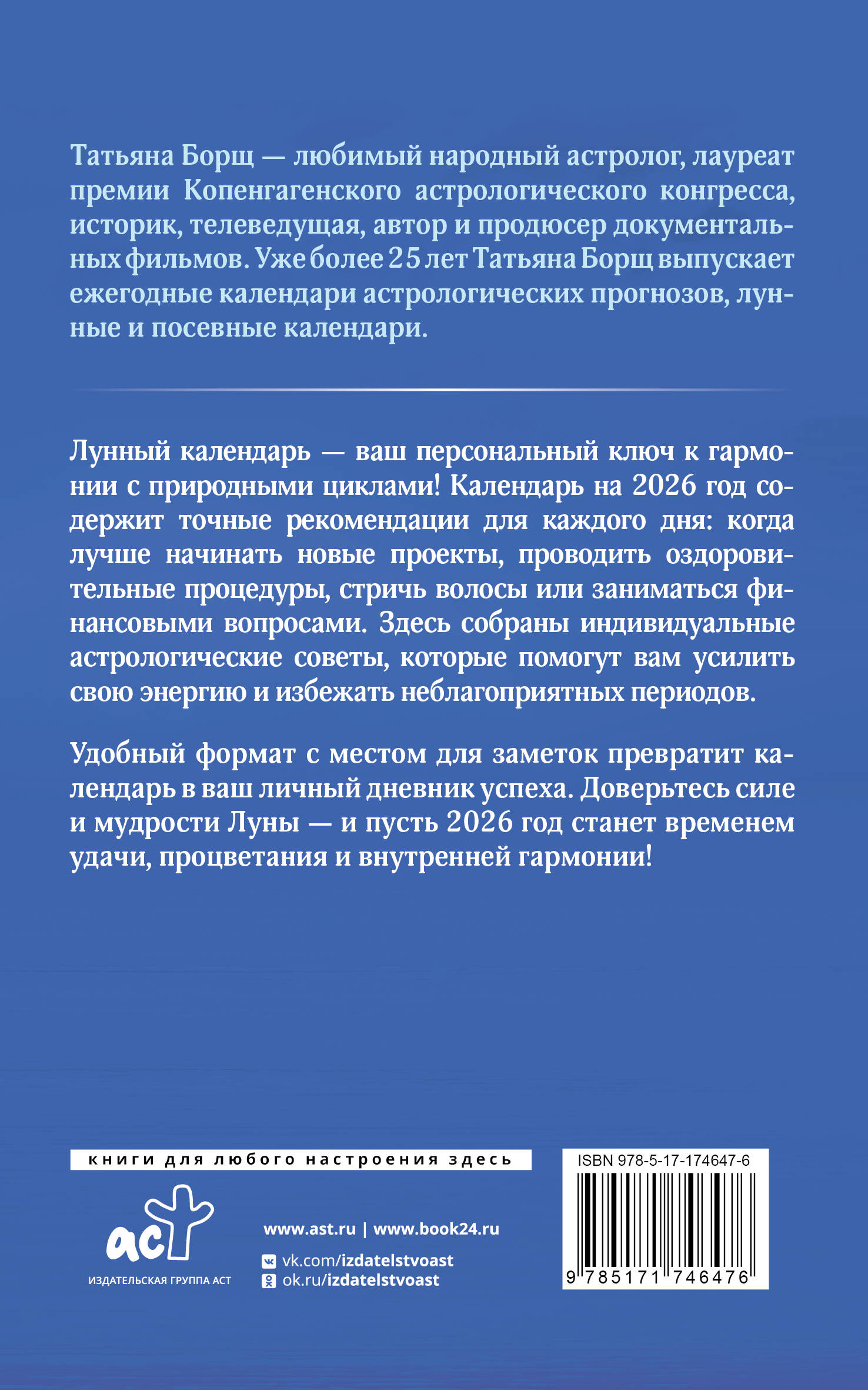 Лунный календарь - ваш персональный ключ к гармонии с природными циклами! Календарь на 2026 год содержит точные рекомендации для каждого дня: когда лучше начинать новые проекты, проводить оздоровительные процедуры, стричь волосы или заниматься финансовыми вопросами. Здесь собраны индивидуальные астрологические советы, которые помогут вам усилить свою энергию и избежать неблагоприятных периодов. Удобный формат с местом для заметок превратит календарь в личный дневник успеха. Доверьтесь силе и мудрости Луны - и пусть 2026 год станет временем удачи, процветания и внутренней гармонии!| Издательство | Издательство "АСТ" |