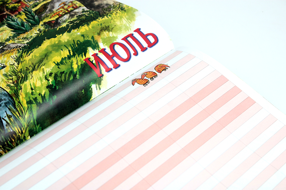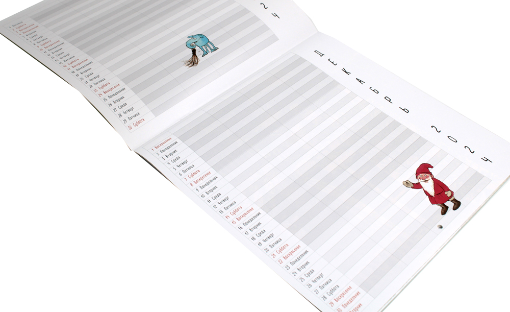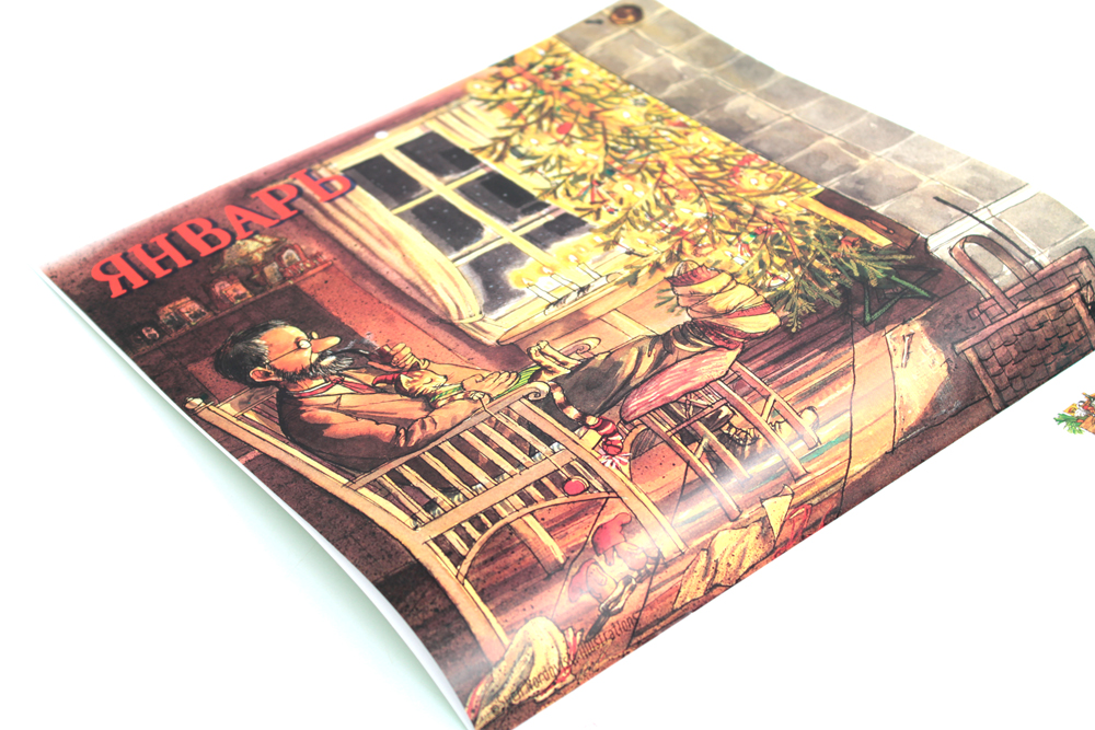 Каждый месяц начинается с картинки Свена Нурдквиста из книг о Петсоне и Финдусе. Календарь вешается на гвоздик.