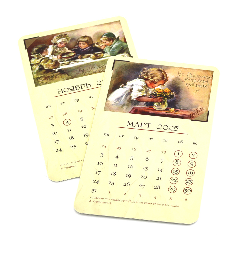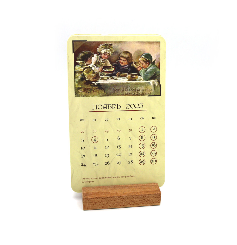 Настольный календарь «Добрые традиции» создаст теплую атмосферу в вашем доме или офисе. Винтажный дизайн обрамляет дореволюционные открытки. Приятные образы позволяют нам заглянуть за завесу времени и узнать, как жили и что любили наши прабабушки и прадедушки. Для каждого месяца были подобраны уникальные почтовые карточки с иллюстрациями российских художников, которые более века назад отправляли друг другу люди вместе с наилучшими пожеланиями. Календарь не только отлично впишется в любой интерьер, но подарит прекрасное настроение вам и окружающим вас людям. Цитаты великих классиков русской литературы подарят сил и мотивации для новых свершений в 2025 году. Подставка под календарь, выточенная из хвойного дерева, придает карточкам устойчивости. Календарь «Добрые традиции» - отличный подарок себе, своим любимым и коллегам. В комплект входят: 6 двусторонних карточек и 1 подставка из цельного дерева. Счастливого Нового года!| Издательство | ИД Мещерякова |