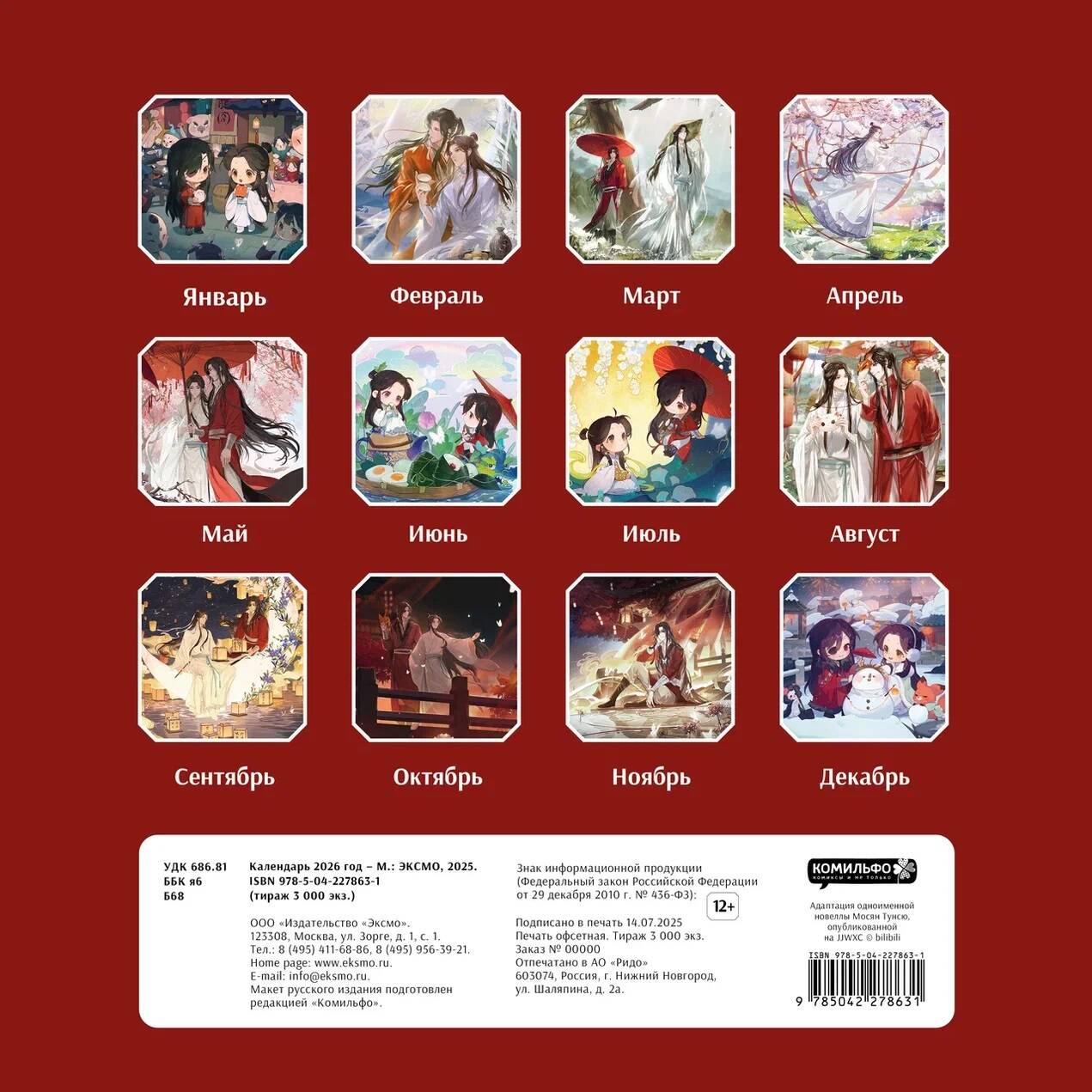 Истинные поклонники оригинального романа Мосян Тунсю и снятого по нему мультсериала по достоинству оценят календарь с двенадцатью артами любимых персонажей. Пусть «Небожители» благословят и украсят ваши фанатские чертоги!| Издательство | ООО "Издательство "Эксмо" |