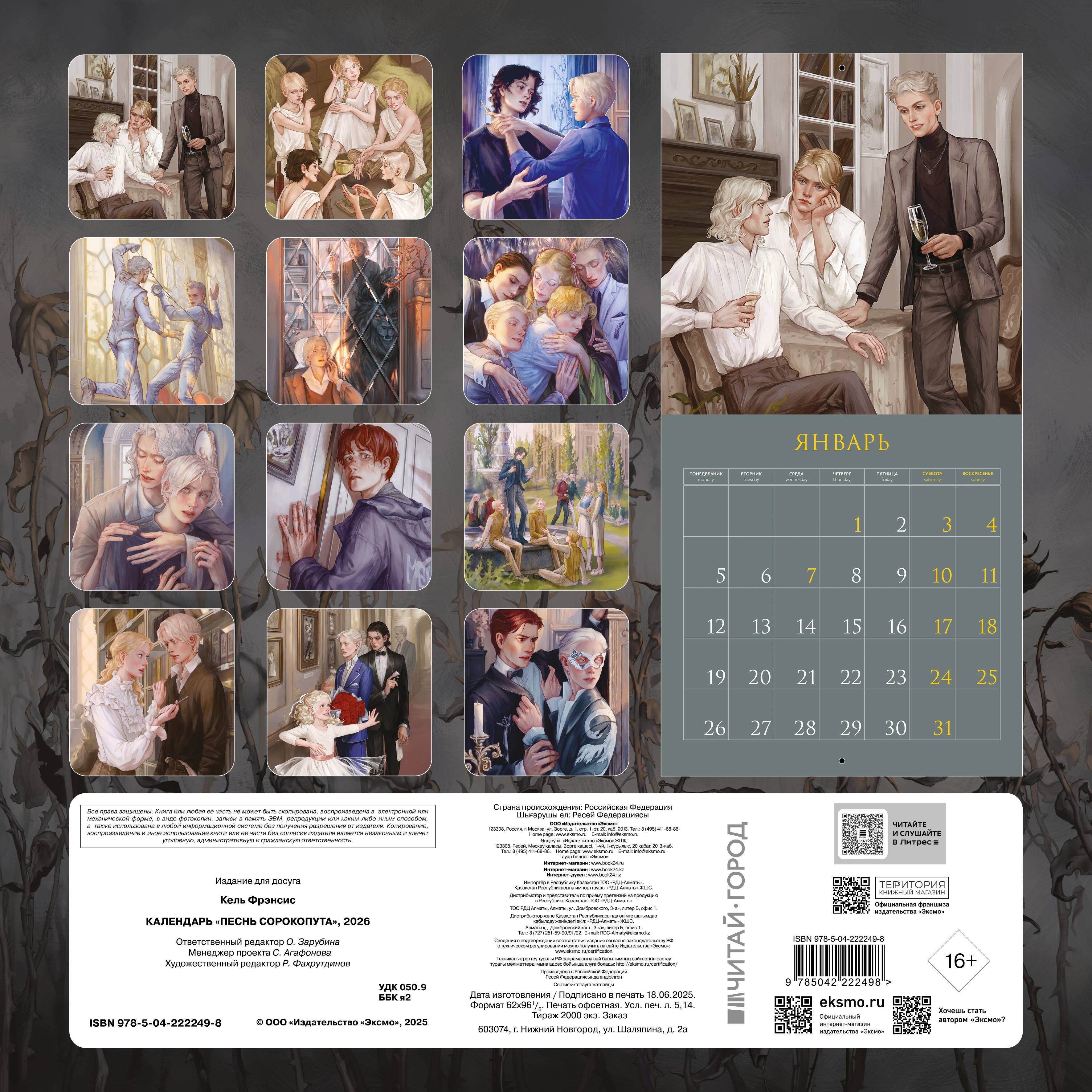 Календарь на 2026 год с сюжетными иллюстрациями из подарочного издания цикла «Песнь Сорокопута». Героев любимой истории изобразила Кристина Демина. Настенный календарь с иллюстрациями к подарочному изданию цикла Фрэнсис Кель «Песнь Сорокопута». Проблемы отцов и детей, классовое неравенство, дружба и семья, рассуждения о Сергее Дягилеве и Александре Македонском, поиск себя и истины, императорские интриги и дух революции - это «Песнь Сорокопута». В календаре отмечен день рождения фандома.| Издательство | ООО "Издательство "Эксмо" |