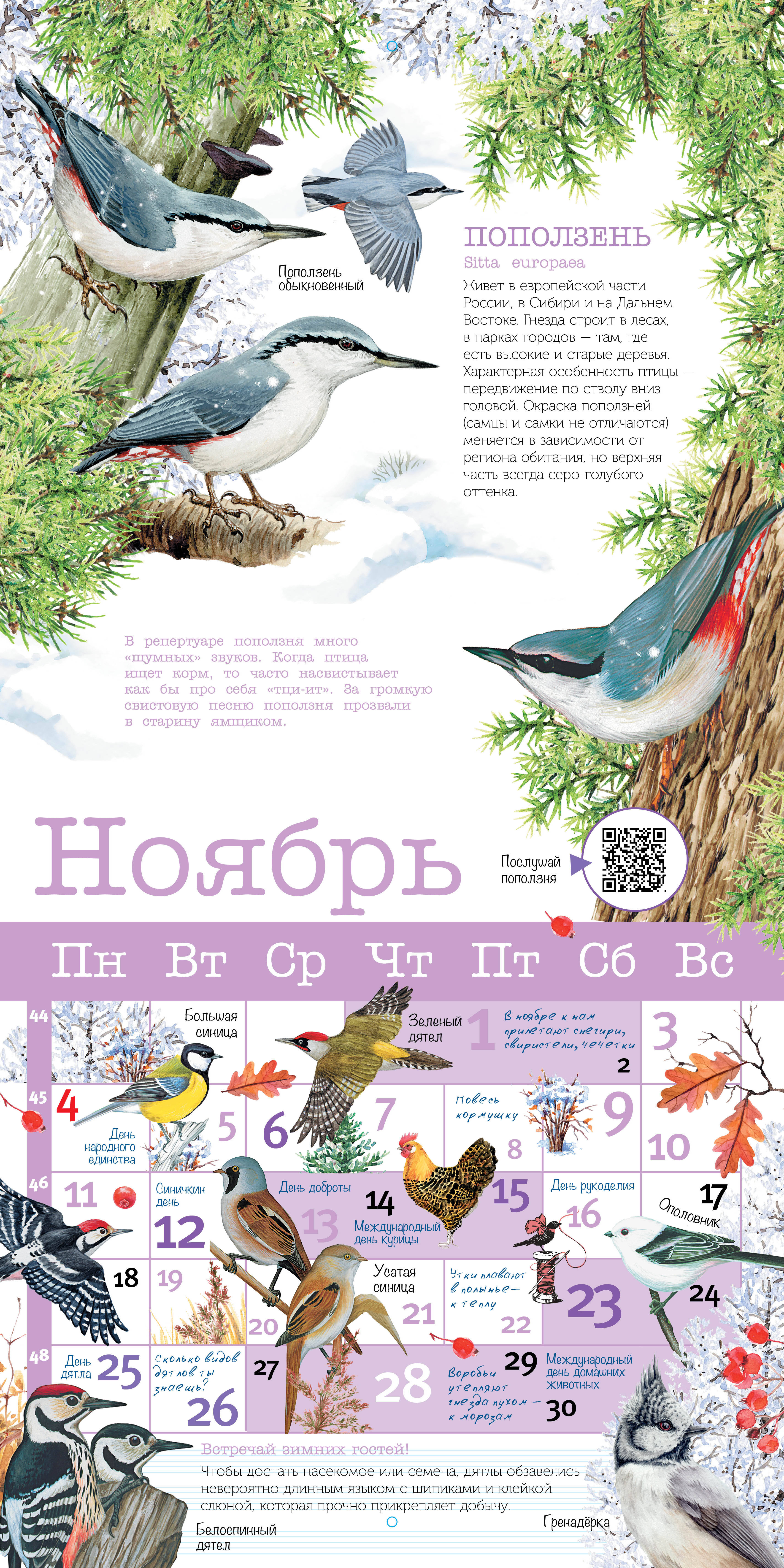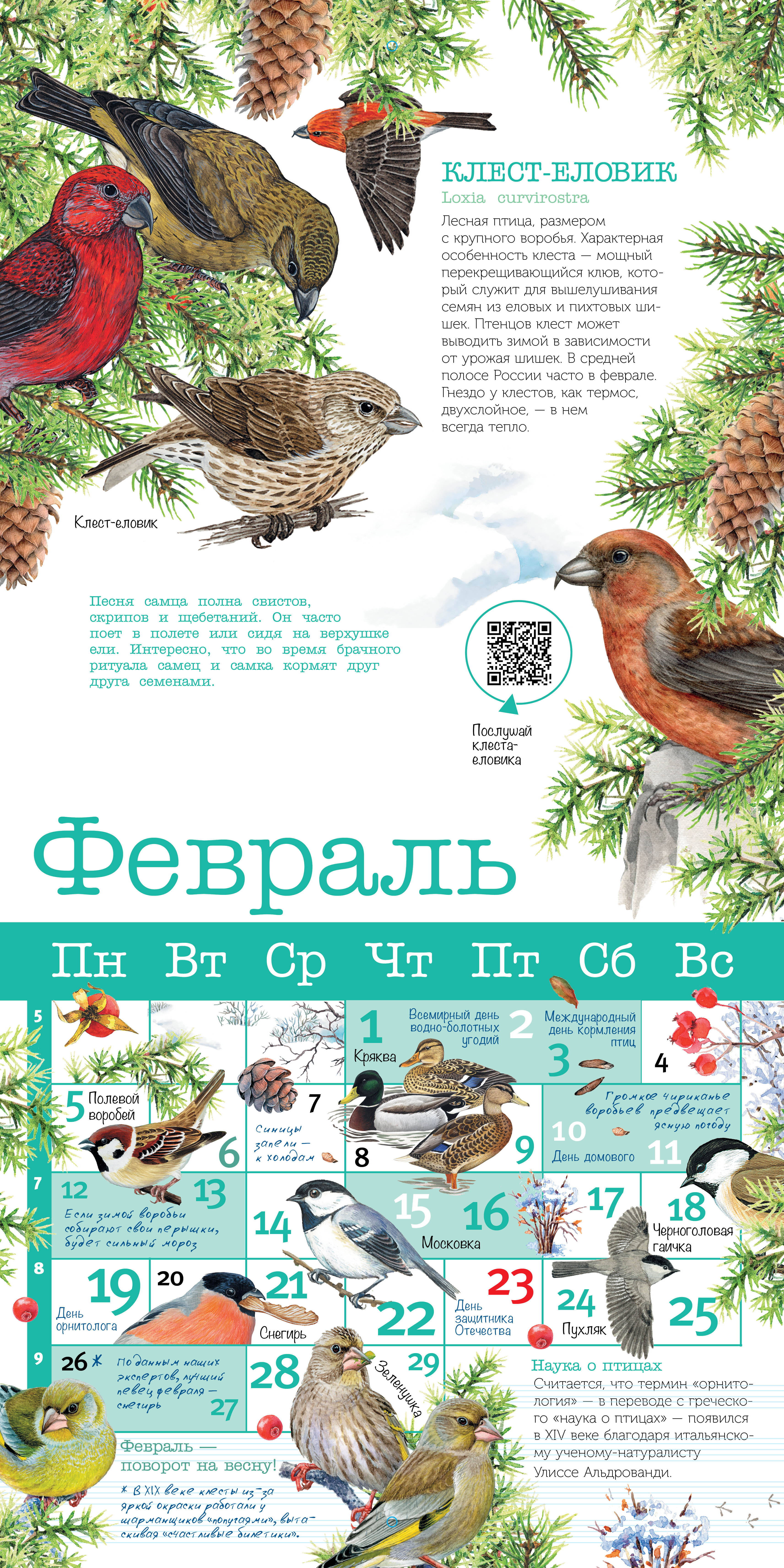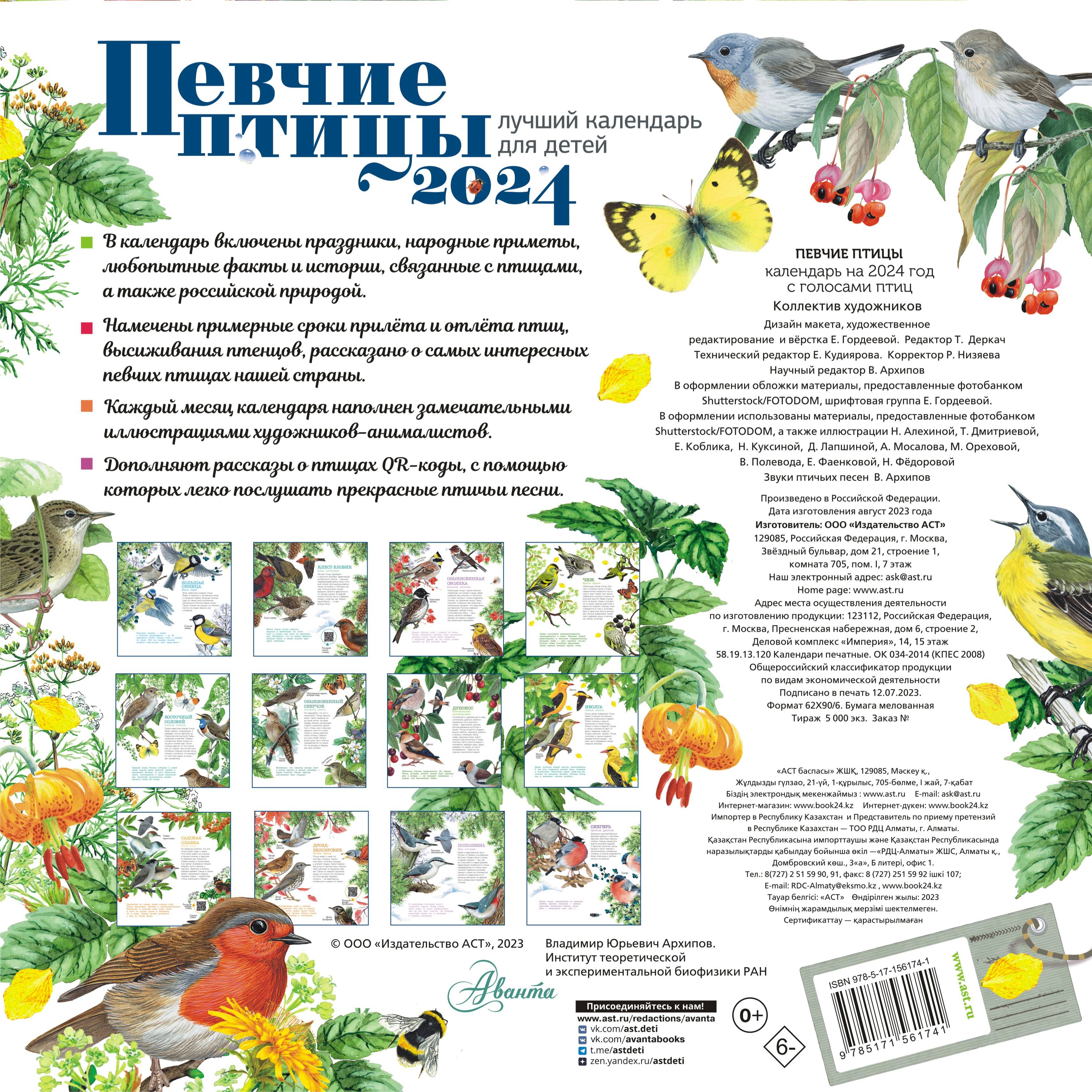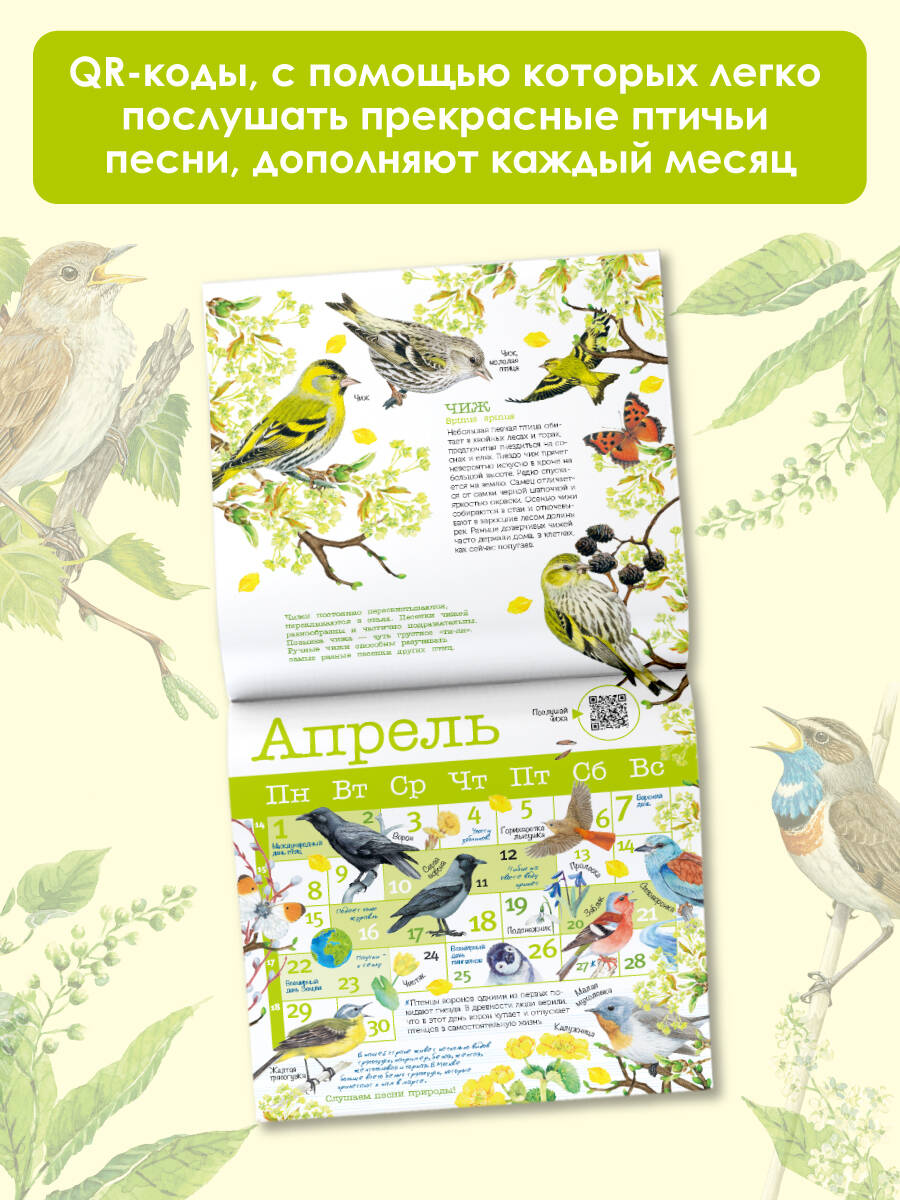 Познавательный календарь для школьников и всех любителей родной природы порадует интересной информацией, легендами, необычными праздниками, народными приметами, связанными с птицами нашей страны. В календаре много самой разнообразной информации о певчих птицах и их песнях, а также замечательные иллюстрации художников-анималистов. Все месяцы календаря посвящены известным певчем птицам, песни которых можно легко прослушать с помощью QR--кодов. Прекрасный подарок для любителей природы, а также в школьный класс начальной школы или кабинет биологии.| Издательство | ИЗДАТЕЛЬСТВО "АСТ" |