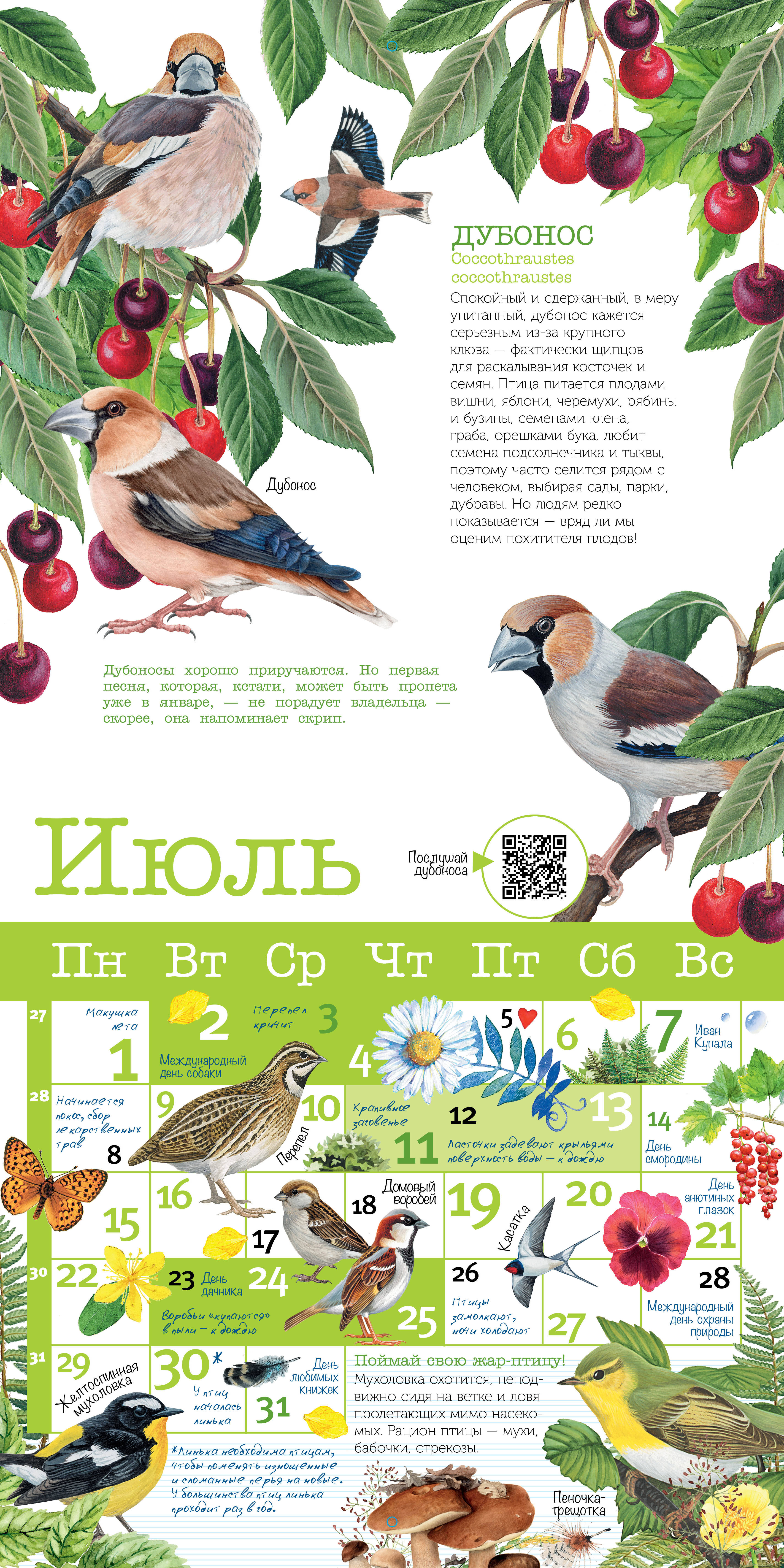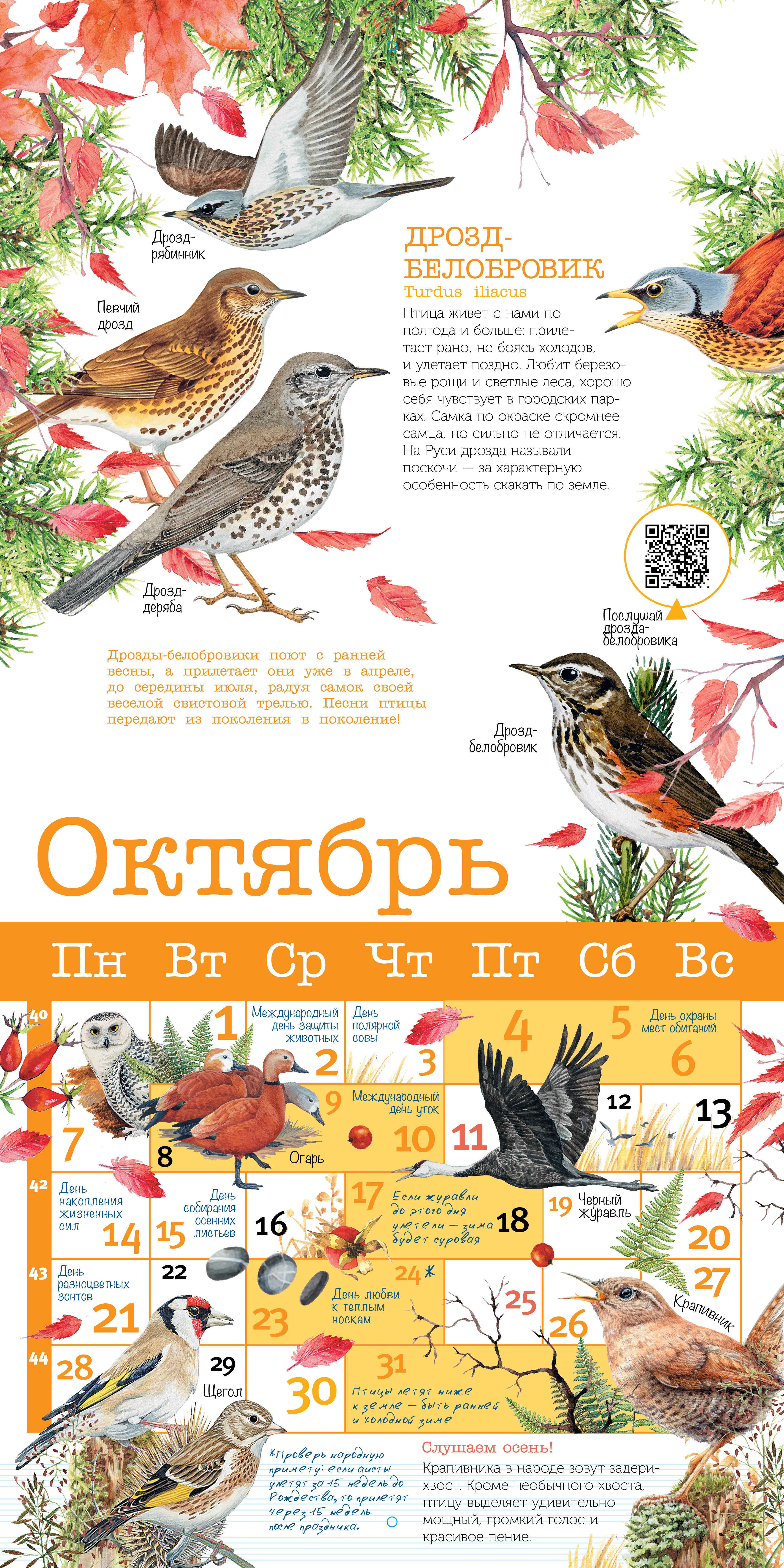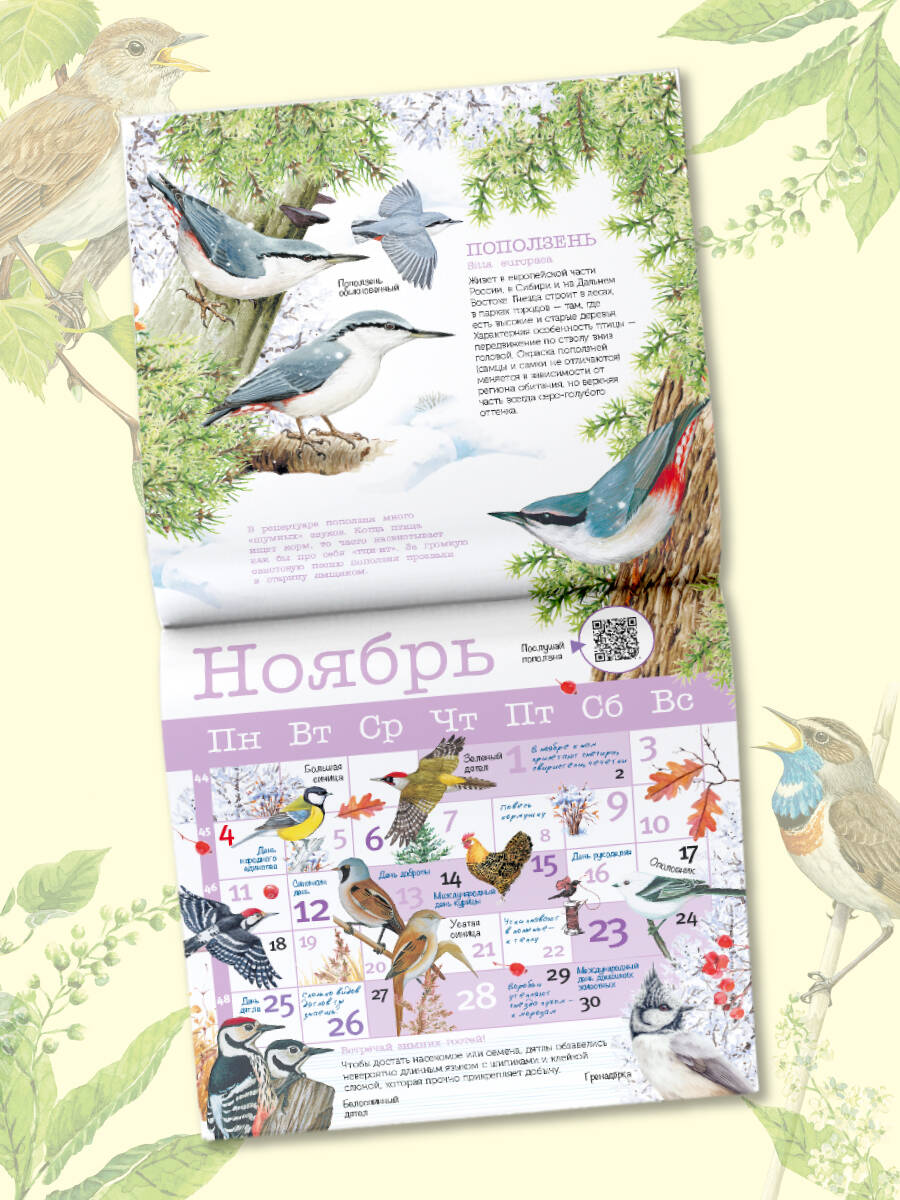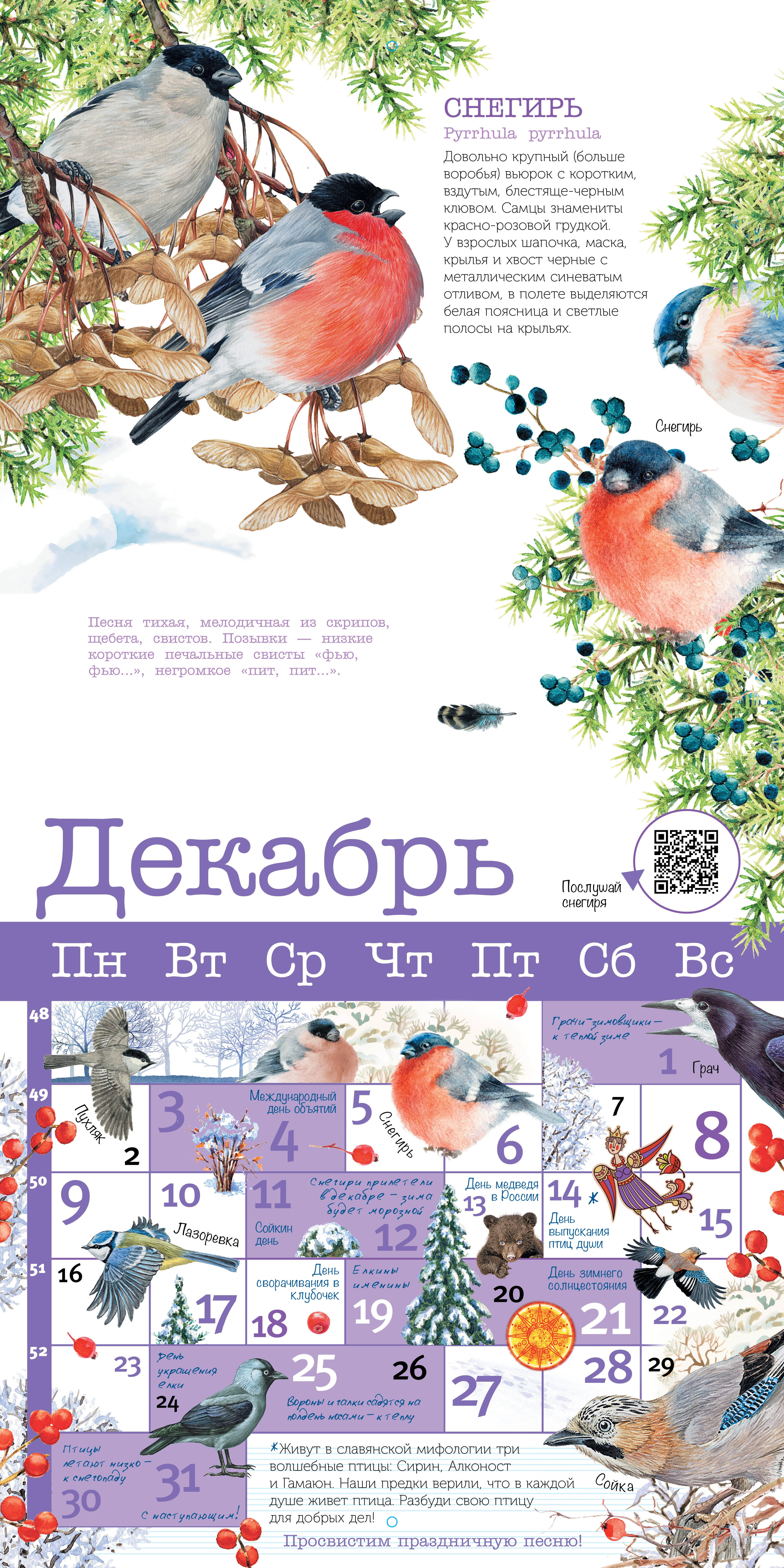 Познавательный календарь для школьников и всех любителей родной природы порадует интересной информацией, легендами, необычными праздниками, народными приметами, связанными с птицами нашей страны. В календаре много самой разнообразной информации о певчих птицах и их песнях, а также замечательные иллюстрации художников-анималистов. Все месяцы календаря посвящены известным певчем птицам, песни которых можно легко прослушать с помощью QR--кодов. Прекрасный подарок для любителей природы, а также в школьный класс начальной школы или кабинет биологии.| Издательство | ИЗДАТЕЛЬСТВО "АСТ" |
