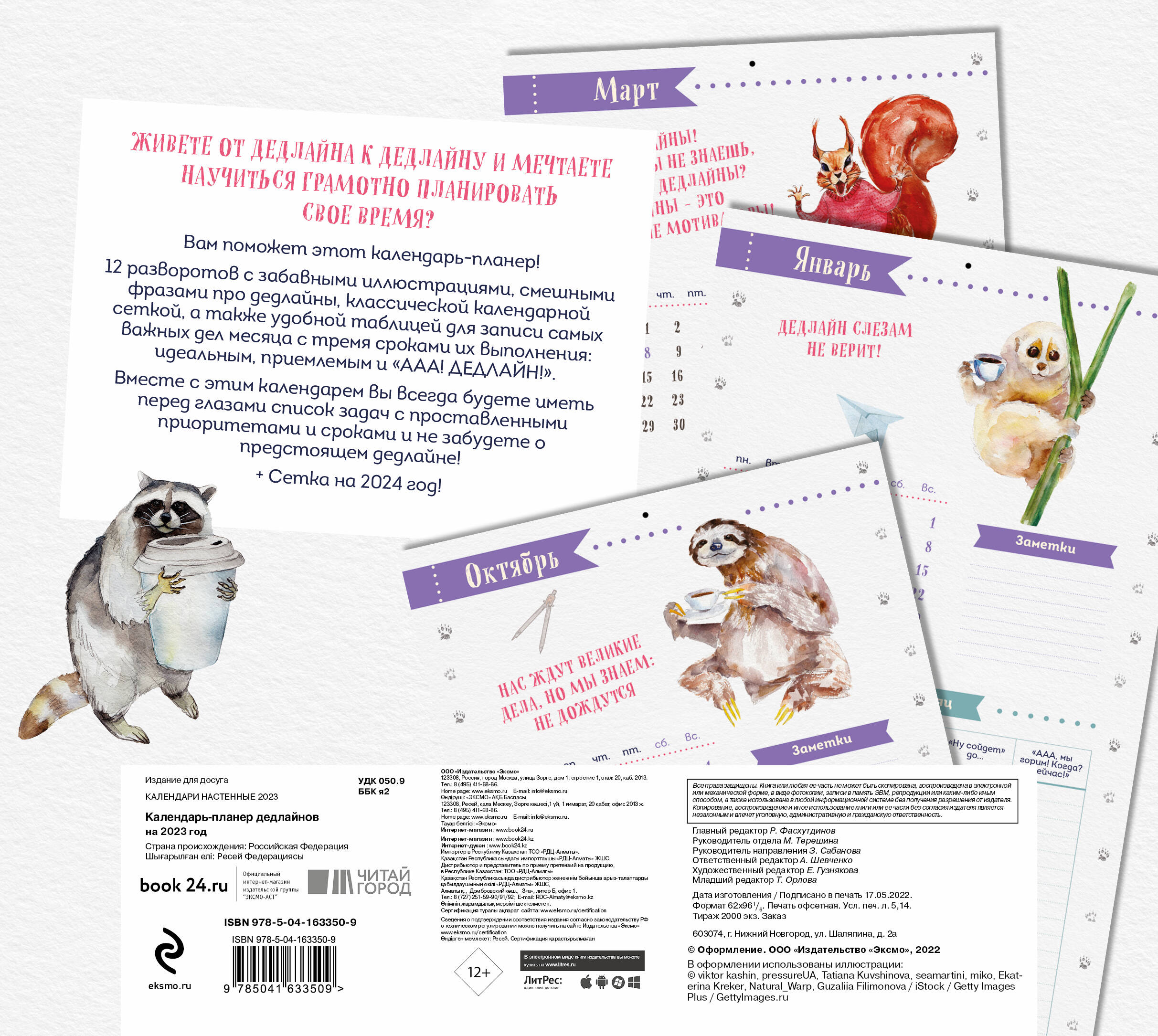 О серии: Наши настенные календари отличаются высоким качеством исполнения! Тщательно подобранные иллюстрации, напечатанные на глянцевой бумаге высочайшего качества, станут настоящим украшением дома, а в календарной сетке найдется место для ваших планов: большие клетки позволят делать записи и организовать свой год! В календаре также отмечены все государственные праздники. В серии настенных календарей издательства «ЭКСМО» каждый найдет тему по вкусу: великие художники, великолепные подборки с самыми знаменитыми произведениями искусства, легендарные кинематографические саги и игры, главные книжные авторы и бестселлеры, фотографии и иллюстрации любимых животных и многое-многое другое! О календаре: ДЕДЛАЙН! От этого слова у каждого человека дергается глаз, трясутся руки, а сердце ненамеренно пропускает удар. Как бы мы ни ненавидели дедлайны, но именно они позволяют в полной мере раскрыть потенциал и помогают понять, что ВОЗМОЖНО ВСЕ. Не зря же говорят: «Если ты быстрый, ловкий и креативный, значит, сейчас дедлайн» или «Без дедлайнов не узнаешь возможностей свой команды». Этот календарь-планер поможет вам ставить задачи на месяц и следить за их выполнением. Внутри вы найдете 12 разворотов с забавной иллюстрацией, смешной фразой про дедлайны, классической календарной сеткой, а также удобной таблицей для записи самых важных дел на месяц с тремя сроками их выполнения: идеальным, приемлемым и «ААА! ДЕДЛАЙН!». Вместе с этим календарем вы не вспомните о дедлайне на следующий день после его окончания и всегда будете иметь перед глазами список задач с проставленными приоритетами и сроками! Технические параметры: - Тип календаря - настенный перекидной. - Год - 2023. - Календарная сетка - с разбивкой по месяцам. - Вид скрепления - скрепка. - Ширина - 24,5 см. - Высота - 28 см. - Внутренний блок - офсетная бумага 120 г/м2. - Подложка - плотный гофрокартон для поддержания формы. - Индивидуальная упаковка в плотный целлофановый пакет.