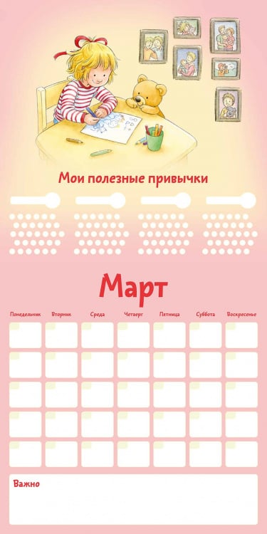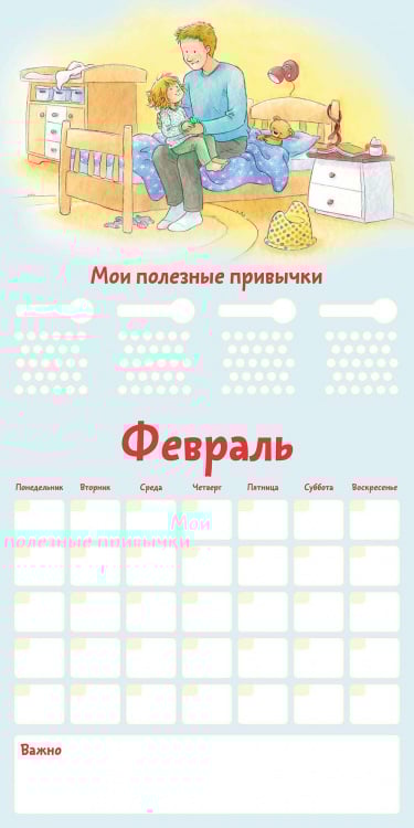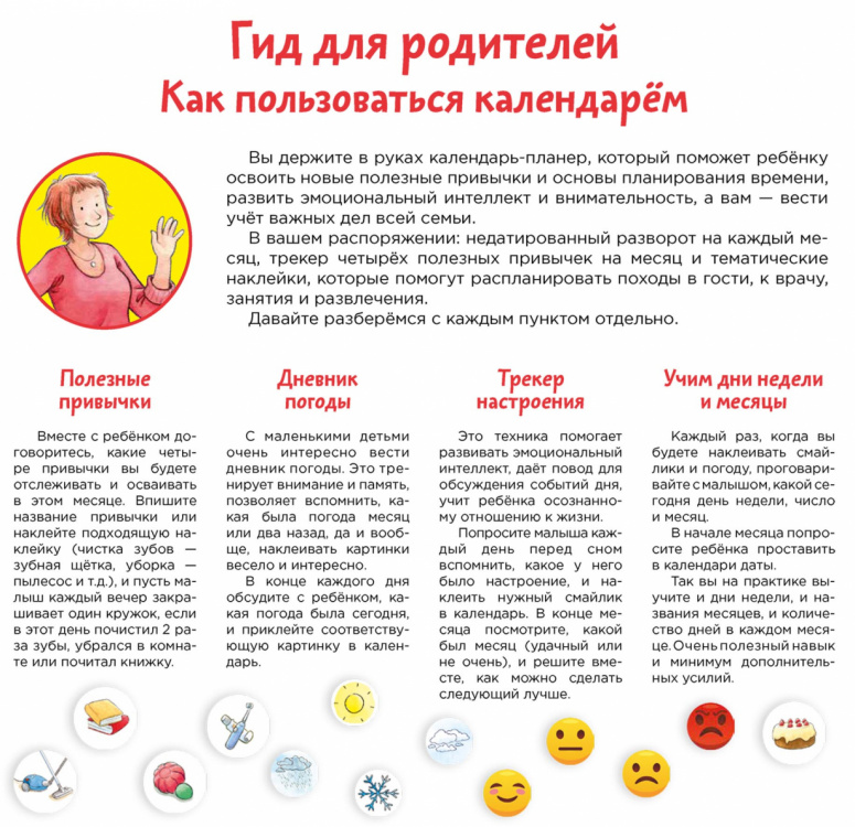 С нашим календарем-планером ребенок наконец станет регулярно чистить зубы (читать книги / убираться в комнате / делать зарядку / подставьте свой вариант) и освоит основы планирования времени. Отслеживание настроения в течение дня и наблюдение за погодой помогут развить эмоциональный интеллект и внимательность. Ну а взрослые смогут планировать важные дела для всей семьи.