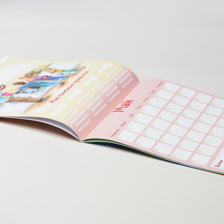 Полноцветные иллюстрации, плотная немелованная бумага, на которой удобно писать, яркие наклейки для облегчения планирования и ведения записей.