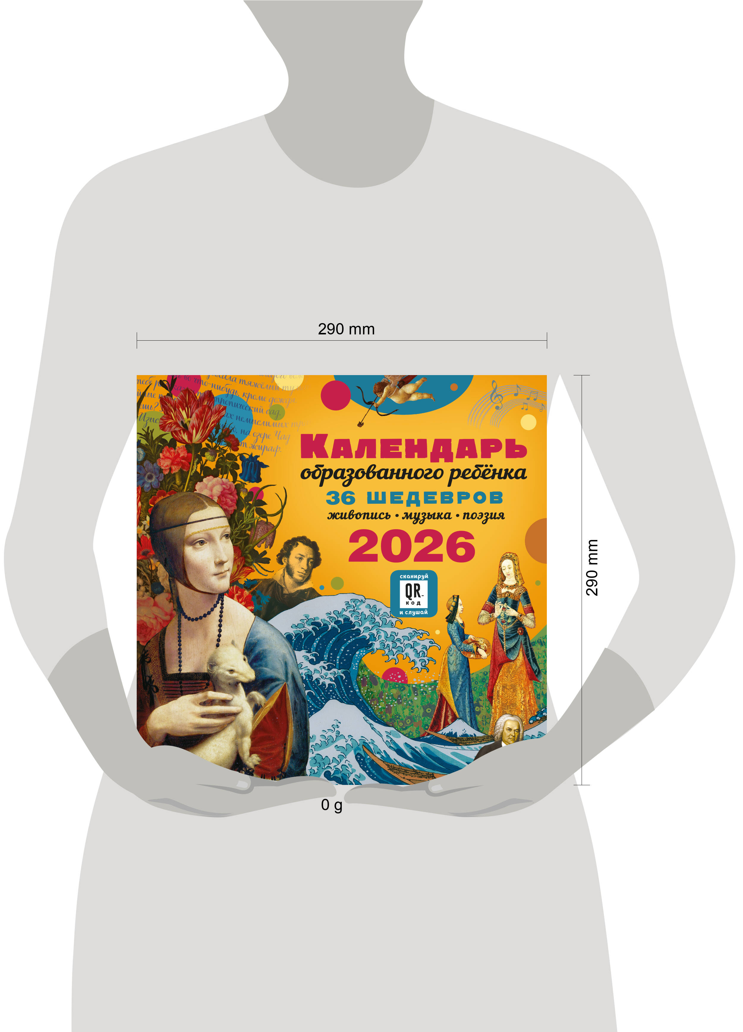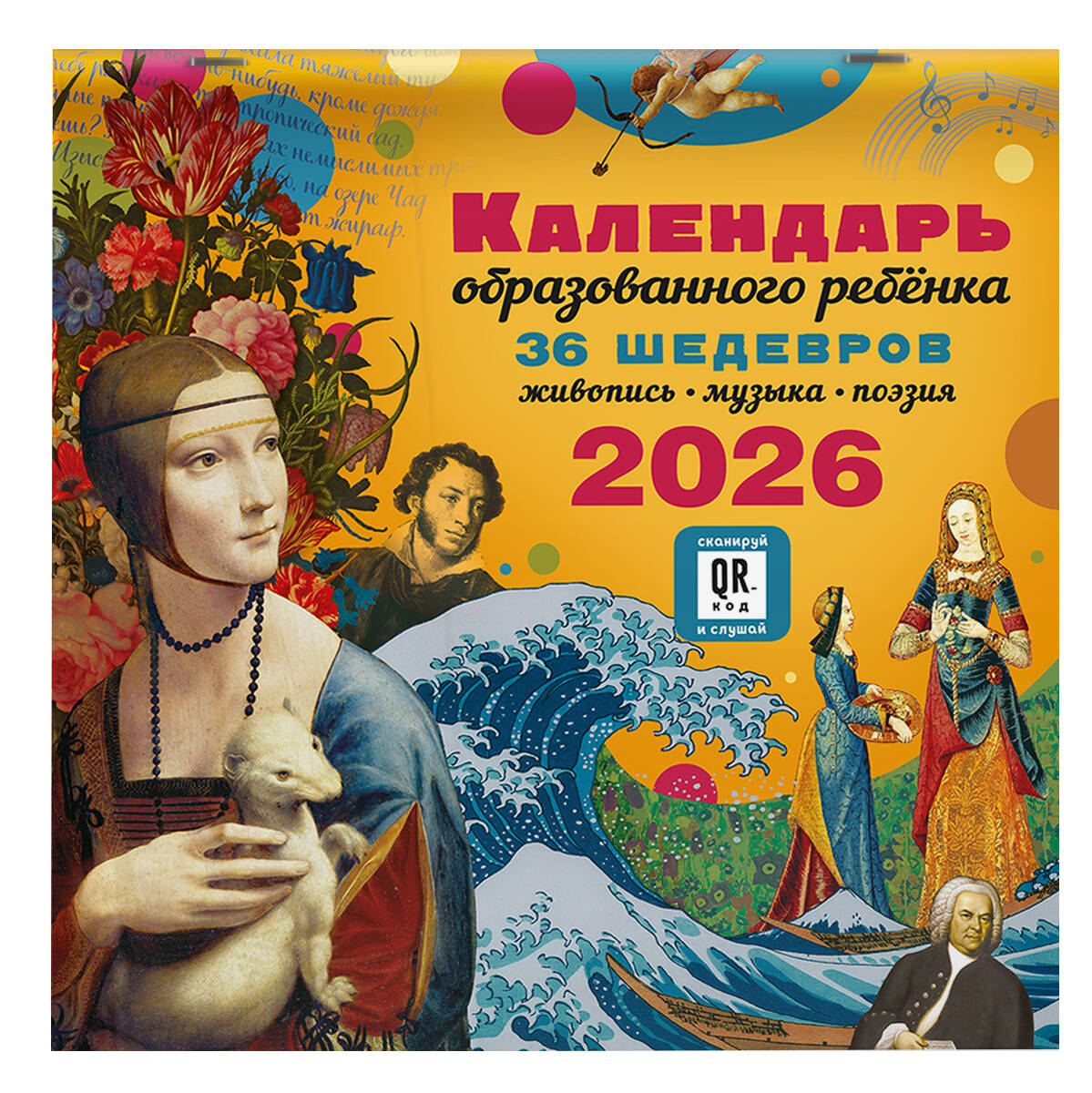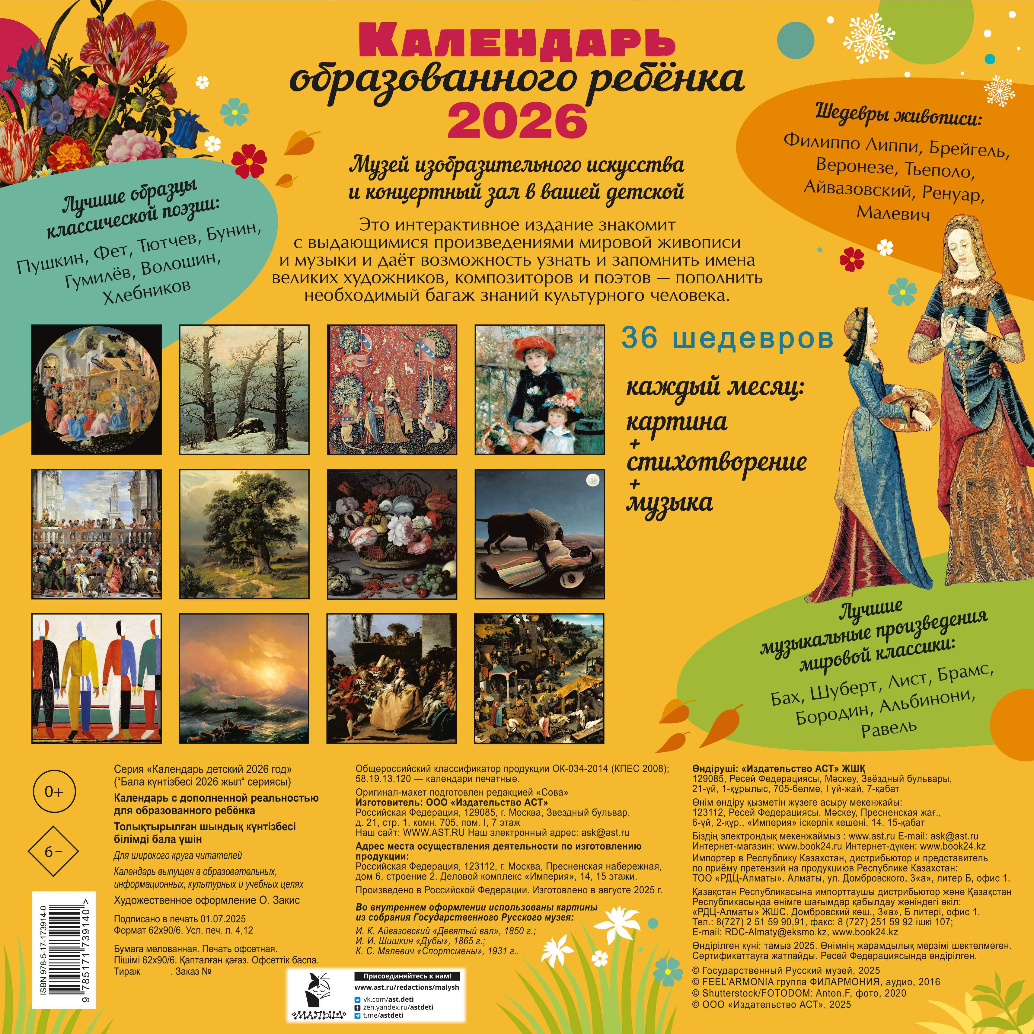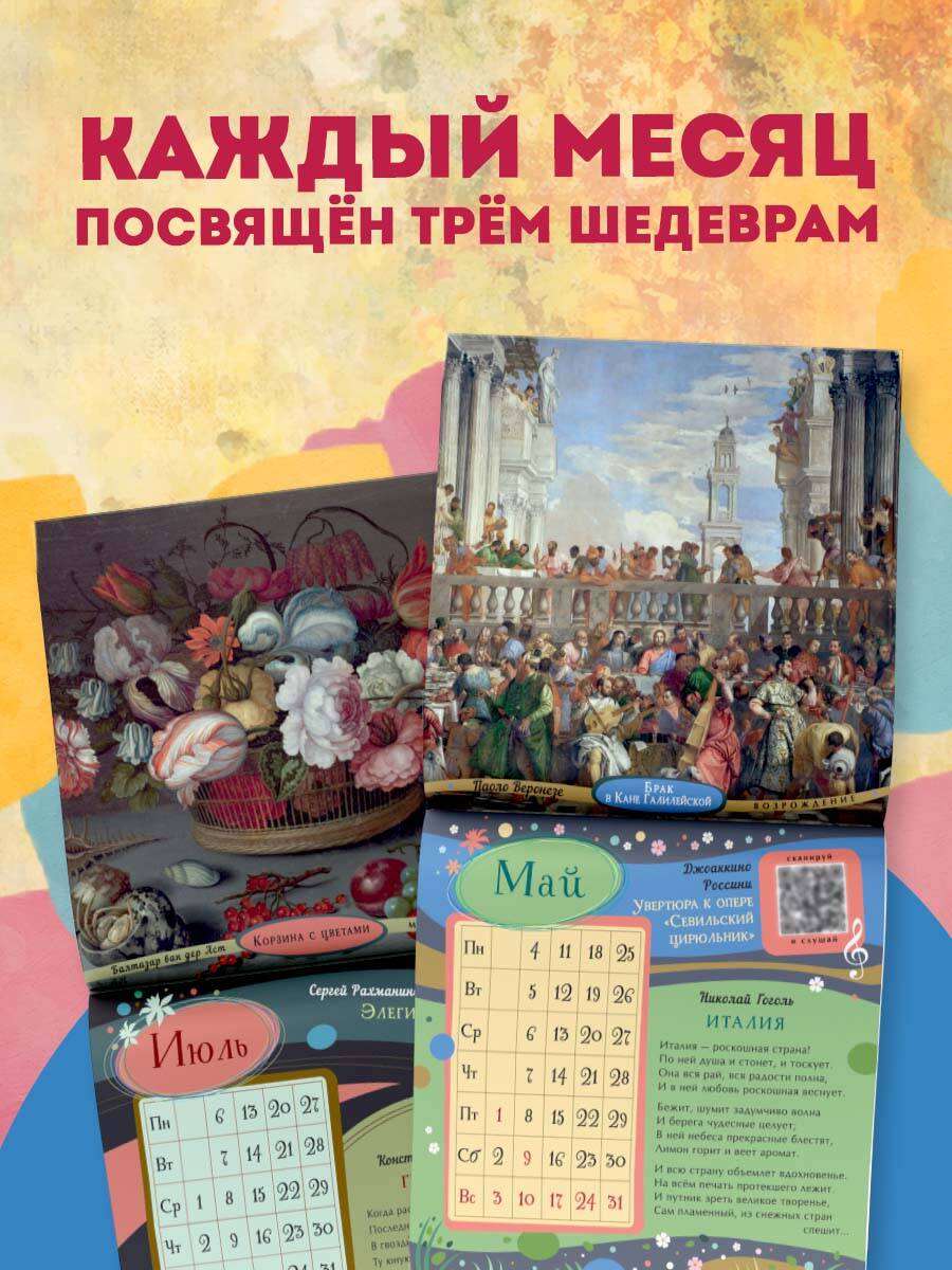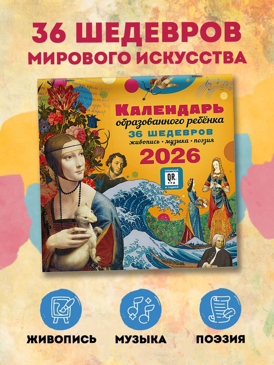 Интерактивный «Календарь для образованного ребёнка» на 2026 год - это концертный зал, художественная галерея и библиотека в вашей детской. Мы дарим вашему ребёнку возможность познакомиться с 36 шедеврами мирового искусства, не выходя из дома! Каждый месяц посвящён трём шедеврам в области живописи, музыки, поэзии. Знаменитые картины великих художников Веронезе, Брейгеля, Ренуара, Малевича, Айвазовского, Шишкина сопровождены известными поэтическими произведениями русских классиков. QR-код на каждом развороте календаря ведёт на страницы с живым исполнением инструментальных шедевров Баха, Рахманинова, Паганини, Шуберта... Ваш ребёнок узнает имена великих художников, поэтов и композиторов, запомнит названия известных произведений и сможет узнавать шедевры мировой живописи, музыки и поэзии не только как «картинка с фантика», «песня с рингтона» и «Пушкин, наверное»... Это великолепное издание - прекрасный подарок ребёнку и самый простой способ пополнить необходимый багаж знаний культурного человека.| Издательство | Издательство "АСТ" |