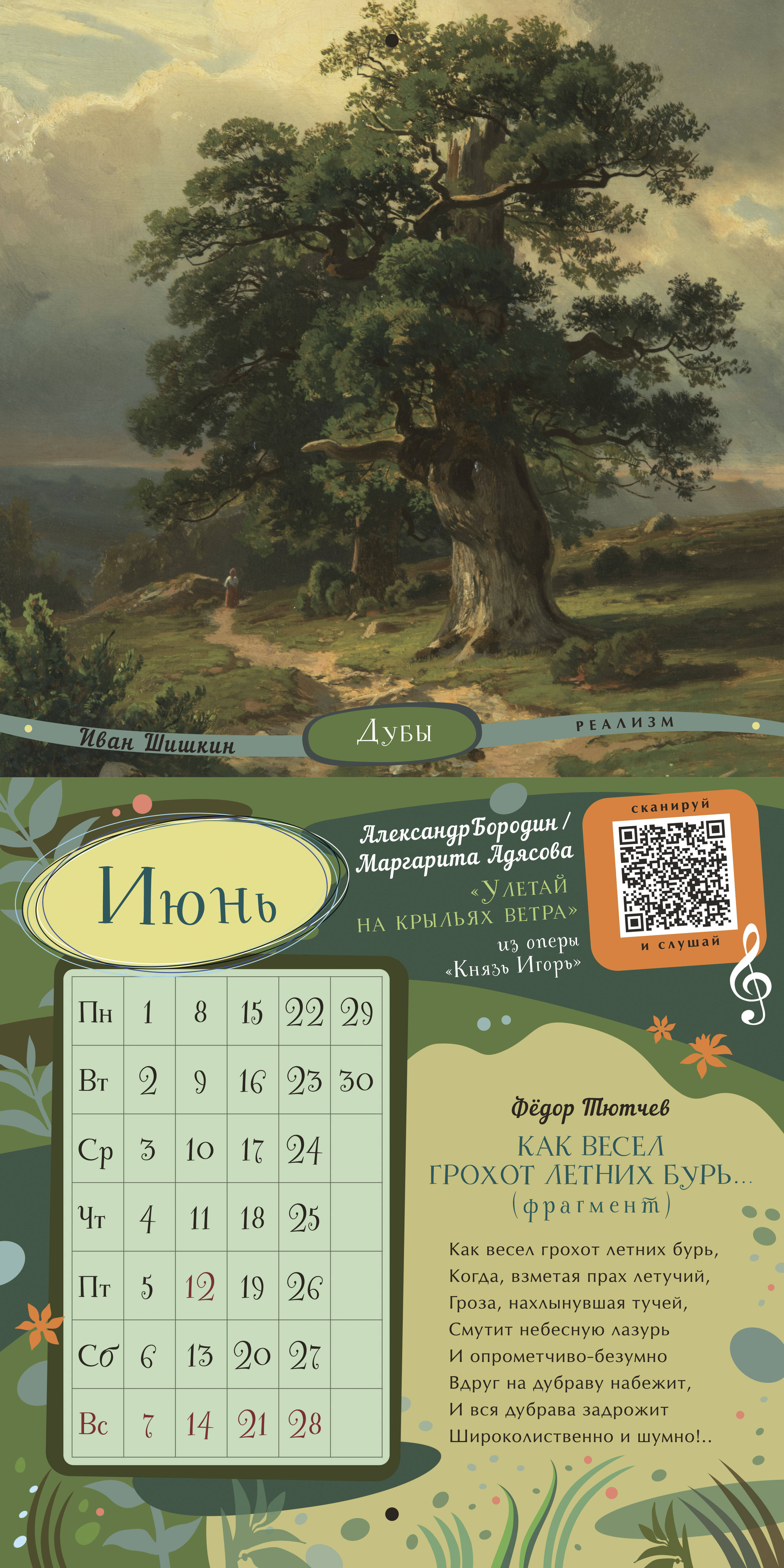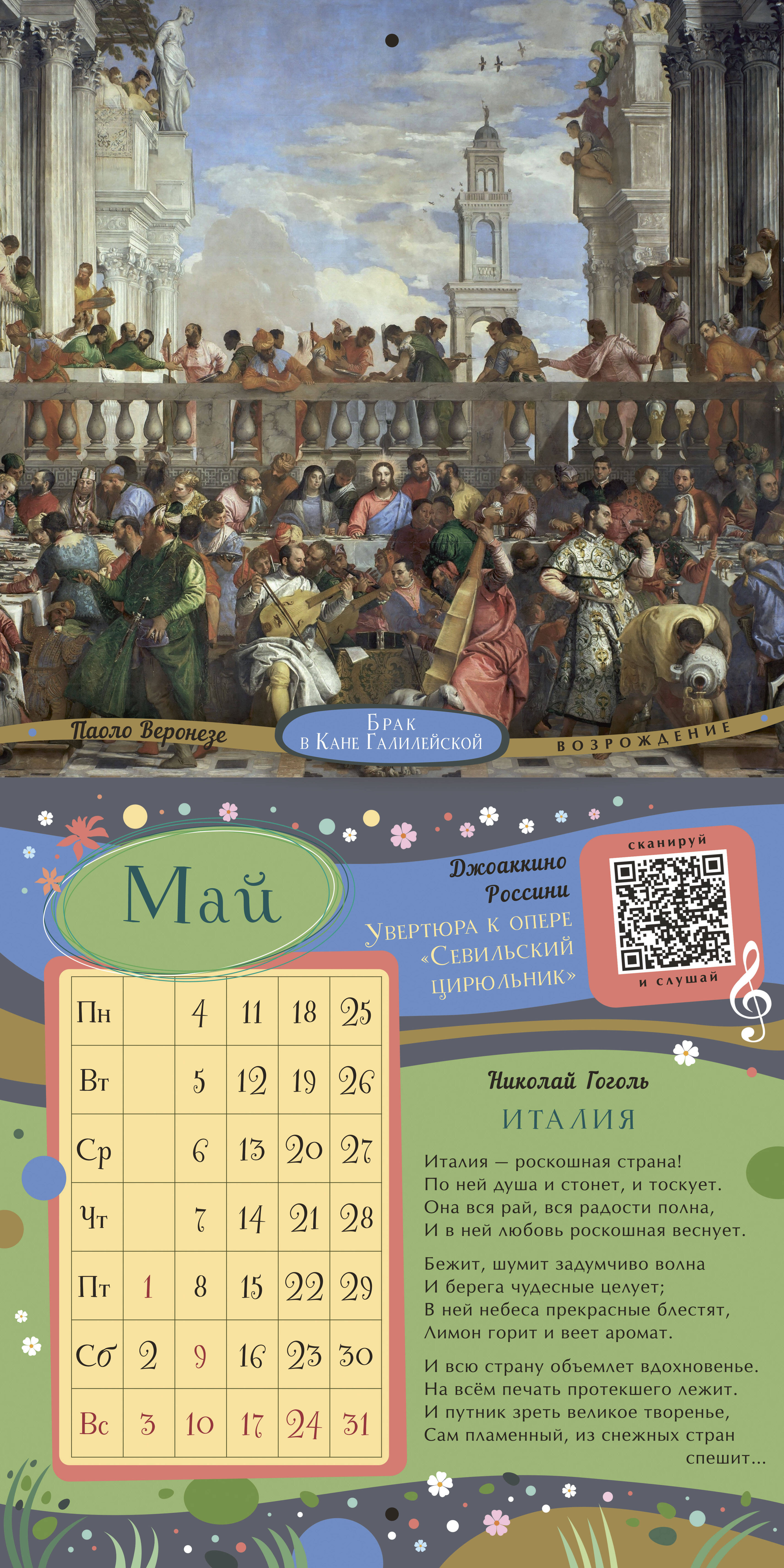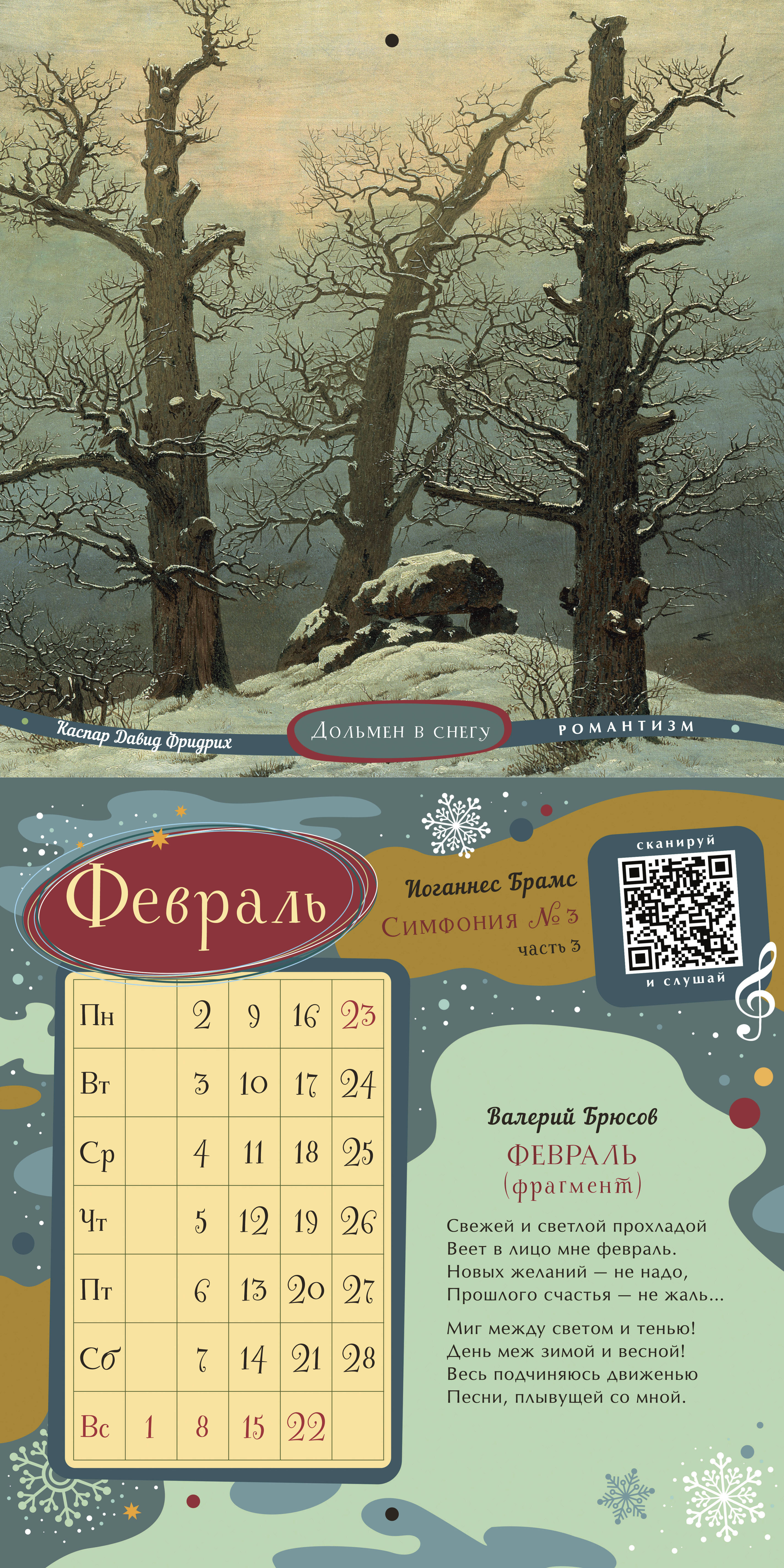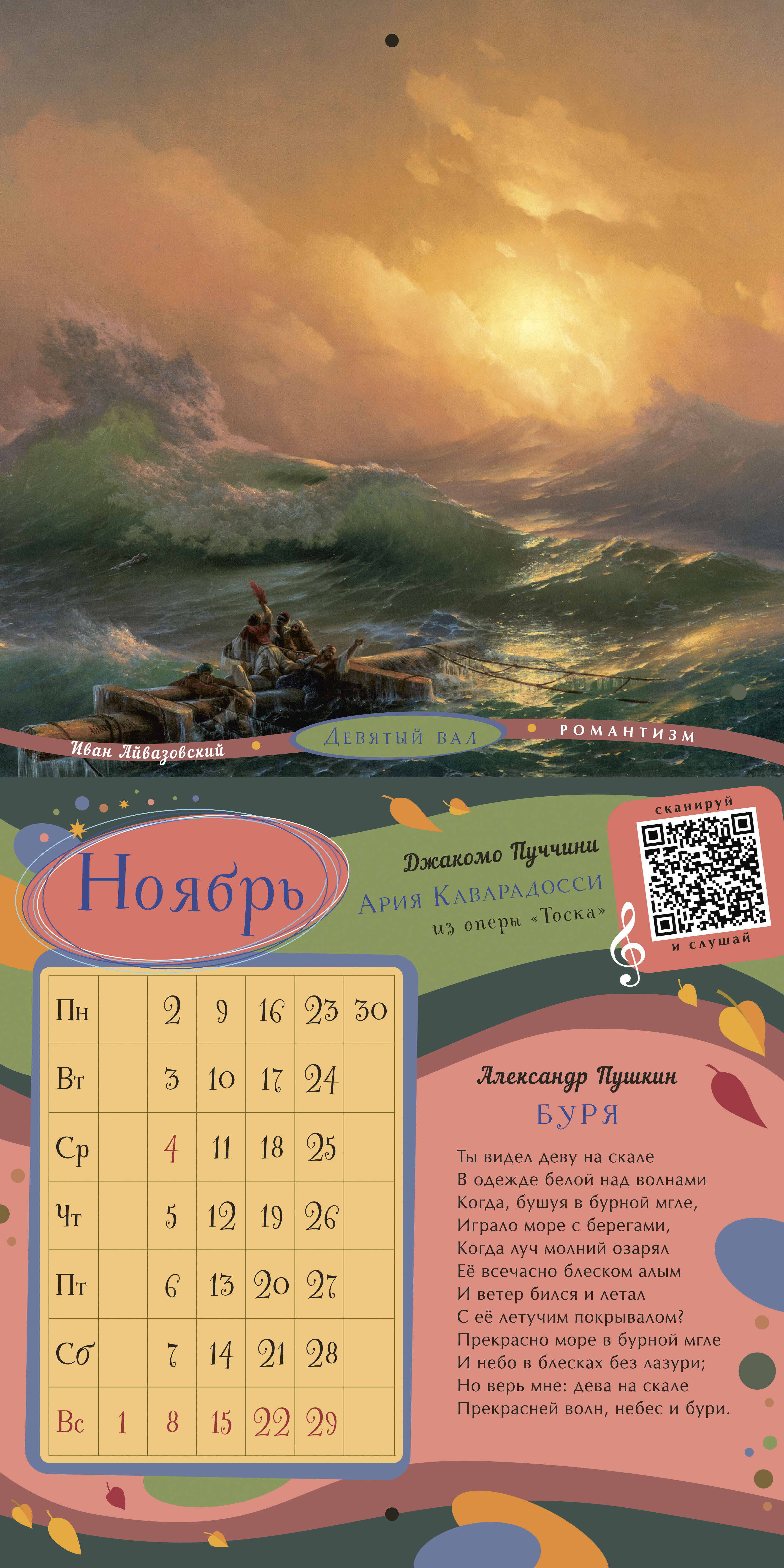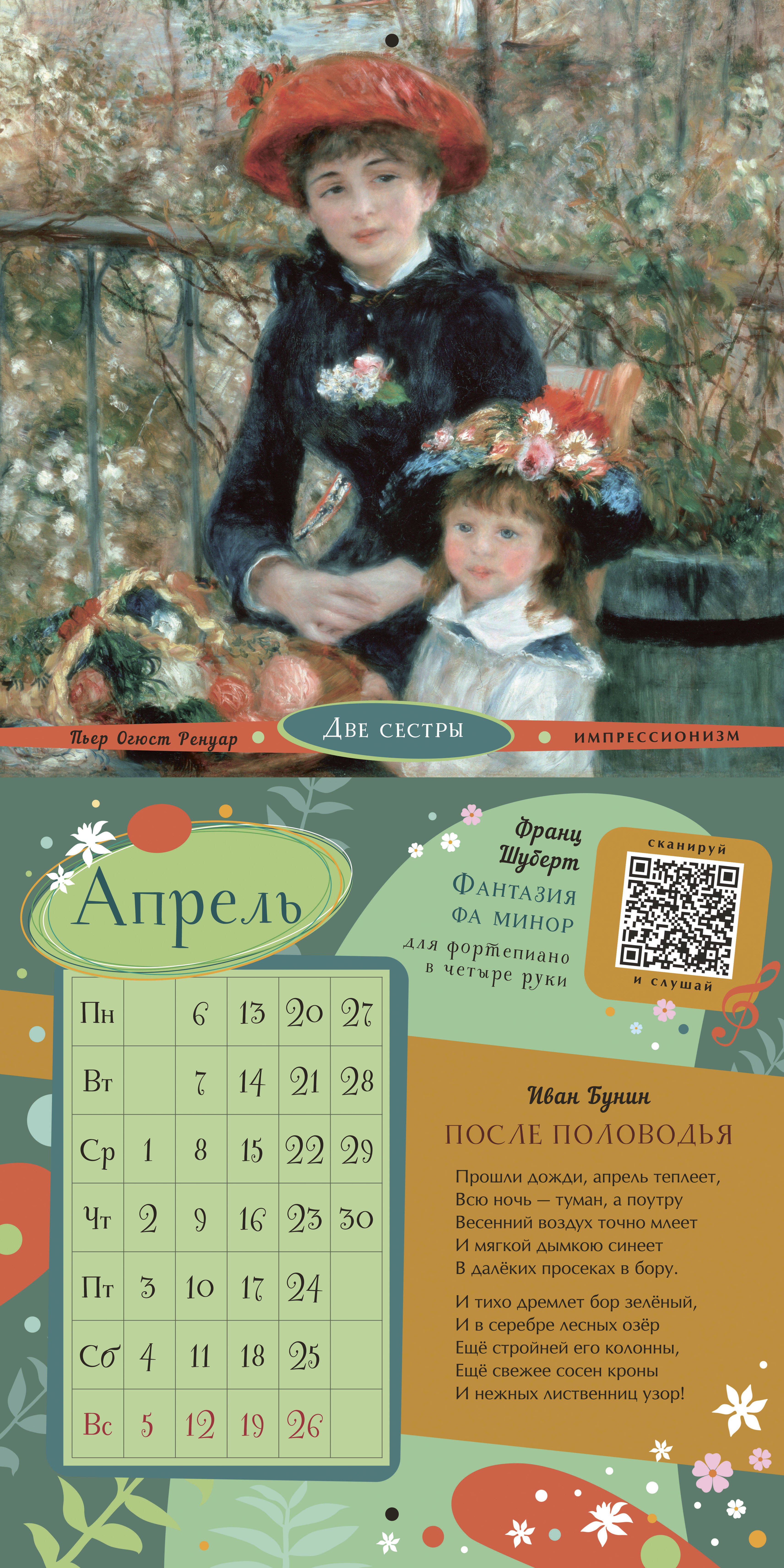 Интерактивный «Календарь для образованного ребёнка» на 2026 год - это концертный зал, художественная галерея и библиотека в вашей детской. Мы дарим вашему ребёнку возможность познакомиться с 36 шедеврами мирового искусства, не выходя из дома! Каждый месяц посвящён трём шедеврам в области живописи, музыки, поэзии. Знаменитые картины великих художников Веронезе, Брейгеля, Ренуара, Малевича, Айвазовского, Шишкина сопровождены известными поэтическими произведениями русских классиков. QR-код на каждом развороте календаря ведёт на страницы с живым исполнением инструментальных шедевров Баха, Рахманинова, Паганини, Шуберта... Ваш ребёнок узнает имена великих художников, поэтов и композиторов, запомнит названия известных произведений и сможет узнавать шедевры мировой живописи, музыки и поэзии не только как «картинка с фантика», «песня с рингтона» и «Пушкин, наверное»... Это великолепное издание - прекрасный подарок ребёнку и самый простой способ пополнить необходимый багаж знаний культурного человека.| Издательство | Издательство "АСТ" |