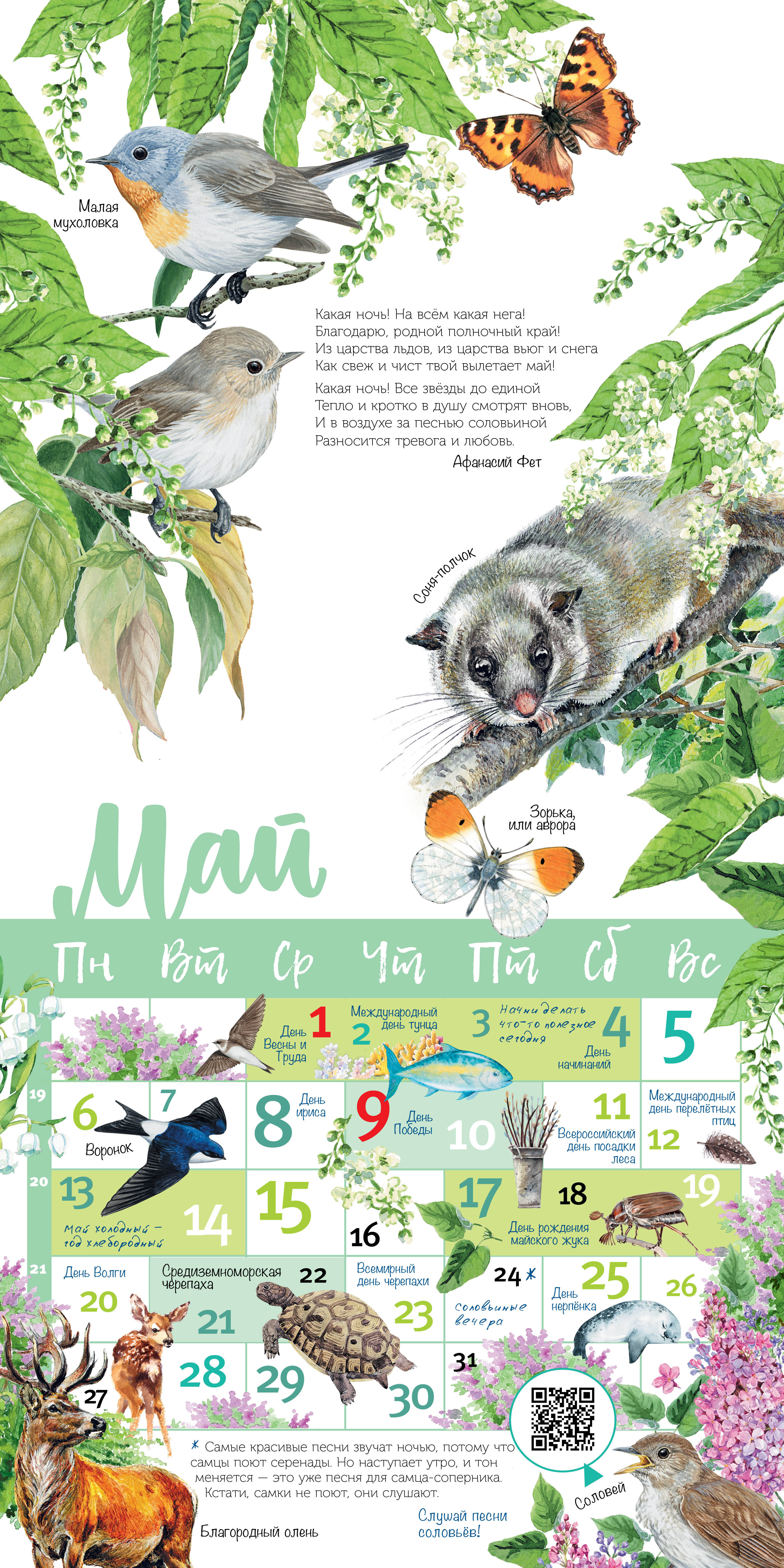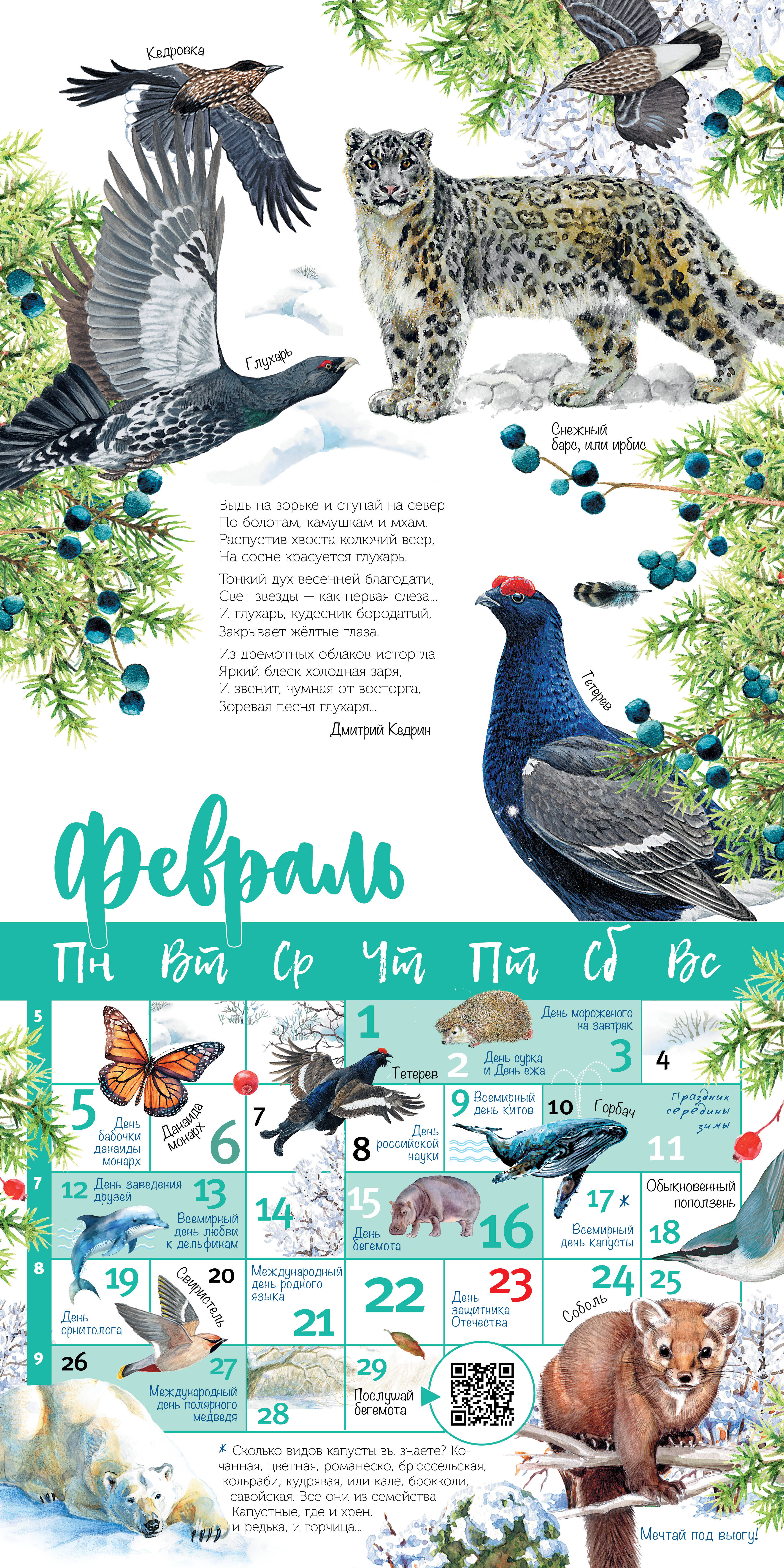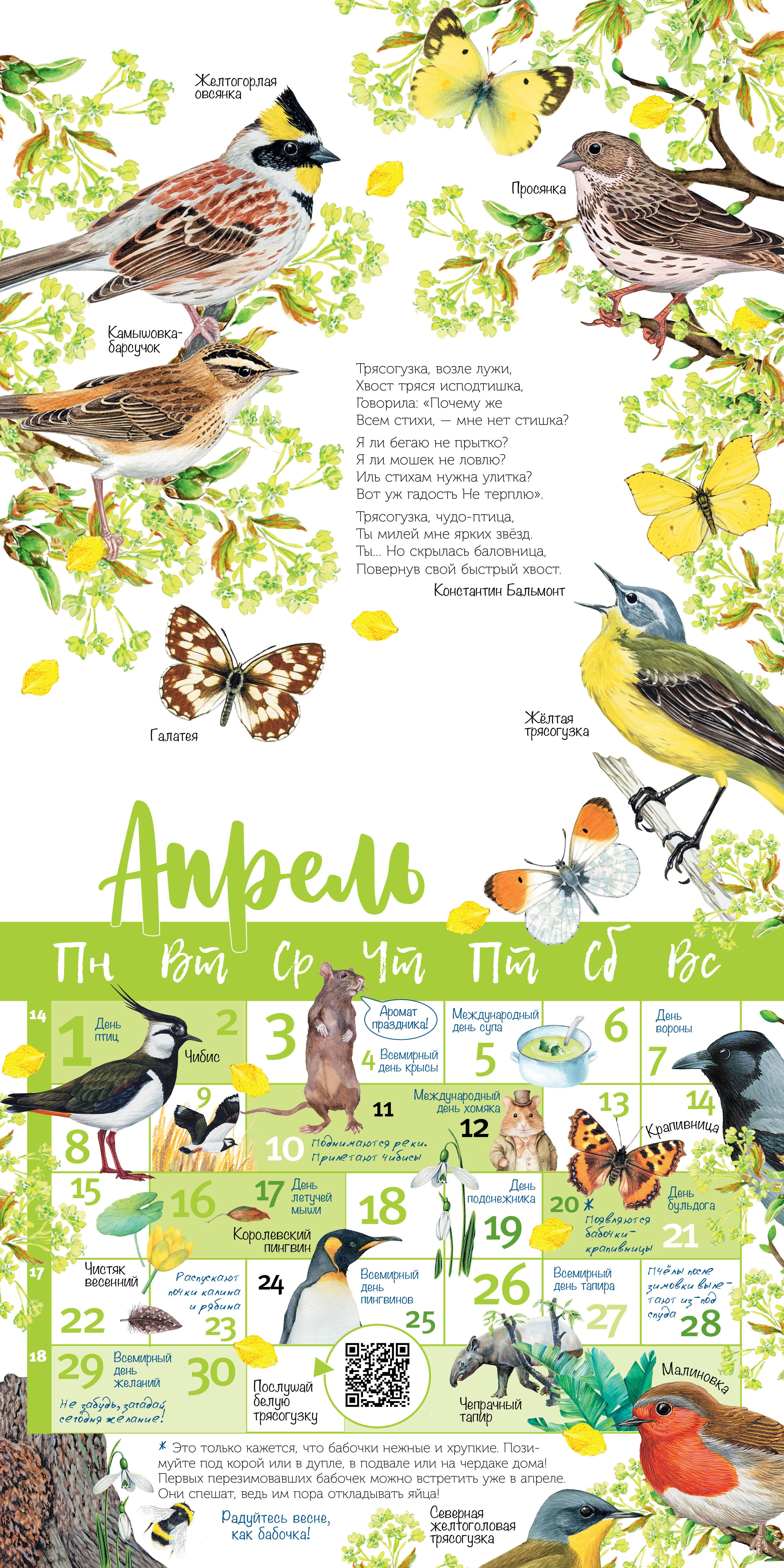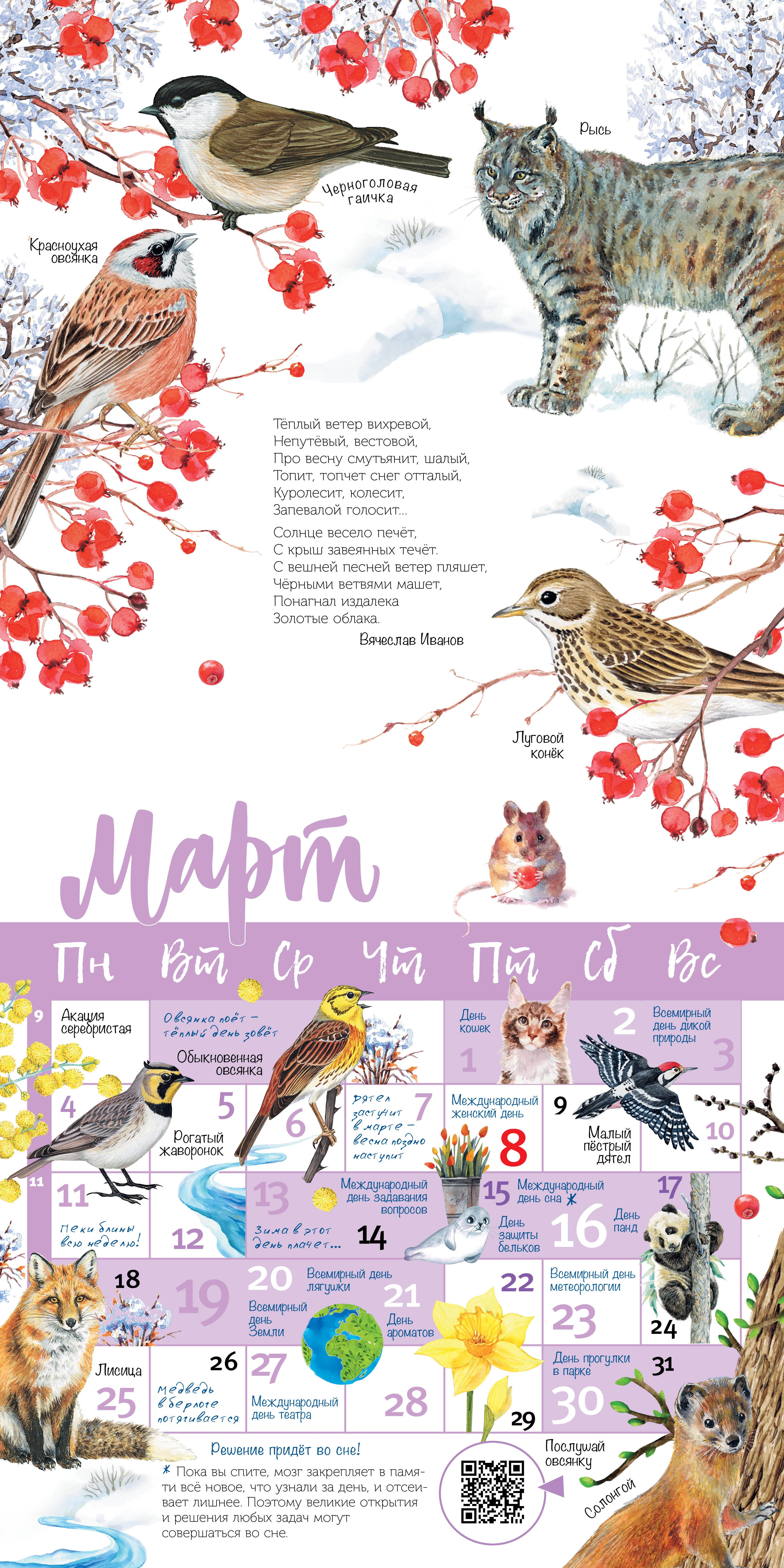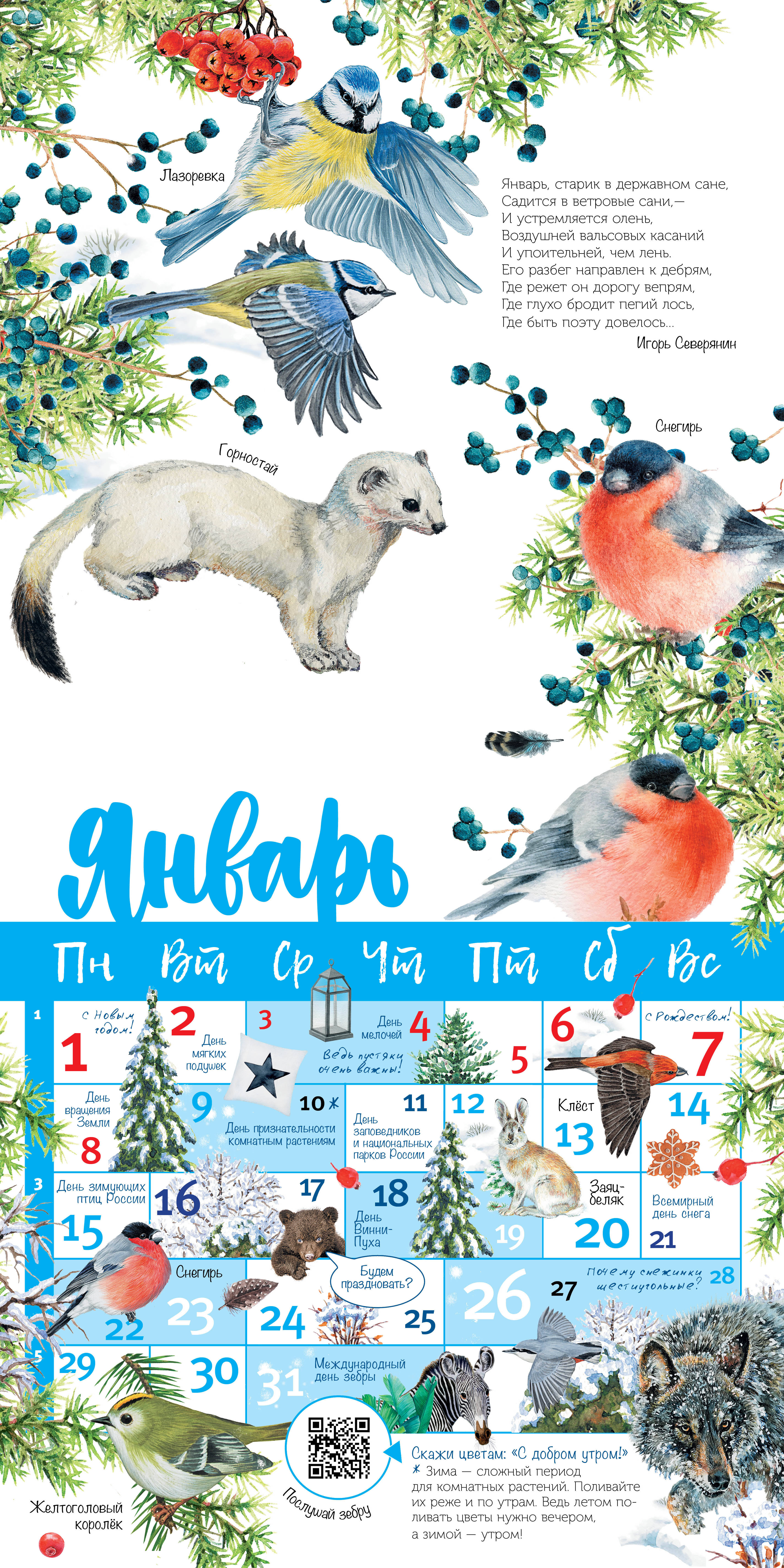 Каждый год редакция "Аванты" делает заново удивительный познавательный календарь, который полюбился многим читателям. Ведь в этом календаре собрана интересная и полезная для всех любителей природы, в том числе самых юных, разнообразнейшая нформация о нашей природе: факты, легенды, праздники, народные приметы, наблюдения за погодой. В календаре намечены примерные сроки прилёта и отлёта птиц, цветения растений и и другие природные явления. Каждый месяц календаря украшают удивительные по красоте и реалистичности иллюстрации, а также прекрасные стихи о природе русских поэтов. Дополняют каждый месяц OR-коды с голосами птиц и зверей. Для всех любителей природы, для школьников младшей школы и средней школы| Издательство | ИЗДАТЕЛЬСТВО "АСТ" |