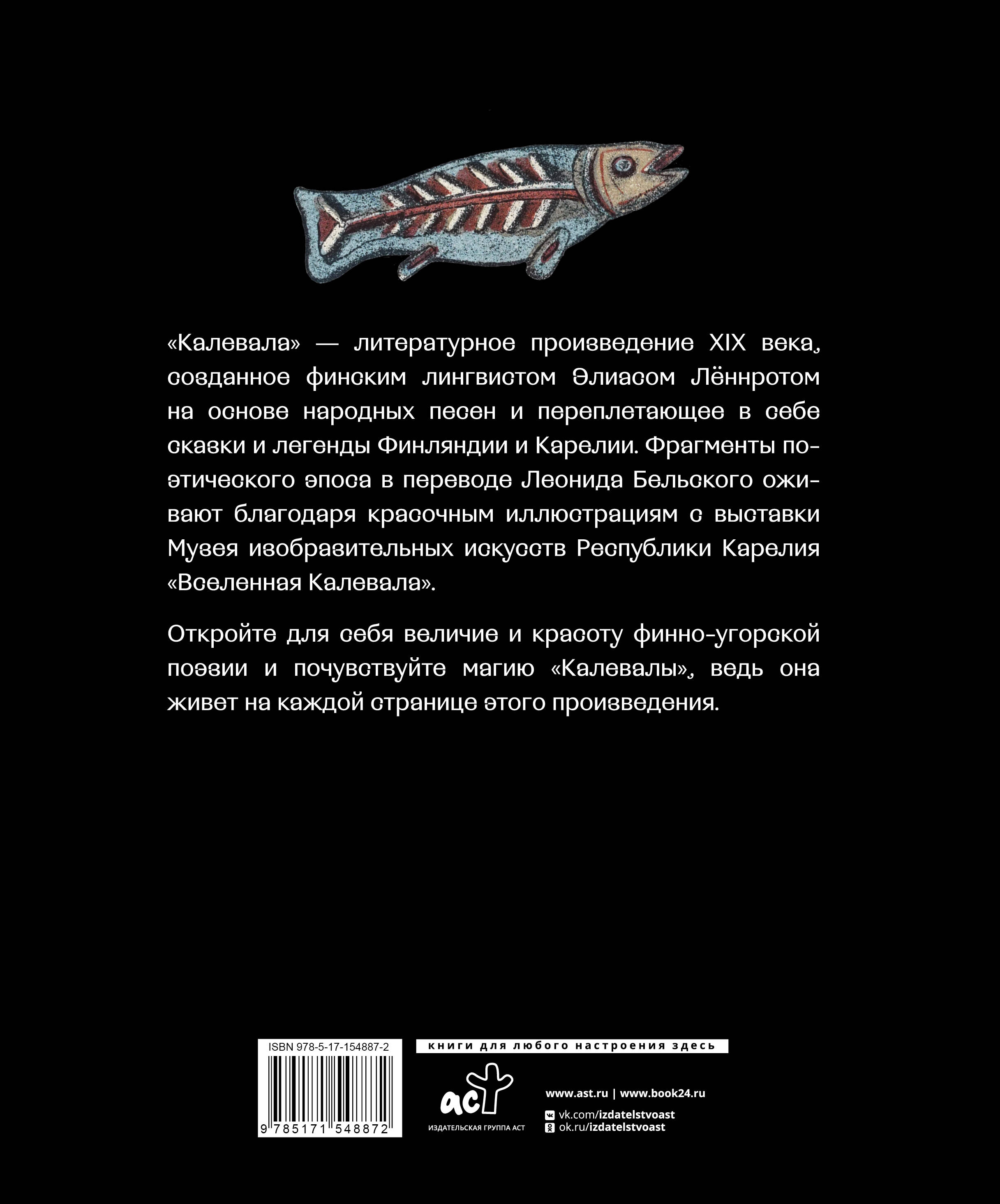Книга представляет собой фрагменты карело-финского поэтического эпоса "Калевала" в переводе Леонида Бельского, сопровождаемые красочными иллюстрациями с выставки Музея изобразительных искусств Республики Карелия "Вселенная Калевала". Это литературное произведение, созданное в XIX веке финским лингвистом Элисом Лённротом на основе народных песен, помимо увлекательного чтения, позволяет погрузиться в волшебный мир сказок и легенд, изучить культуру и историю Финляндии и Карелии, а также проникнуться величием и красотой финно-угорской поэзии.| Издательство | Издательство "АСТ" |