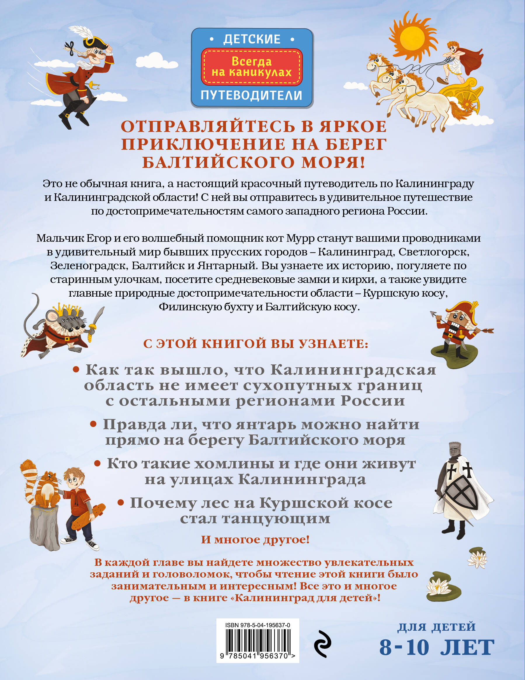 «Калининград для детей» - увлекательная детская книга, которая познакомит юных читателей с удивительными достопримечательностями самого западного региона нашей страны. Мальчик Егор и его волшебный помощник кот Мурр станут вашими проводниками в удивительный мир некогда прусских городов Кёнигсберга, Раушена, Кранца, Пиллау и Пальмникена, а ныне российских Калининграда, Светлогорска, Зеленоградска, Балтийска и Янтарного. Вы узнаете их историю, погуляете по старинным улочкам, посетите средневековые замки и кирхи, а также увидите главные природные достопримечательности области - Куршскую косу, Филинскую бухту и Балтийскую косу. Описания достопримечательностей сопровождаются яркими иллюстрациями и фотографиями, что поможет юным читателям лучше представить себе каждое место. В книге не только рассказывается о красоте и значимости этих мест, но и приводятся интересные факты, легенды и исторические события, связанные с каждым из них. Книга стимулирует детское воображение и любознательность, позволяя маленьким читателям узнать много нового о регионе. А интерактивные задания будут очень полезными и увлекательными. Издание подготовлено с учетом всех санитарно-технических требований и абсолютно безопасно для детей.| Издательство | ООО "Издательство "Эксмо" |