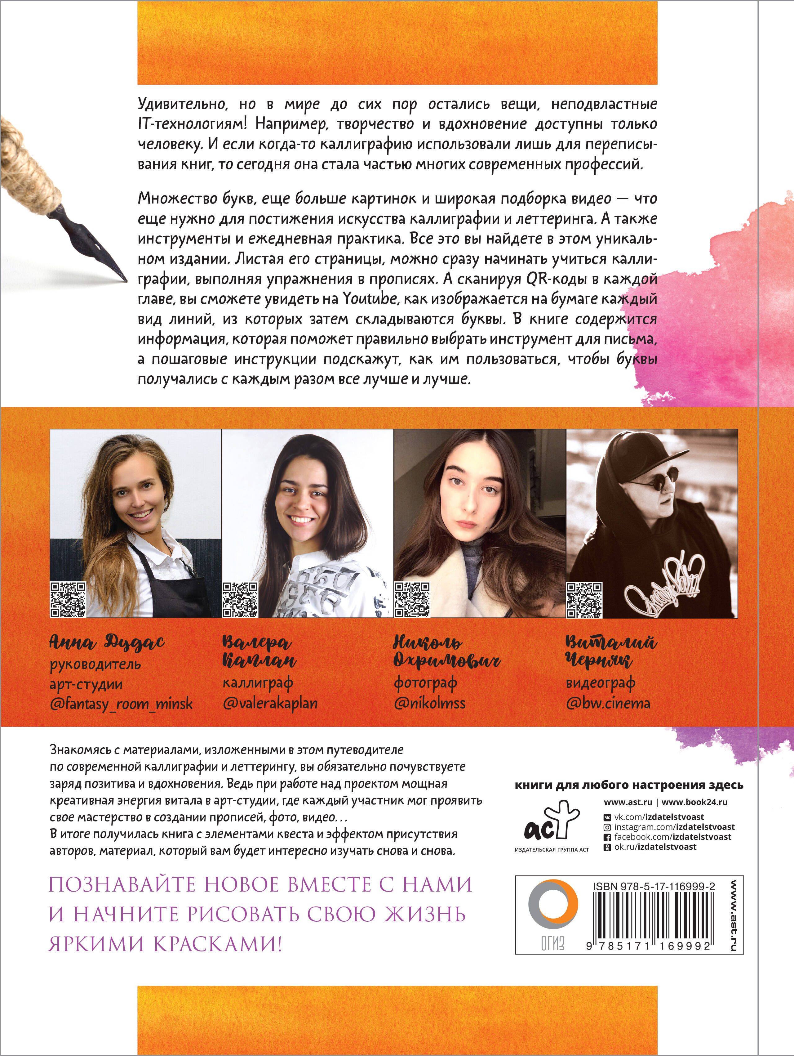 Перед вами книга о современном искусстве каллиграфии и леттеринга, в которой настоящие профессионалы своего дела наглядно демонстрируют, как изменить и украсить мир, просто рисуя буквы. В издании приведено большое количество прописей с образцами букв, принадлежащими к разным алфавитам и выполненными в разных шрифтах. Обучиться техникам их написания помогут специальные видео, которые можно посмотреть, сканируя QR-коды на страницах. Книга вдохновит на создание уникальных авторских шрифтов, новых художественных композиций и революционных концепций леттеринга. Идеи, изложенные здесь, пригодятся не только художникам, но и всем творческим людям, работа которых связана с индивидуальным и креативным подходом в различных областях - рекламе, производстве визиток или печати журналов, дизайне помещений, фэшн-индустрии и других.| Издательство | ИЗДАТЕЛЬСТВО "АСТ" |