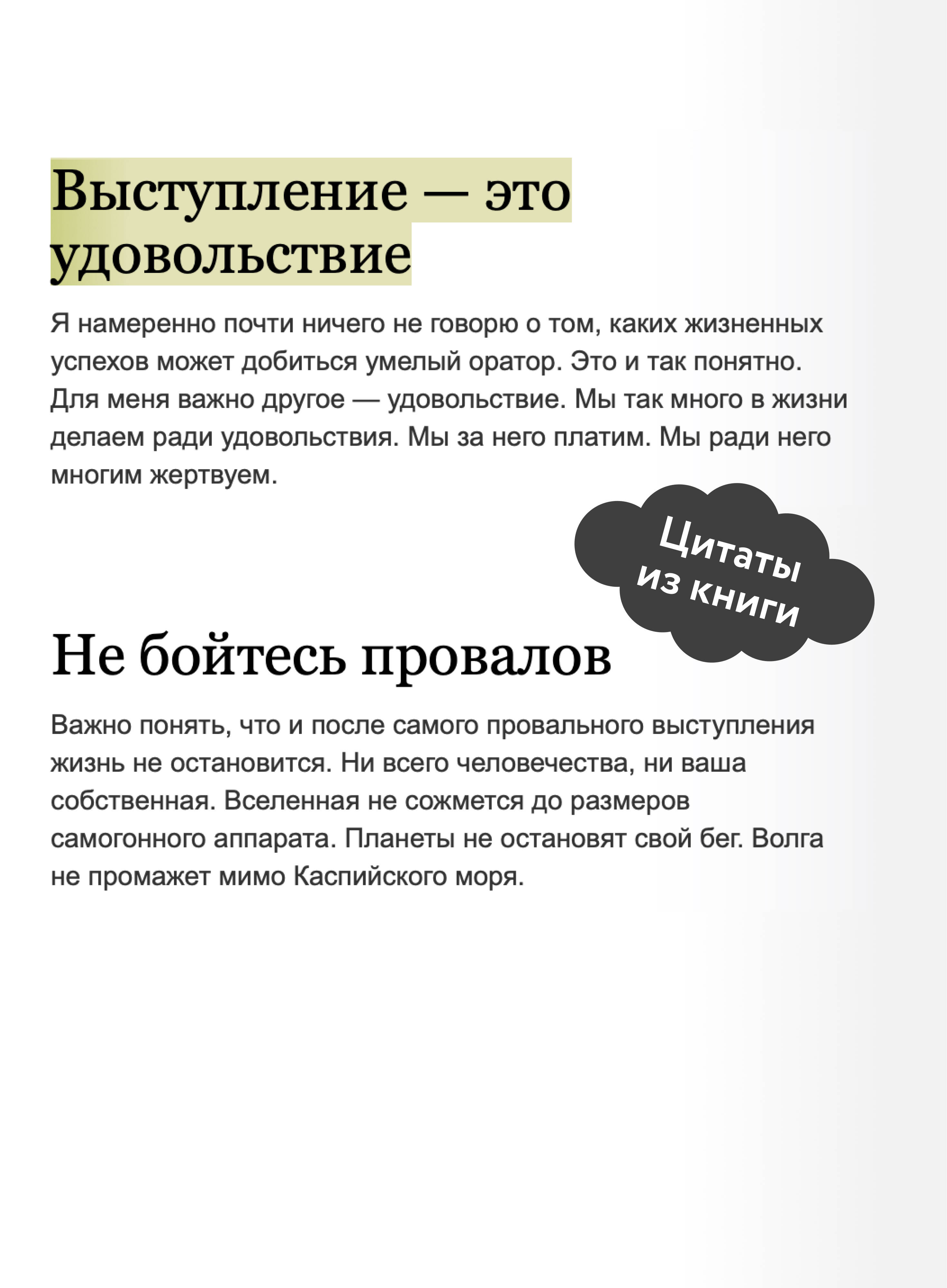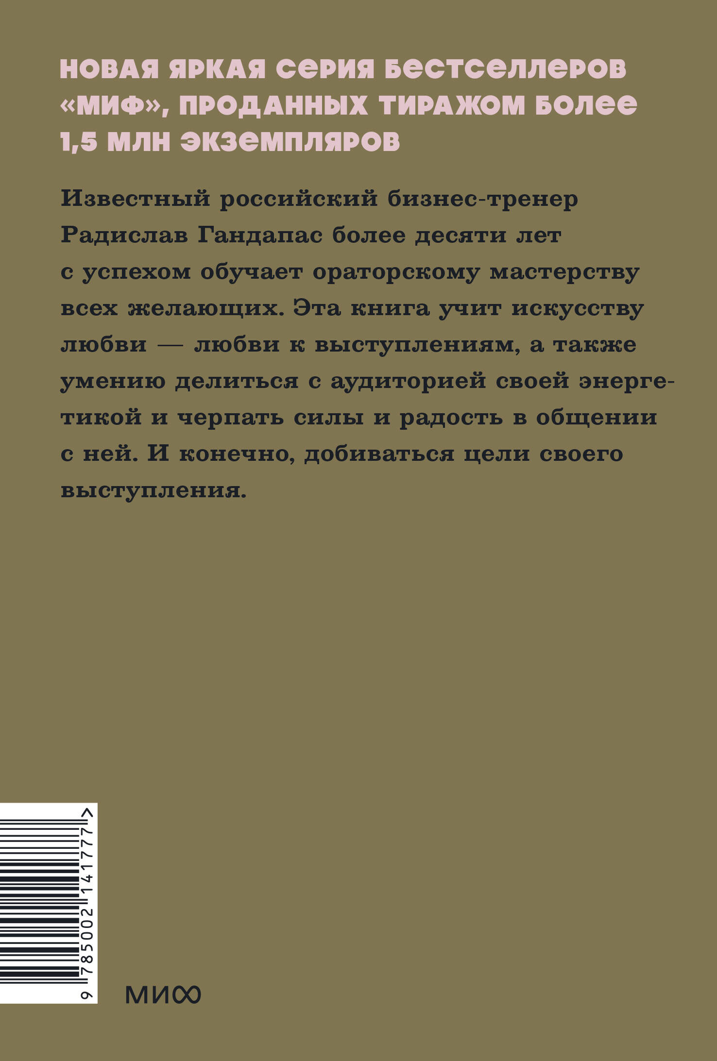 Книга известного российского бизнес-тренера Радислава Гандапаса, которая научит вас не просто перестать бояться публичных выступлений, но и получать от них настоящее удовольствие. "Завтра выскажете эту идею на встрече с клиентами". "Выйдите к ним и объясните, почему мы не можем повысить зарплату". "Завтра вы выступаете на совете директоров". "А теперь попросим к трибуне начальника!". Публичные выступления сродни кошмарному сну для многих, вне зависимости от пола, возраста и опыта. Тем не менее большинству из нас регулярно приходится произносить речи перед той или иной аудиторией. Удачное выступление может изменить судьбу отдельного проекта или ход истории, но кроме этого оно должно доставлять удовольствие и аудитории, и самому оратору. Известный российский бизнес-тренер Радислав Гандапас более десяти лет с успехом обучает ораторскому мастерству всех желающих. В этой книге он делится секретами обольщения публики и учит искусству любви - любви к выступлениям, а также умению делиться с аудиторией своей энергетикой и черпать силы и радость в общении с ней. И конечно, добиваться цели своего выступления. Читатель научится управлять вниманием слушателей, подавлять собственное волнение, грамотно структурировать выступление и держать зрительный контакт. Почему мы решили издать эту книгу: Потому что хорошо знаем, какое влияние на слушателей может оказать классное выступление. И хотим, чтобы как можно больше людей раскрыли в себе этот потенциал. Для кого эта книга: Книга рекомендуется тем, кто реализует себя в сферах, связанных с частыми выступлениями, и, несомненно, будет полезна каждому, кто хотел бы перестать бояться говорить на публике и начать наслаждаться этим процессом.